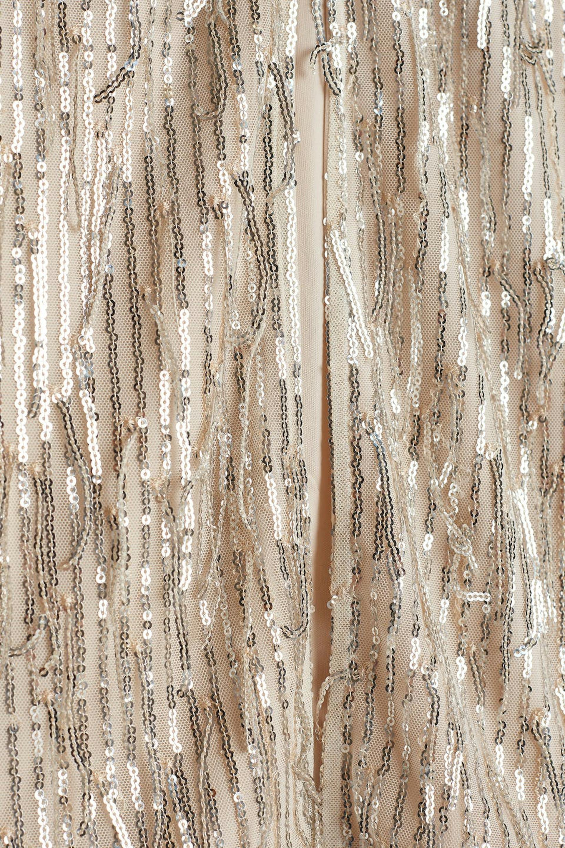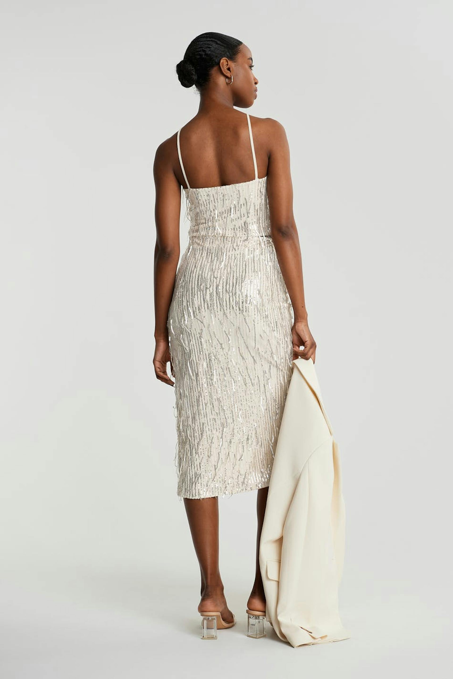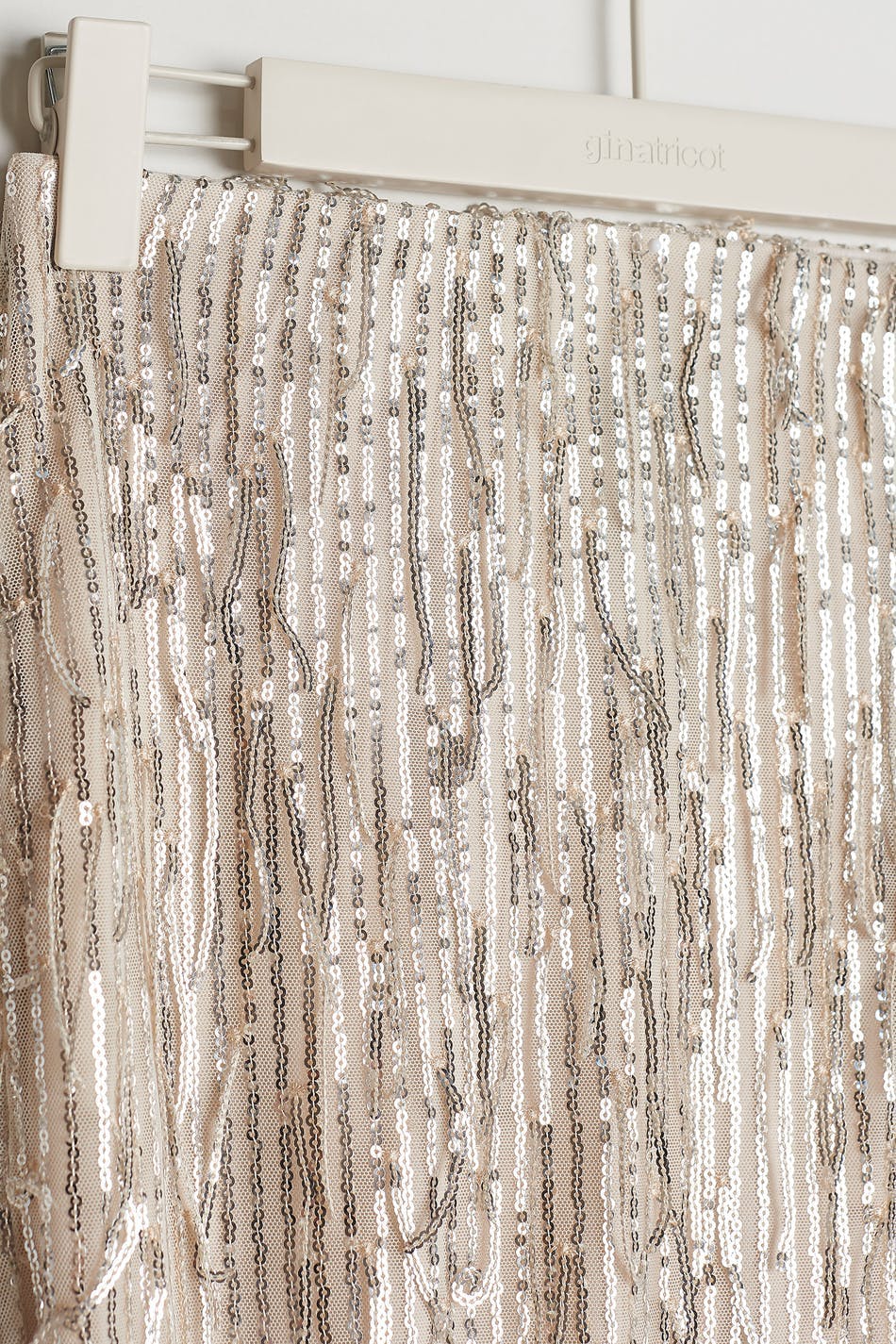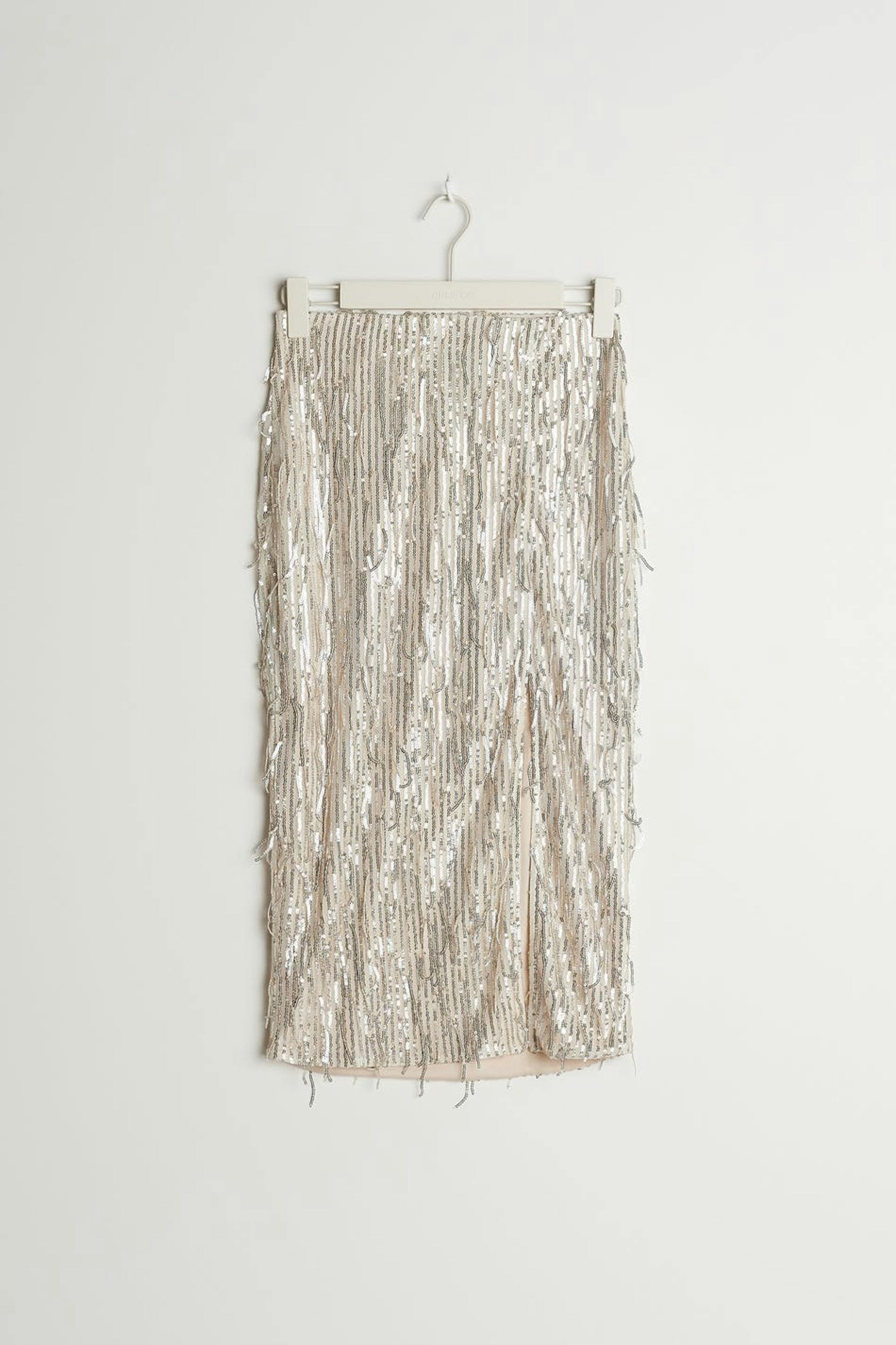 Skirt with sequined fringes. The skirt is perfect for the party and beige and has midi length with a slit at the front. It has an elastic at the waist.