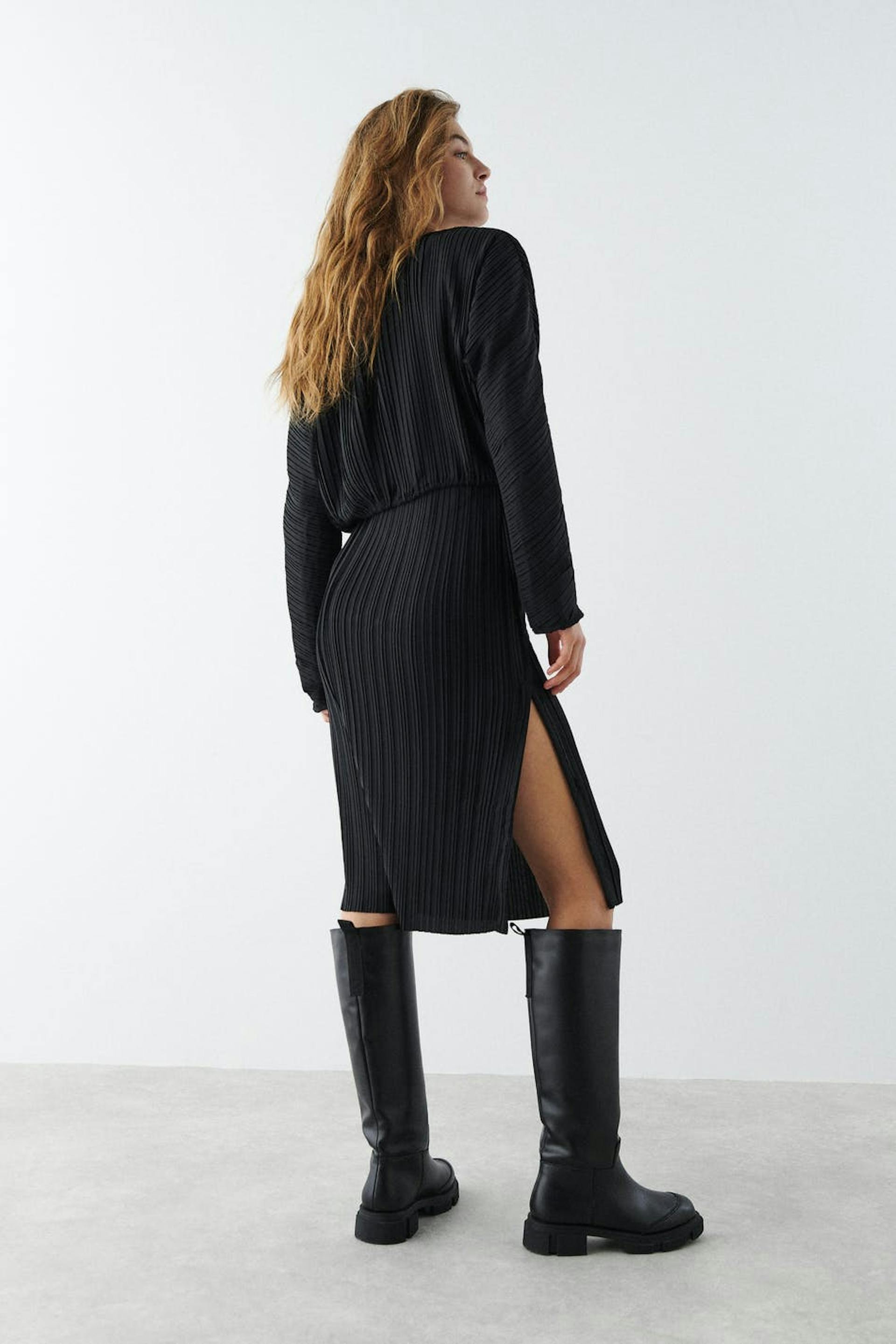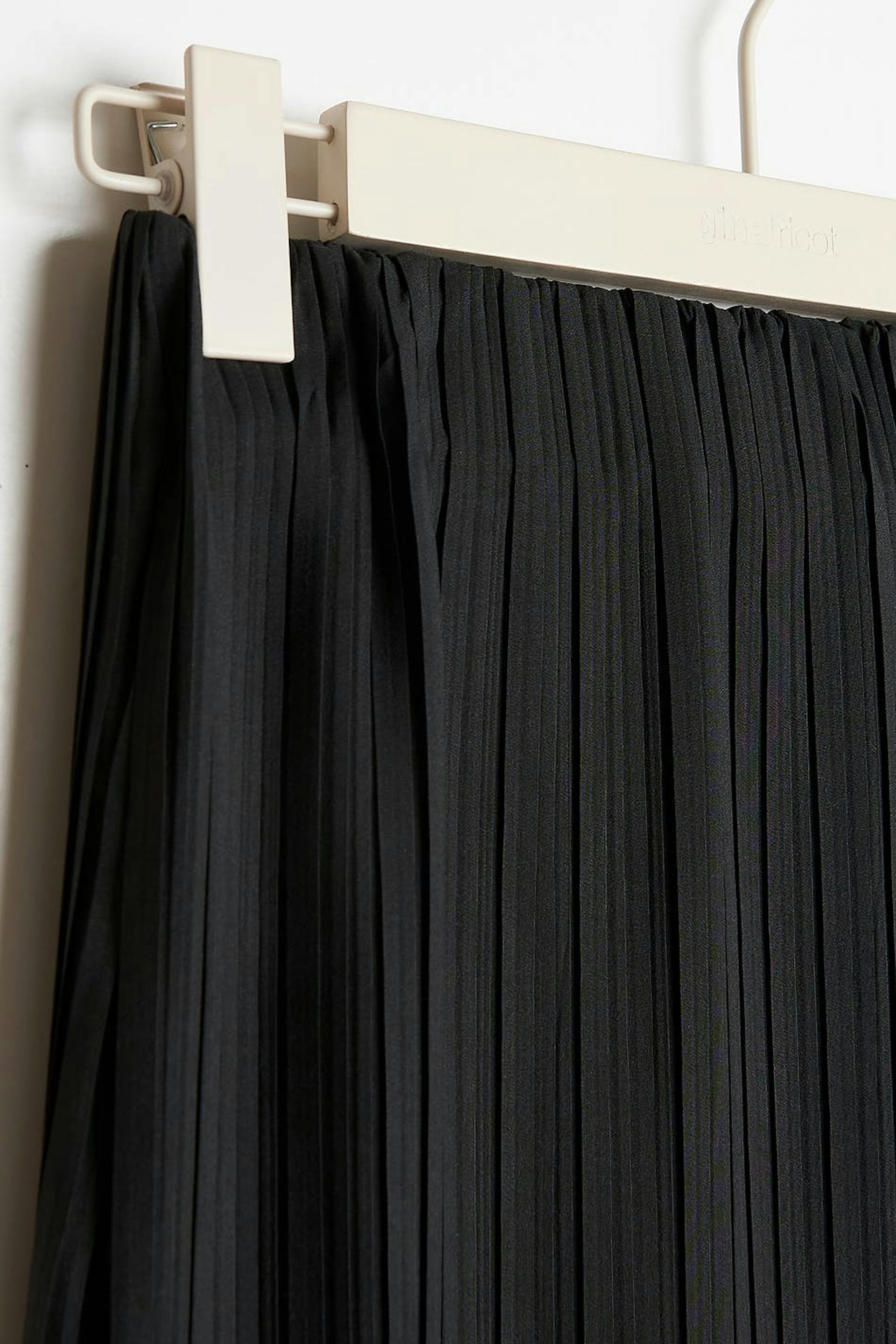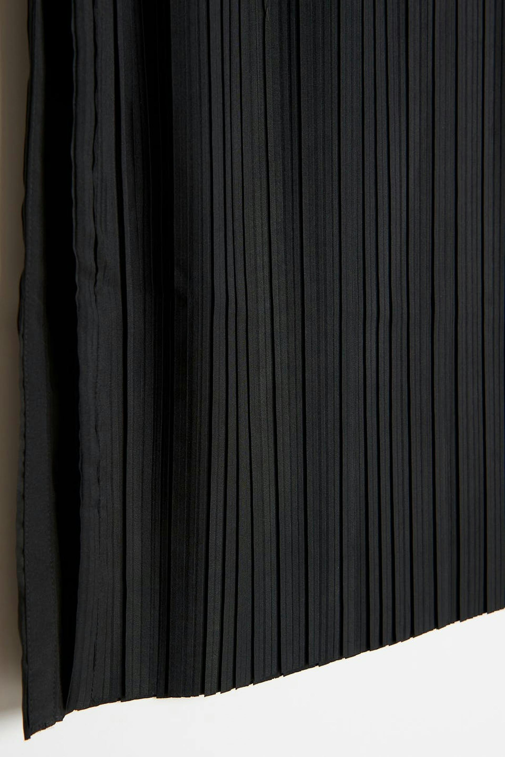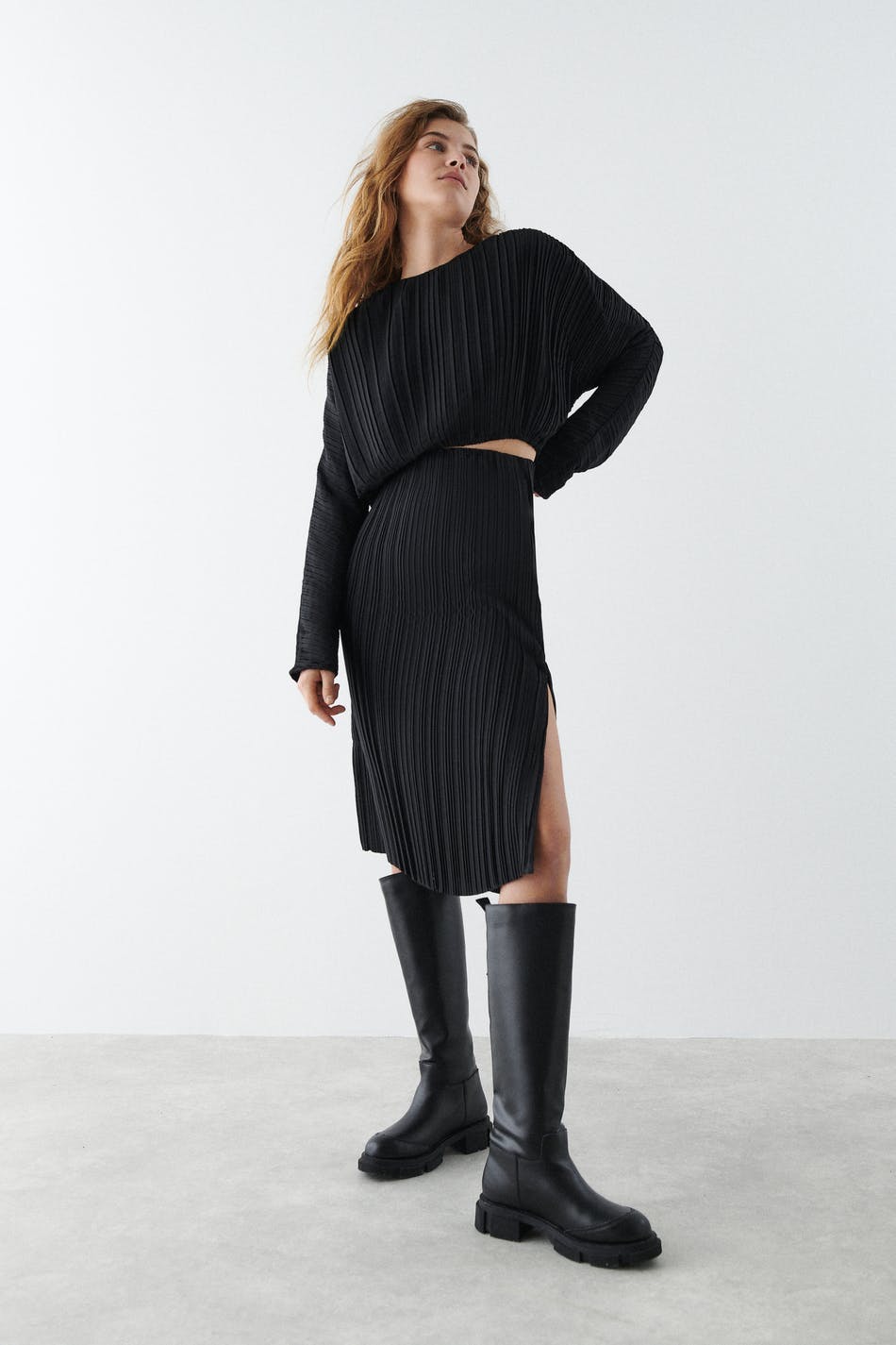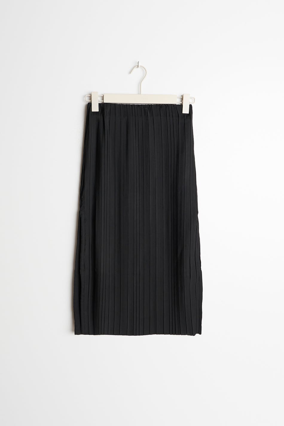 Pleated skirt with slit on the sides. The skirt is black and has a slim fit. It has a hidden elastic at the waist and a midi length.