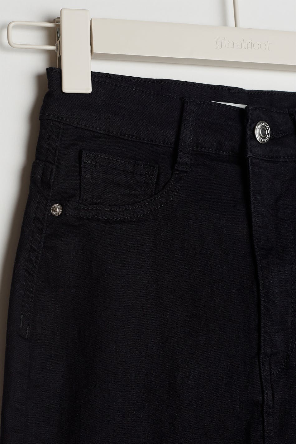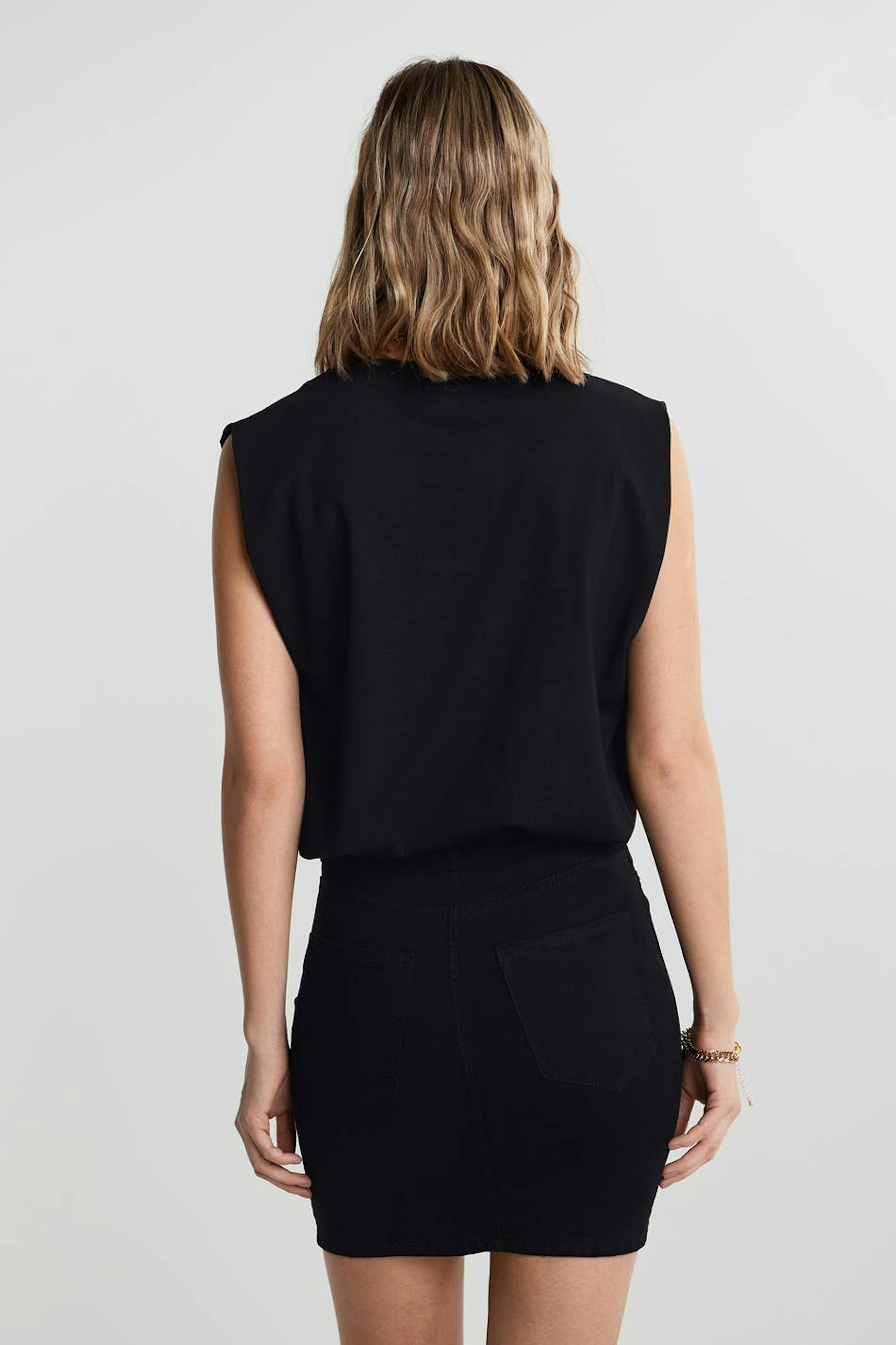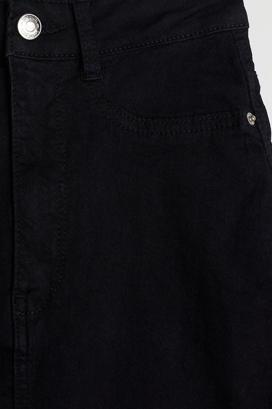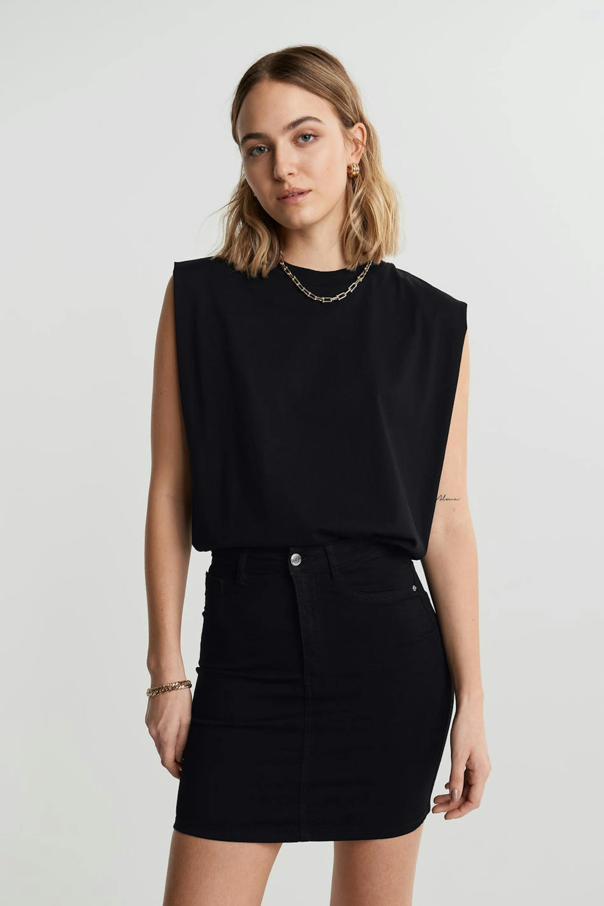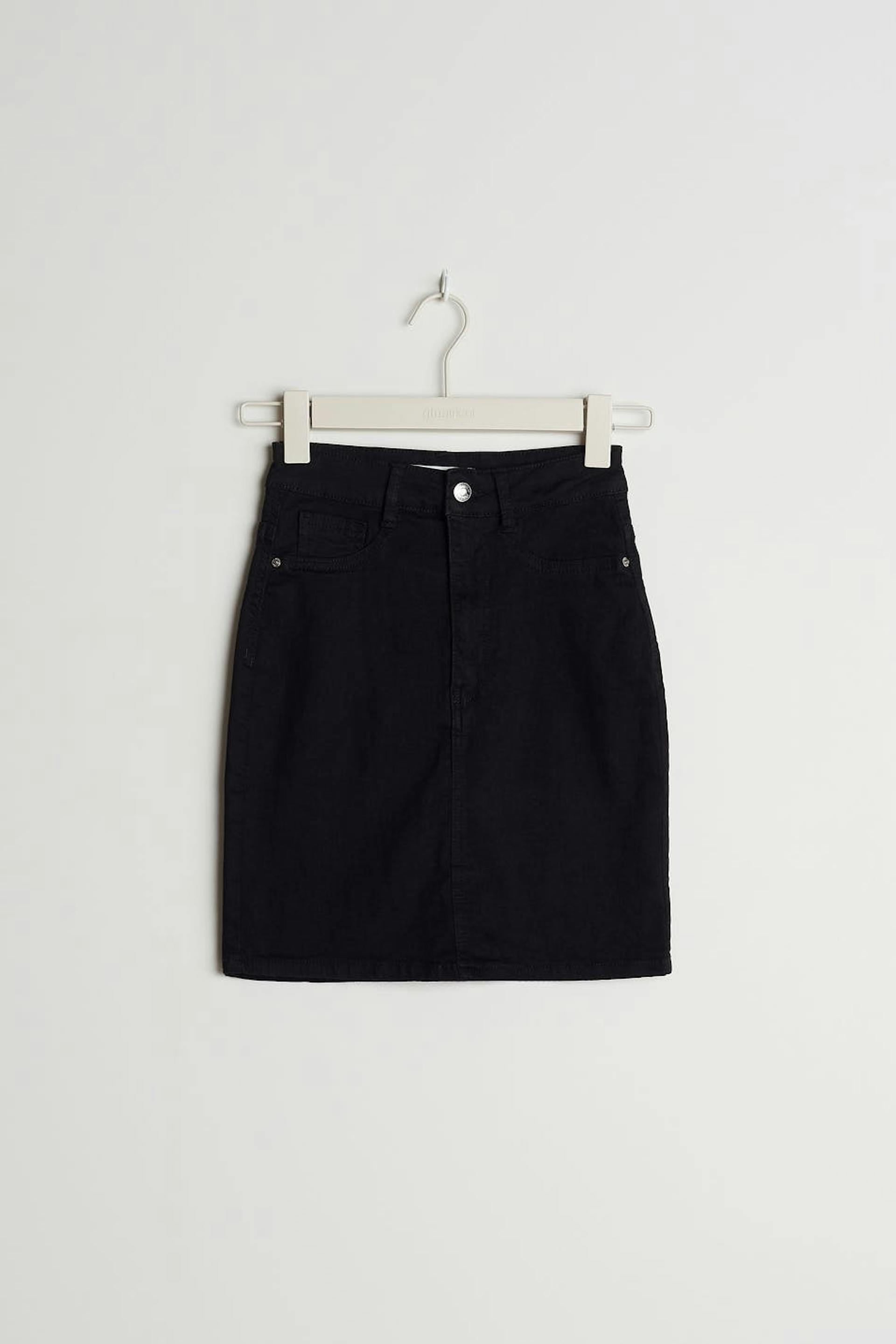 Short denim skirt with a skinny fit. The skirt is black and has a high waist. It is made of denim and has fake pockets on the front and real pockets at the back.