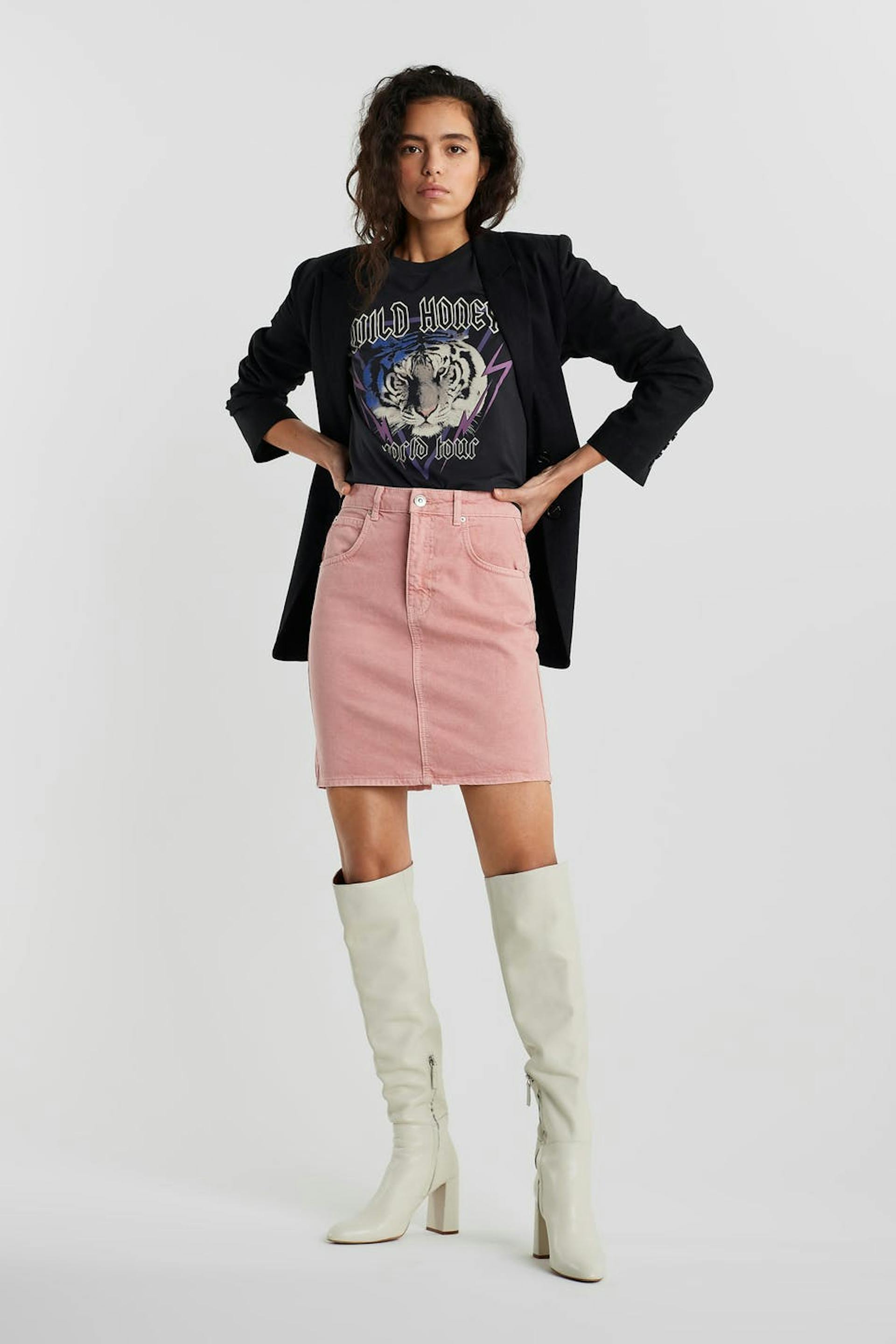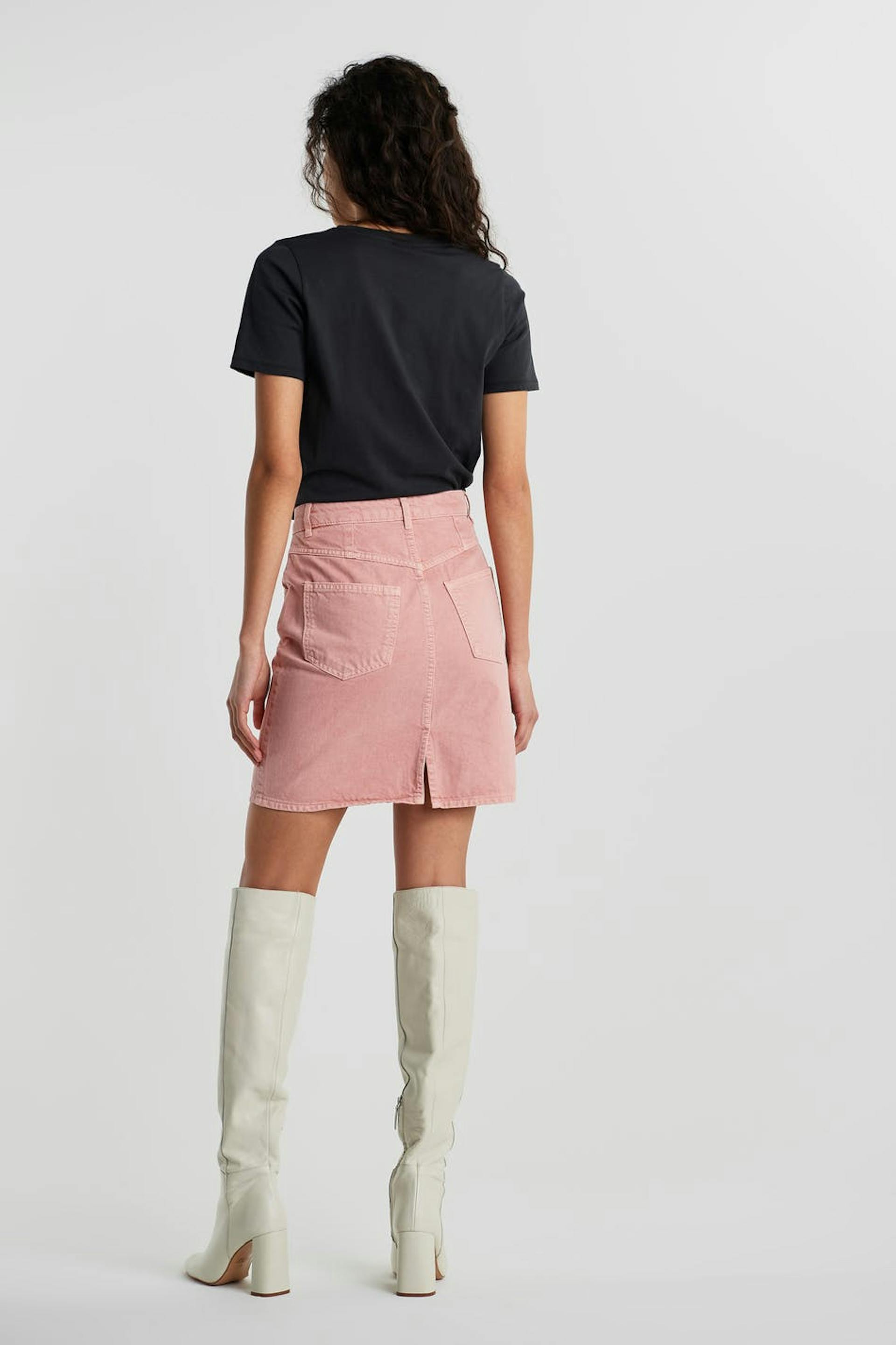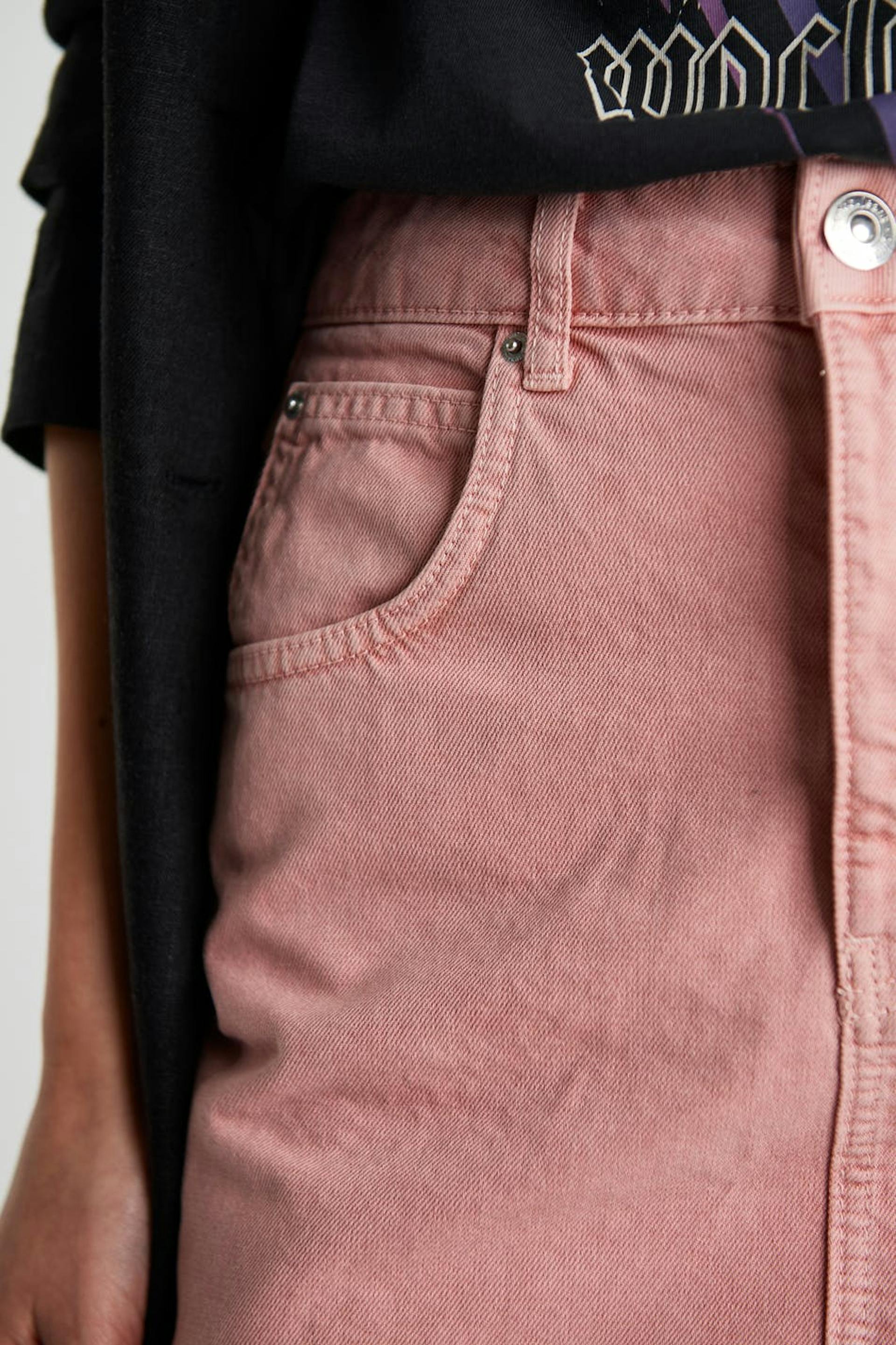 Nonstretch mom denim skirt with a fitted fit. The skirt is pink and has a vintage inspired fit. It has a high waist, high back pockets and a slit at the back.