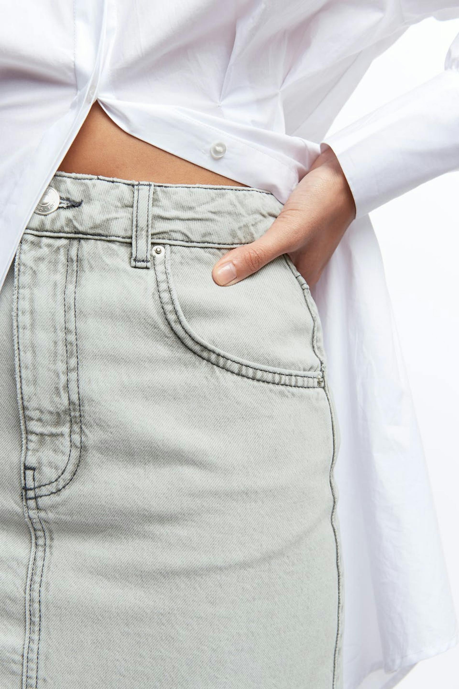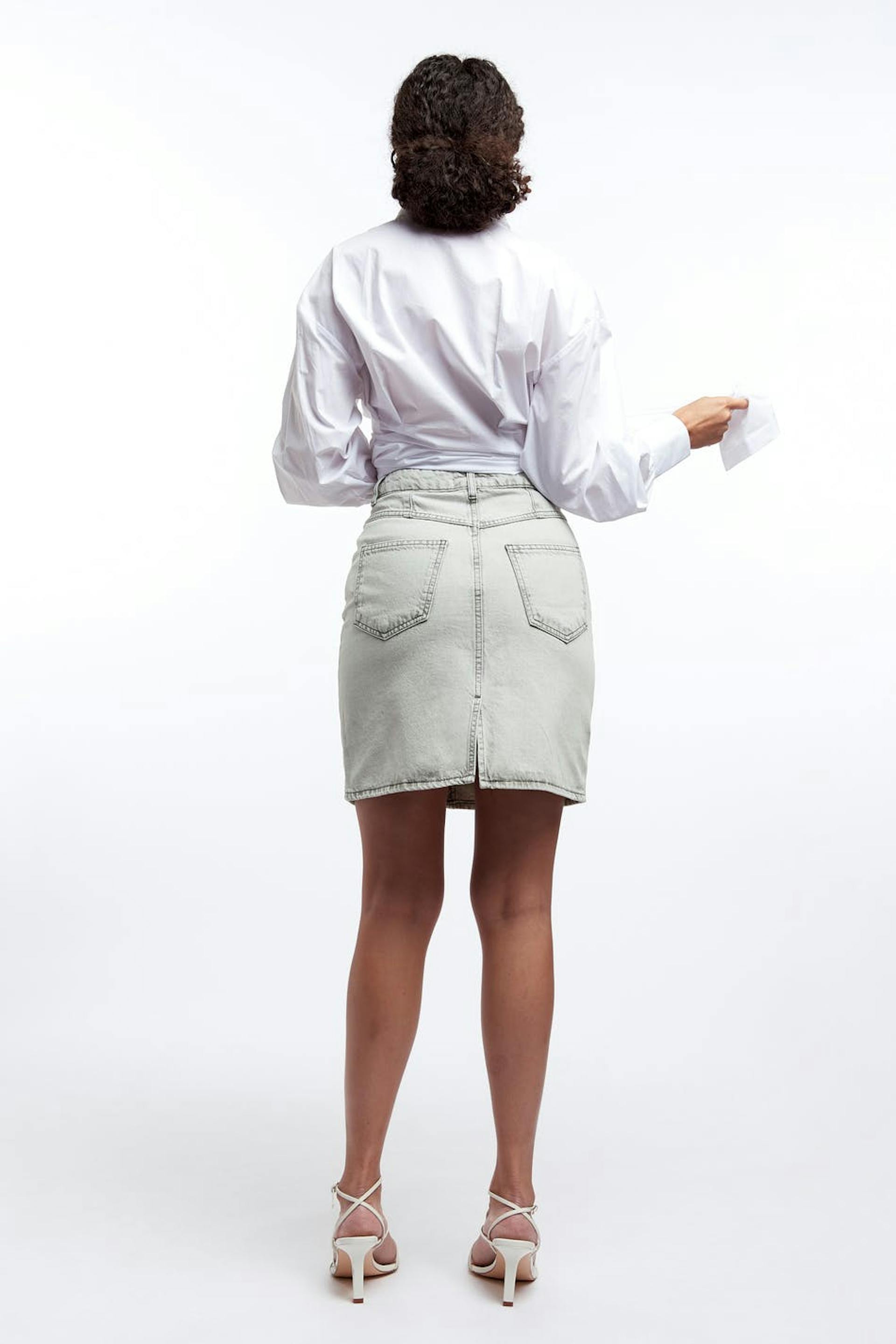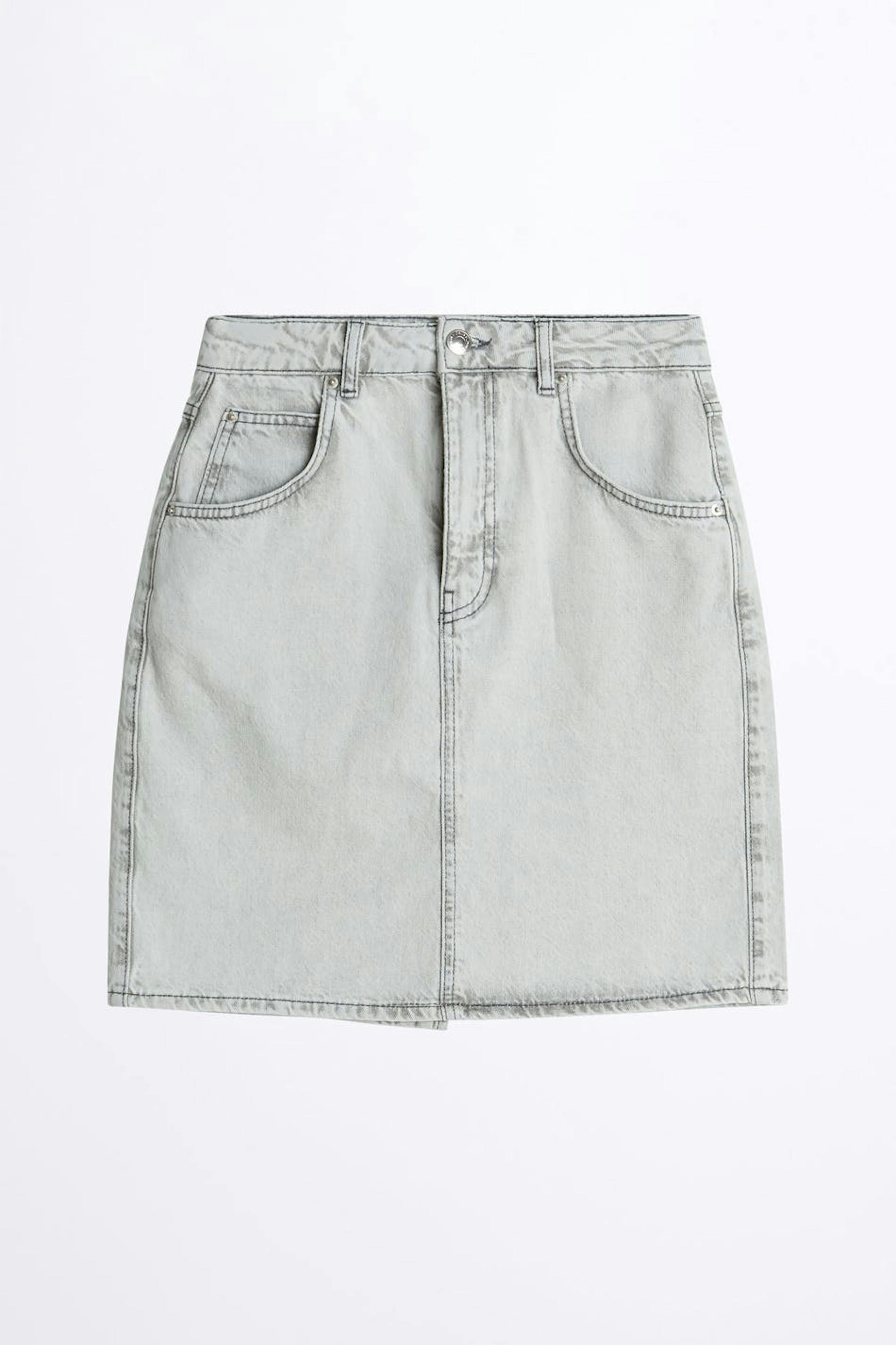 Non-stretch mom denim skirt with a fitted fit. The skirt is grey and has a vintage inspired fit. It has a high waist, high back pockets and a slit at the back.