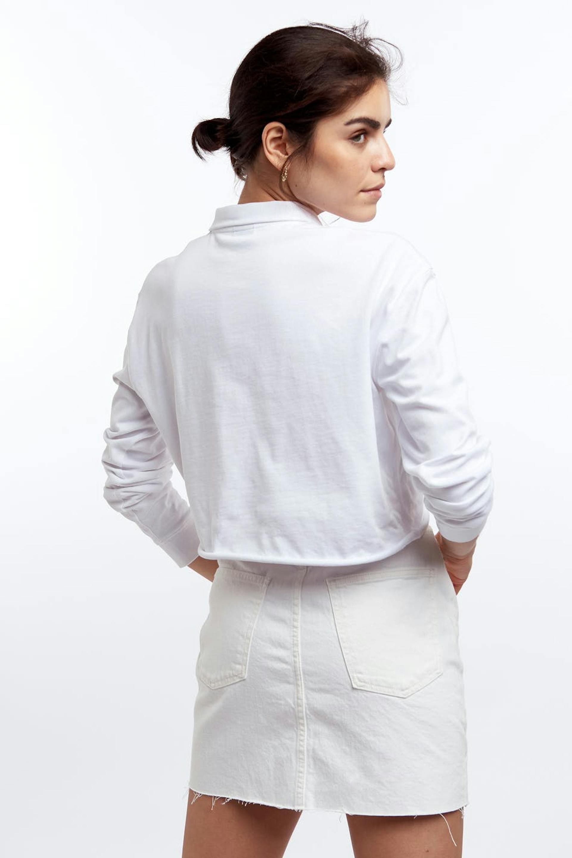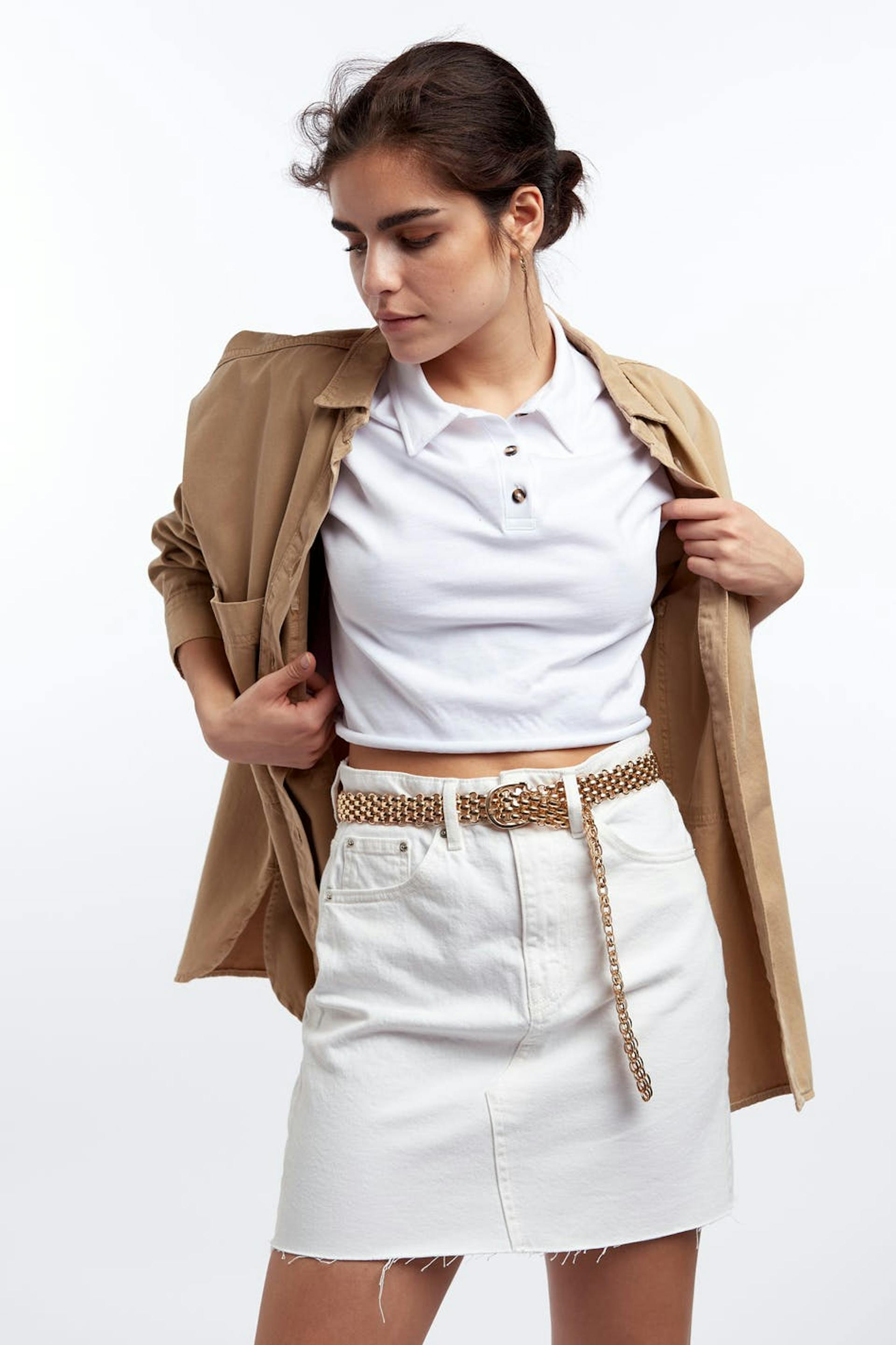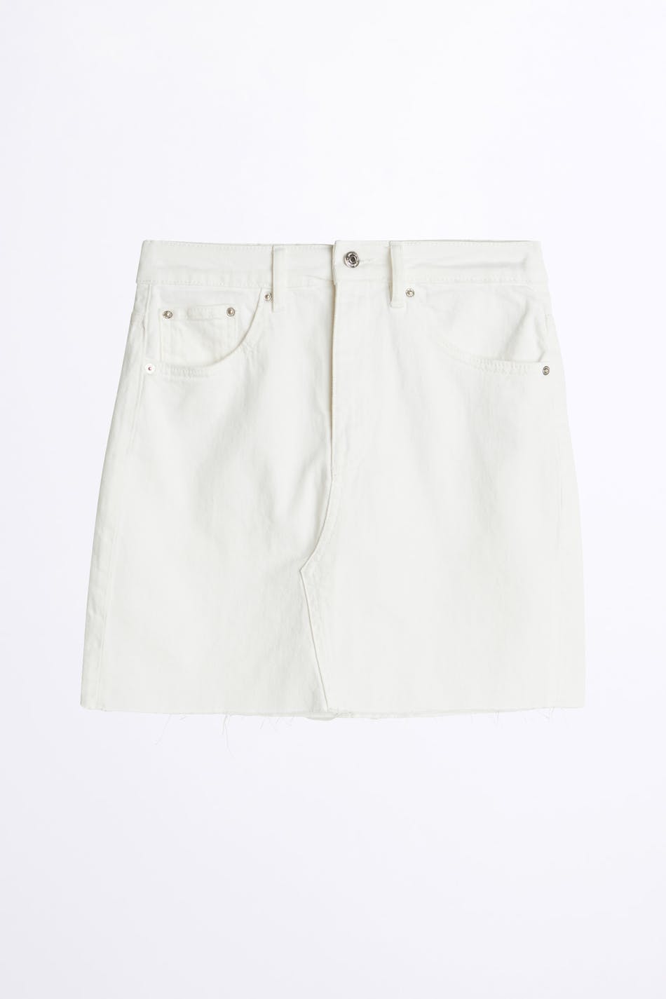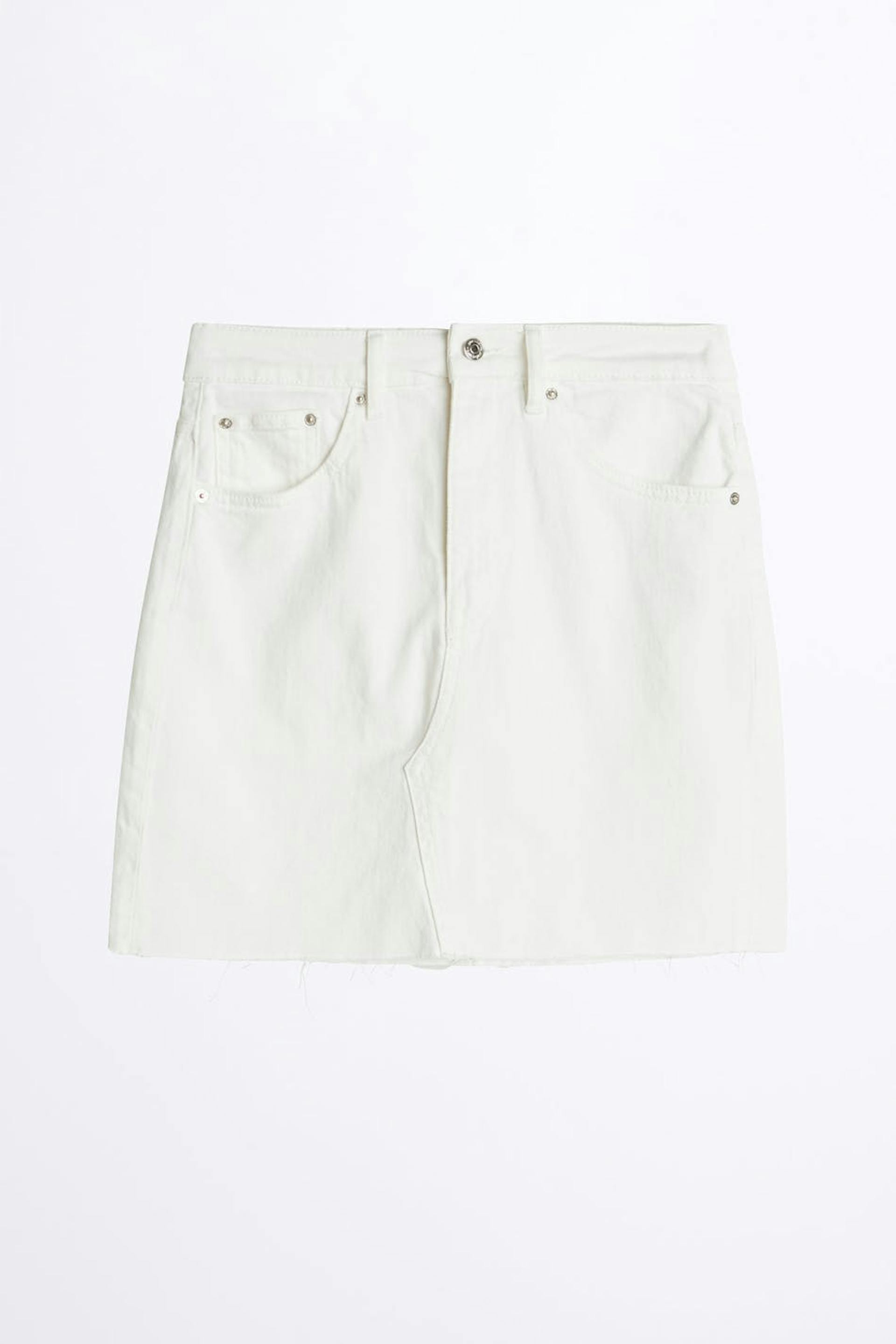 Short denim skirt with a fitted fit. The skirt is white and has a raw hem.