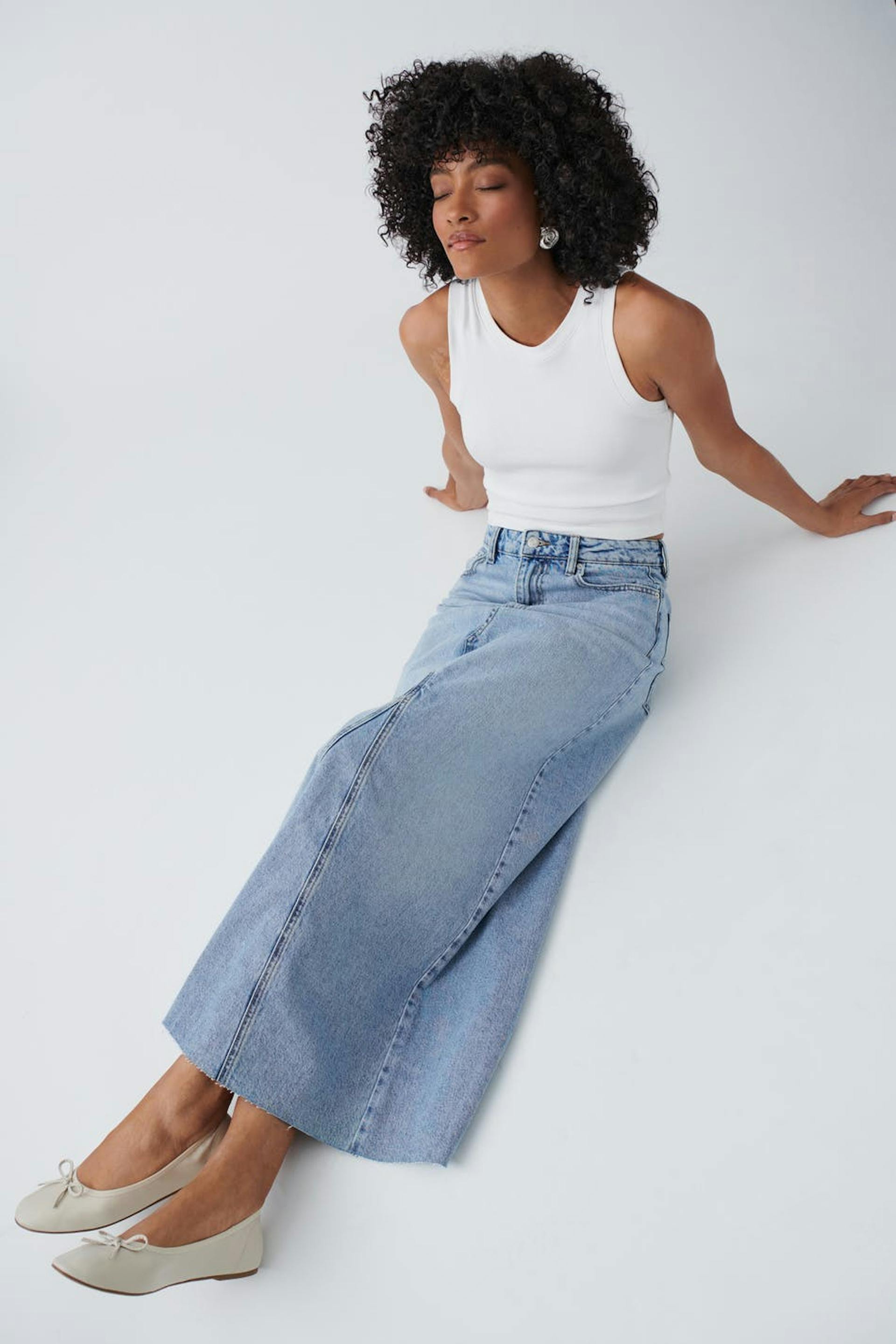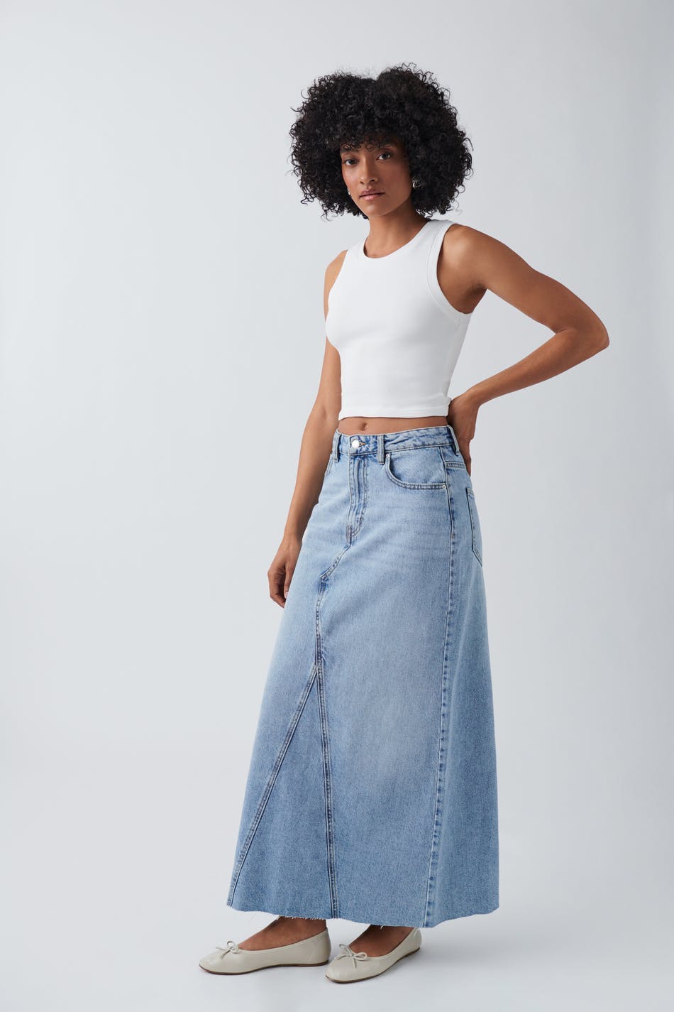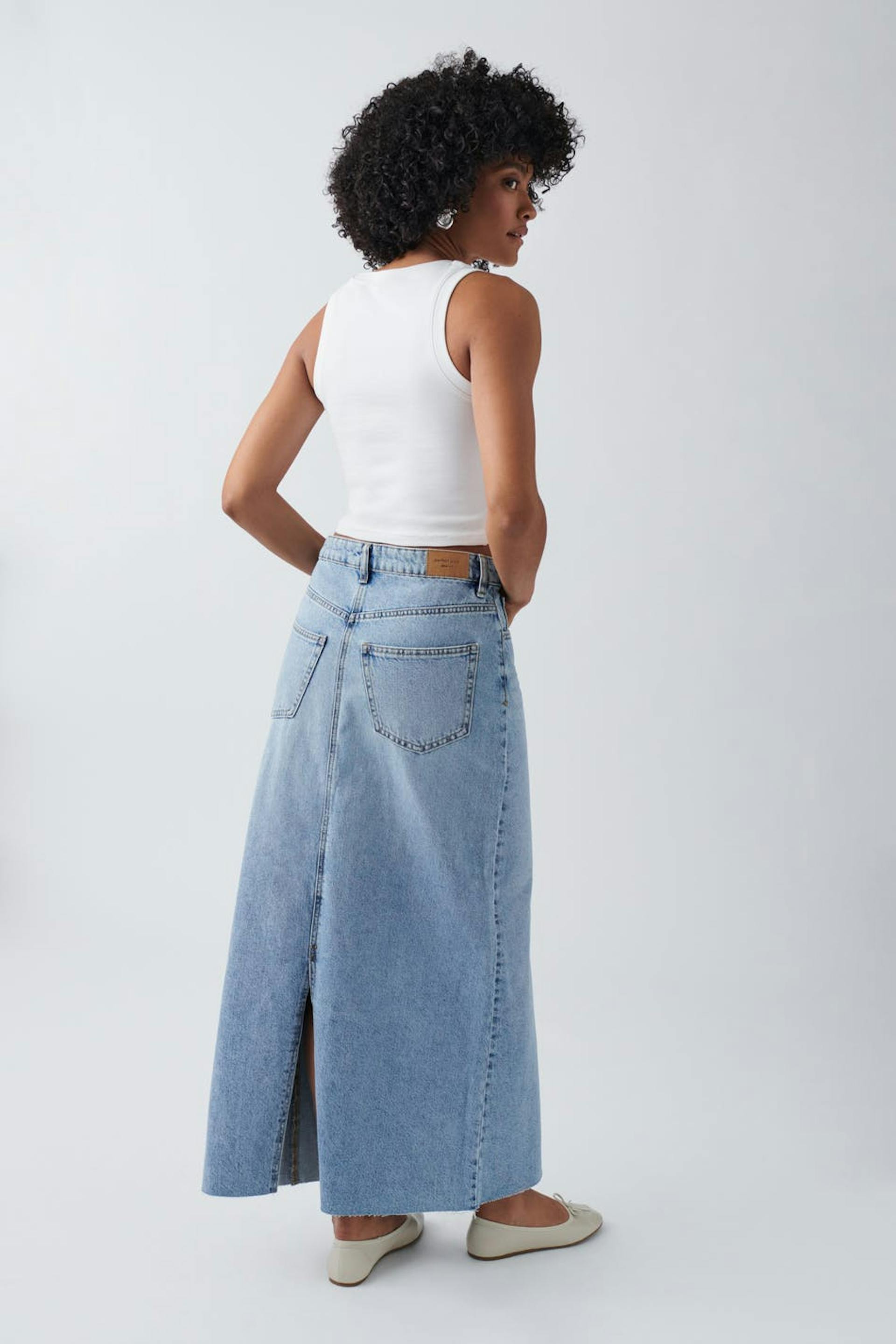 Long denim skirt with mid waist in non-stretch denim. The skirt is blue and has slit at the back. It has zip fly, raw hem and pockets at the front and back.