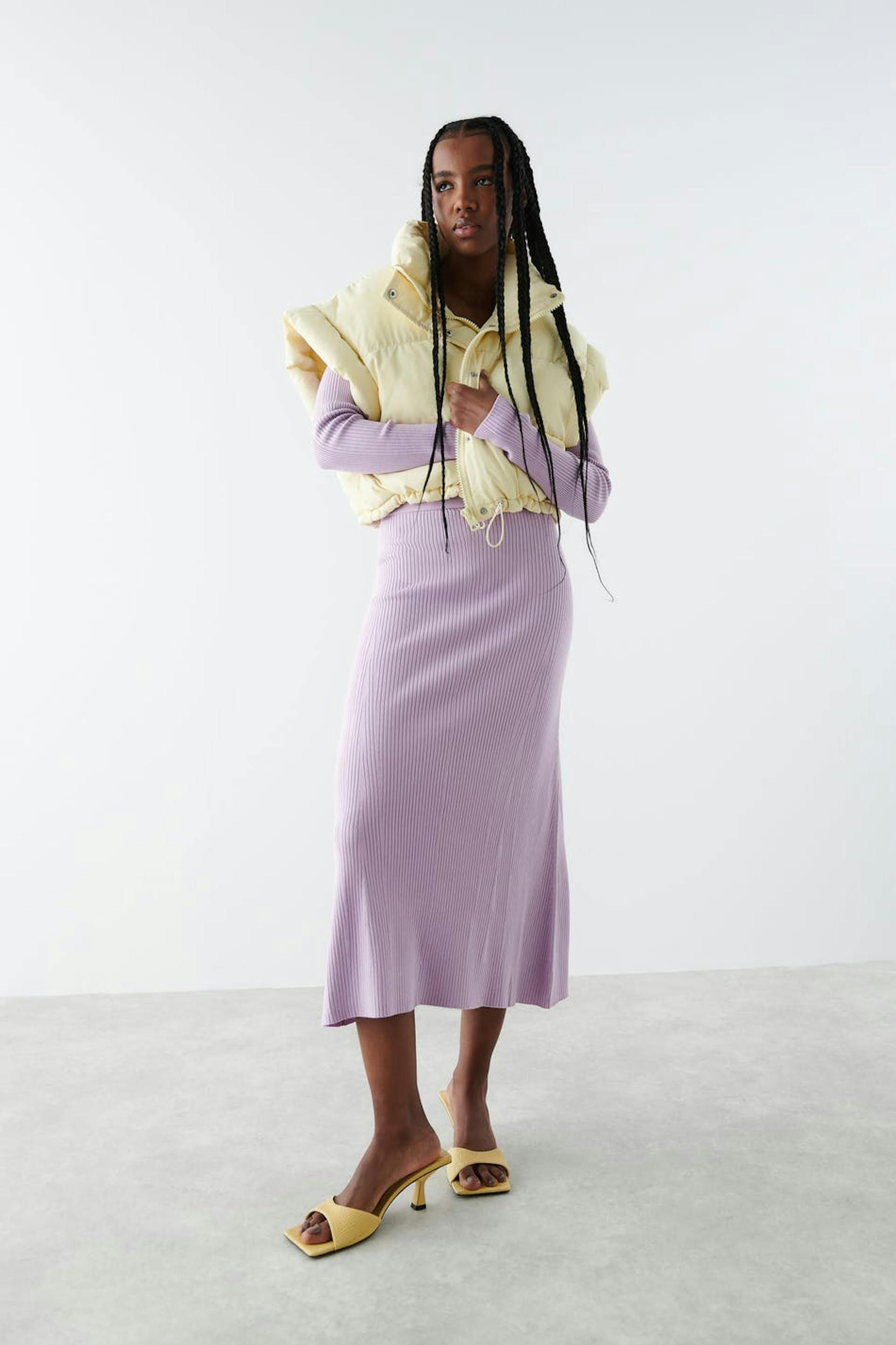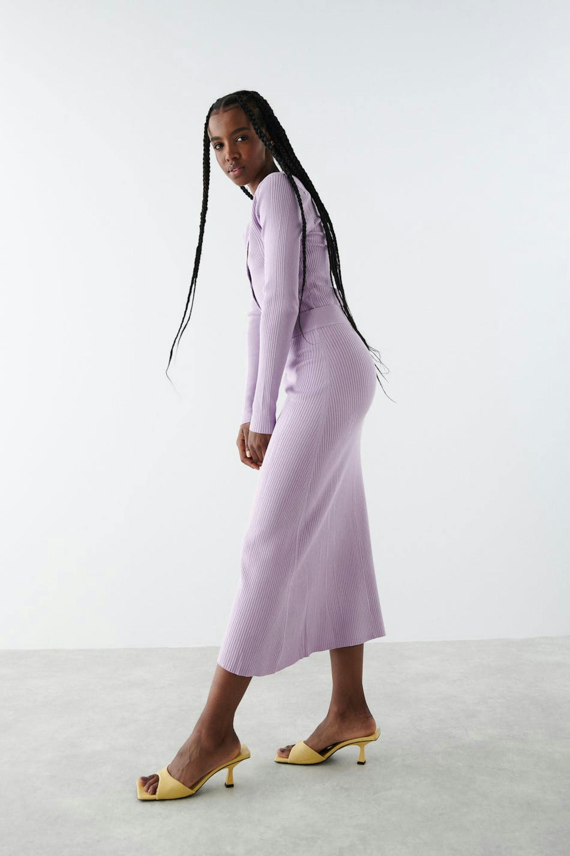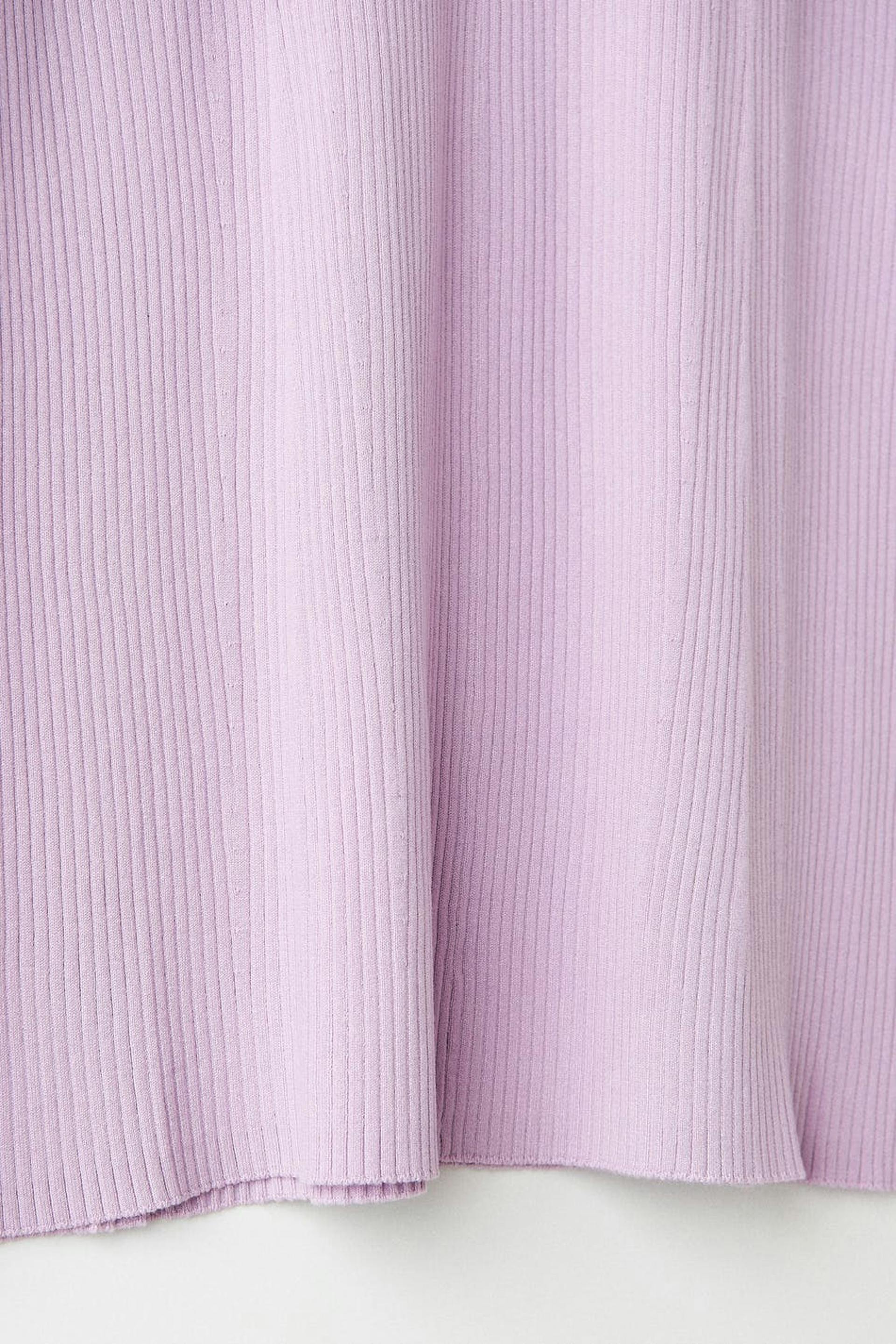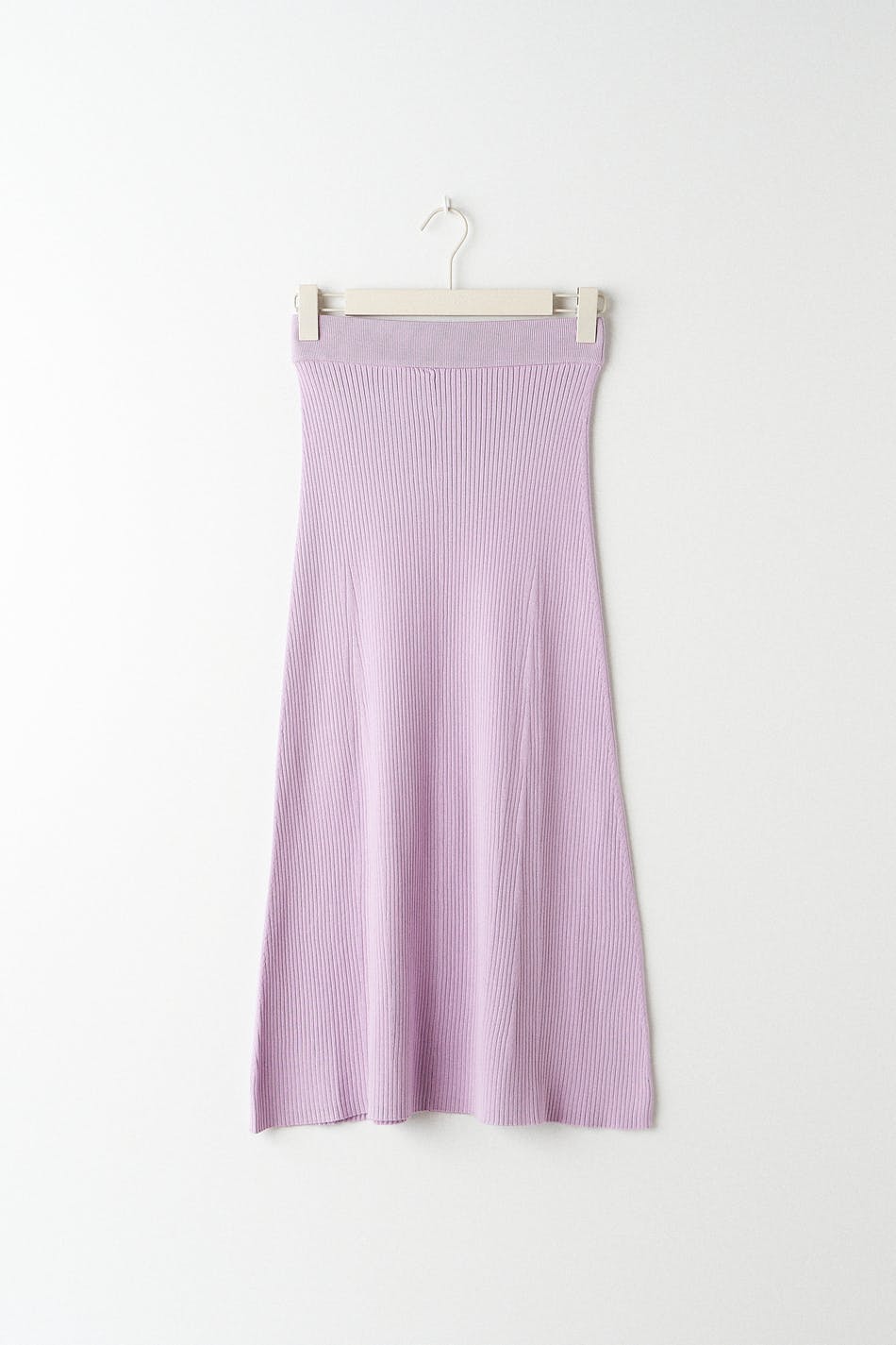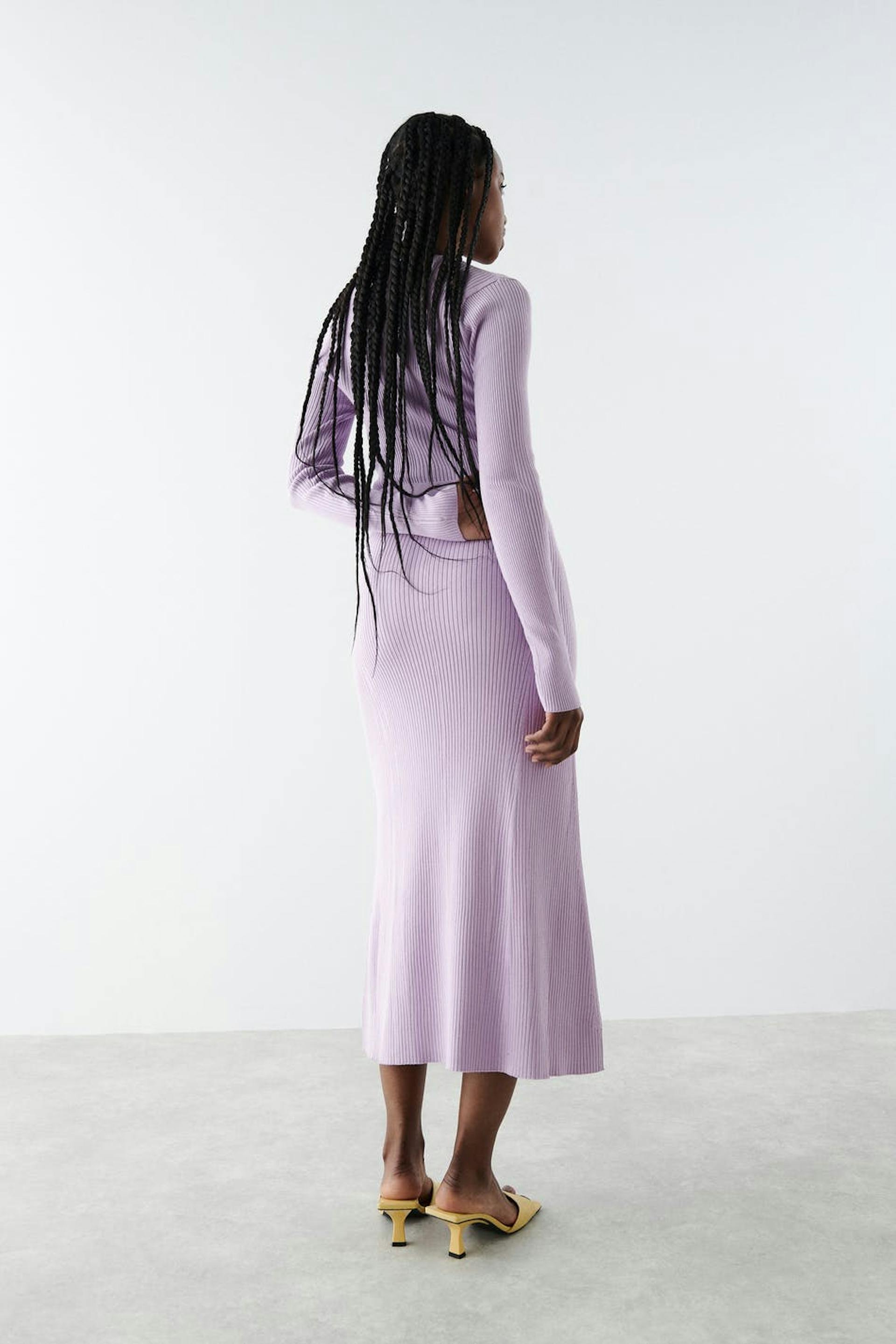 Long skirt with a ribbed quality. The skirt is purple, flared and knitted. It is made of viscose by EcoVero™ and has an elastic at the waist and midi length.