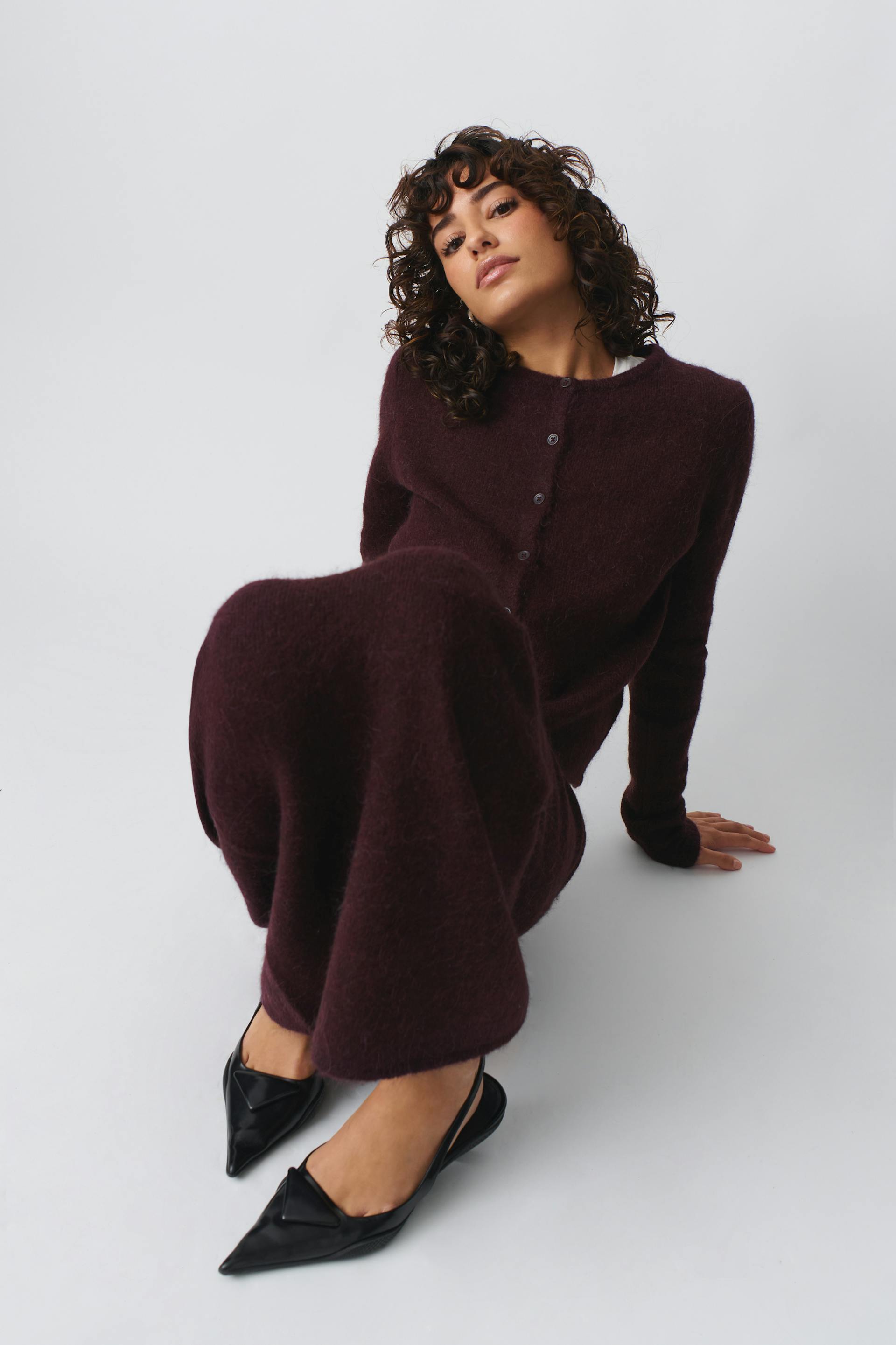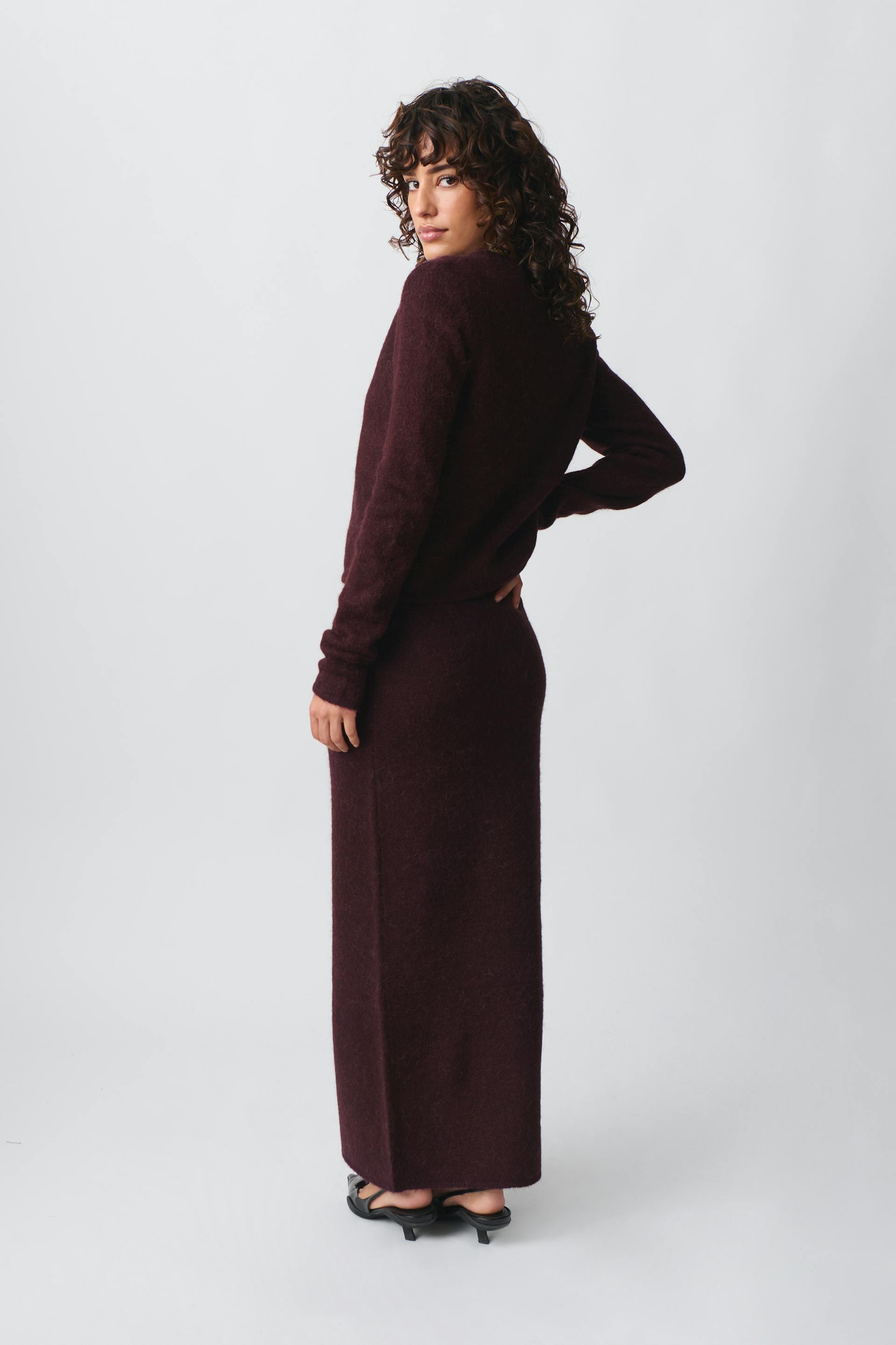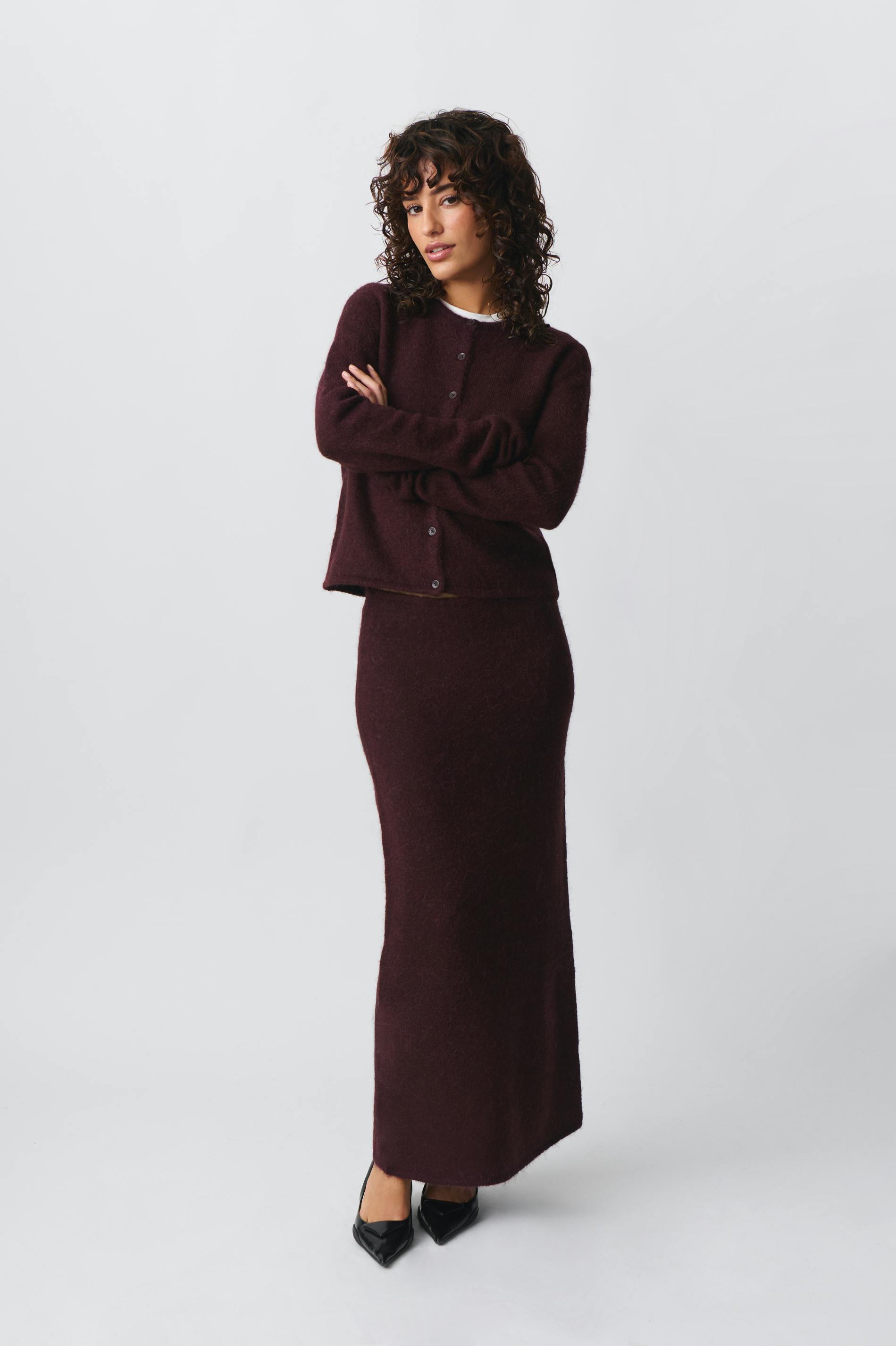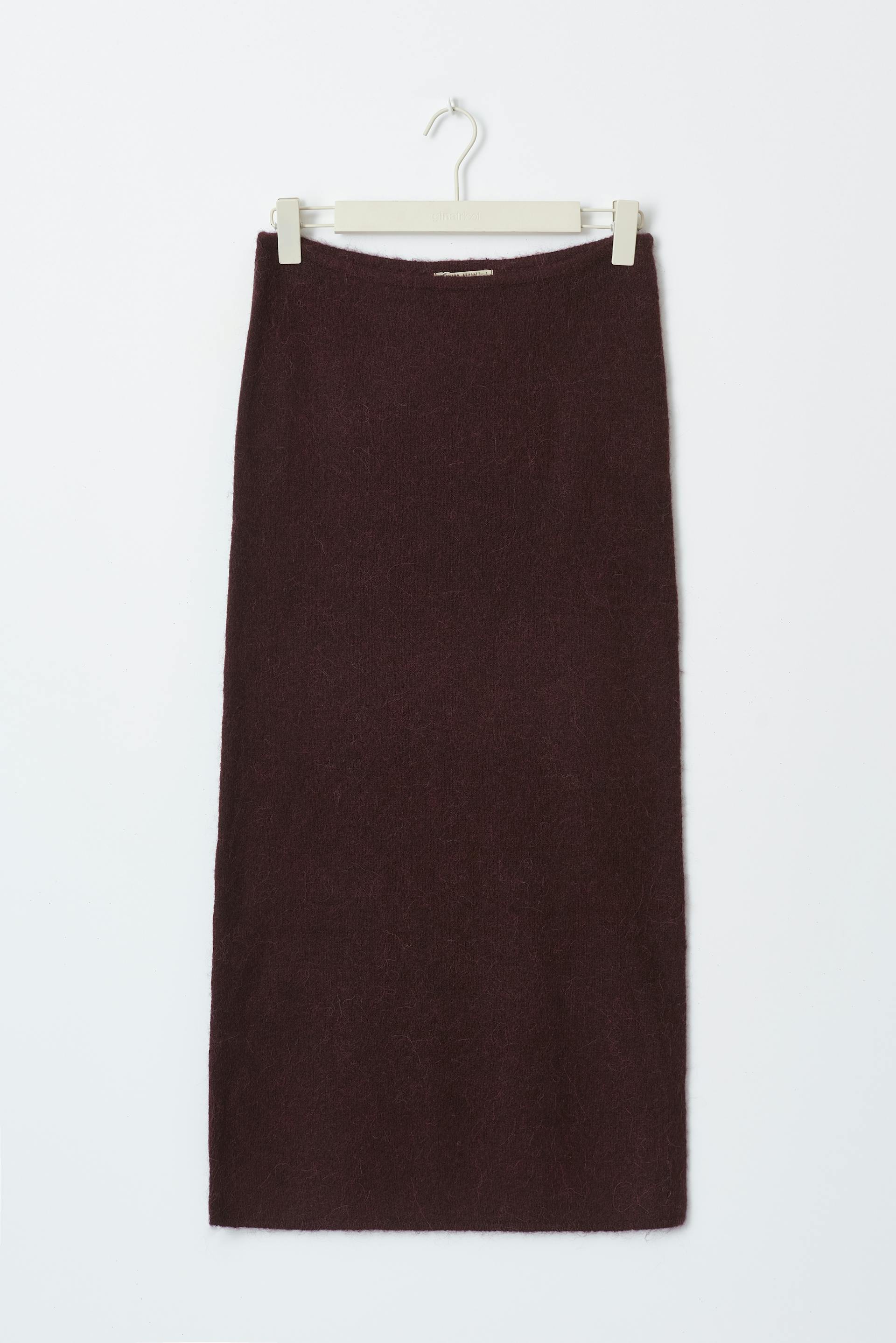 Knitted maxi skirt with figure-hugging fit. The skirt is wine and has soft quality. It has elastic at the waist.