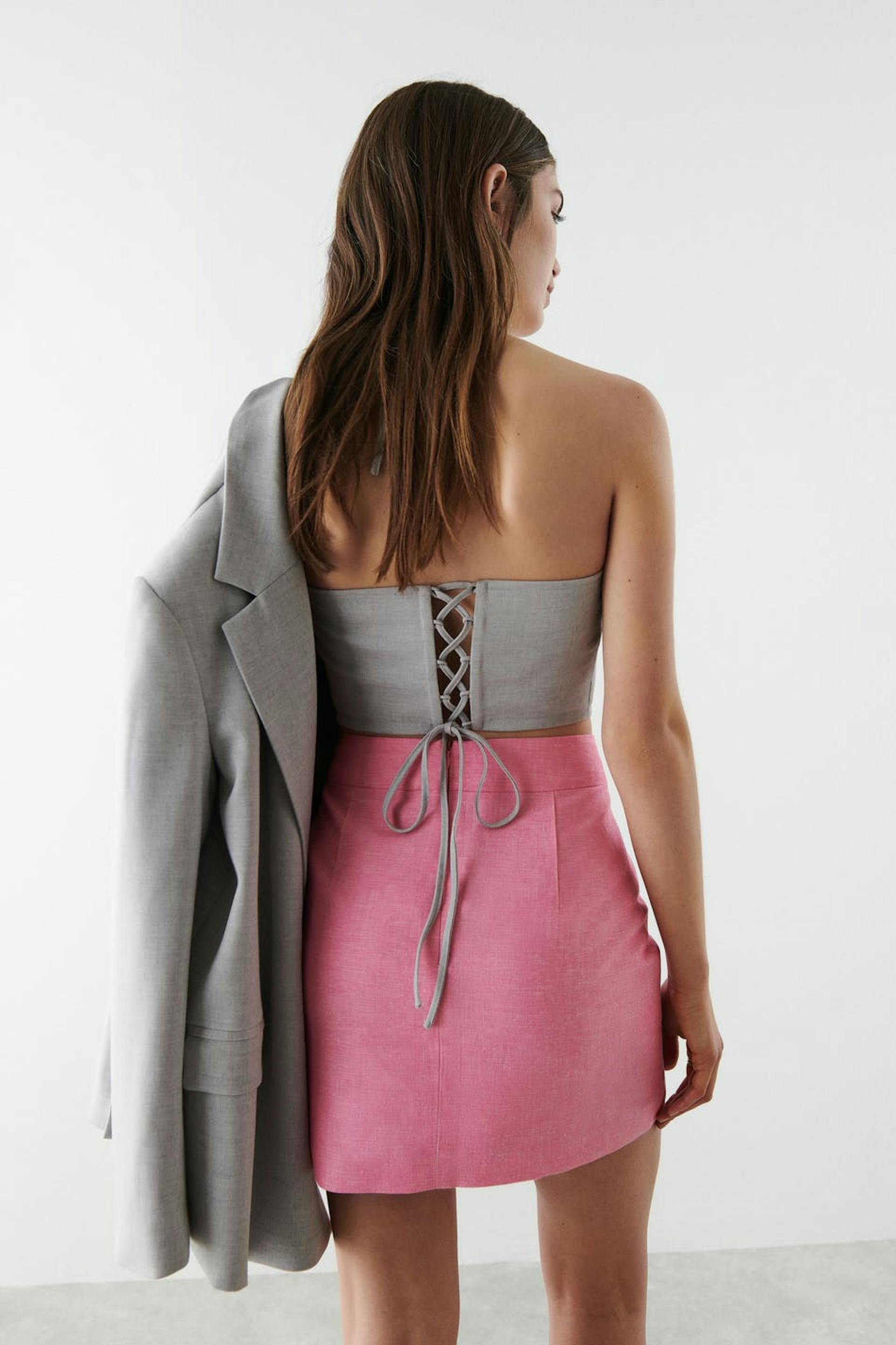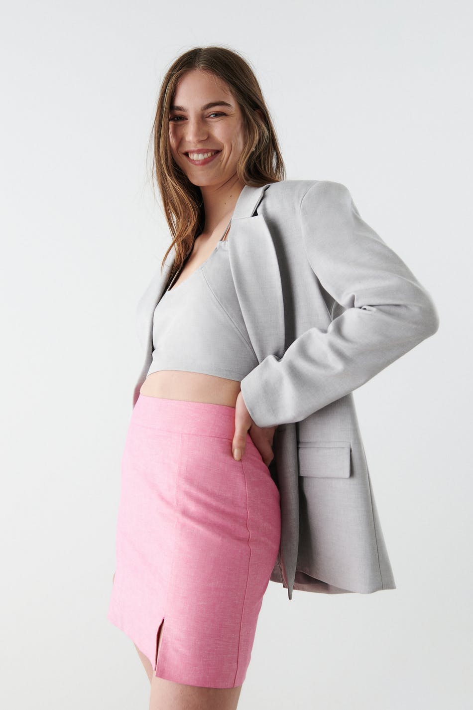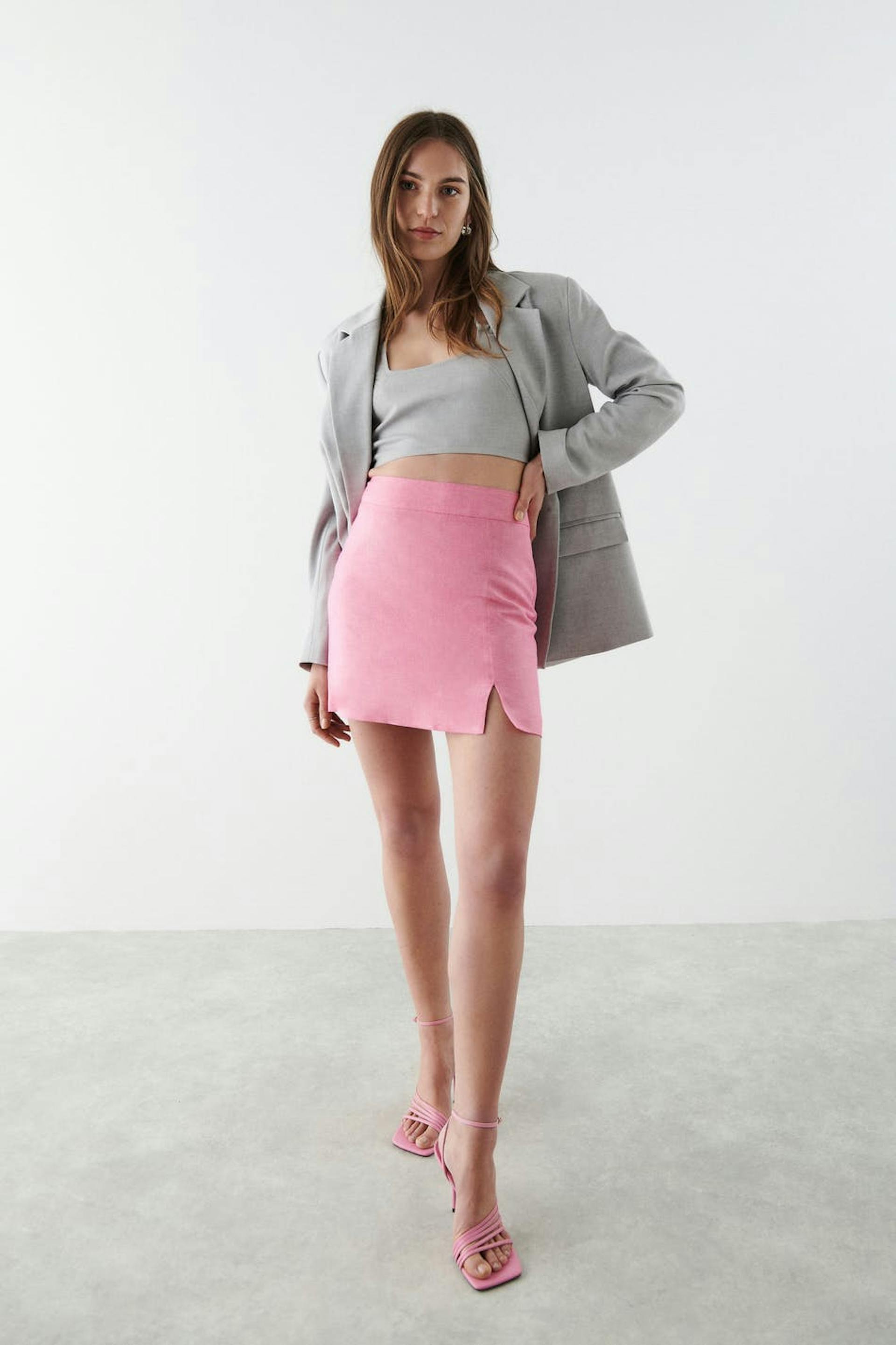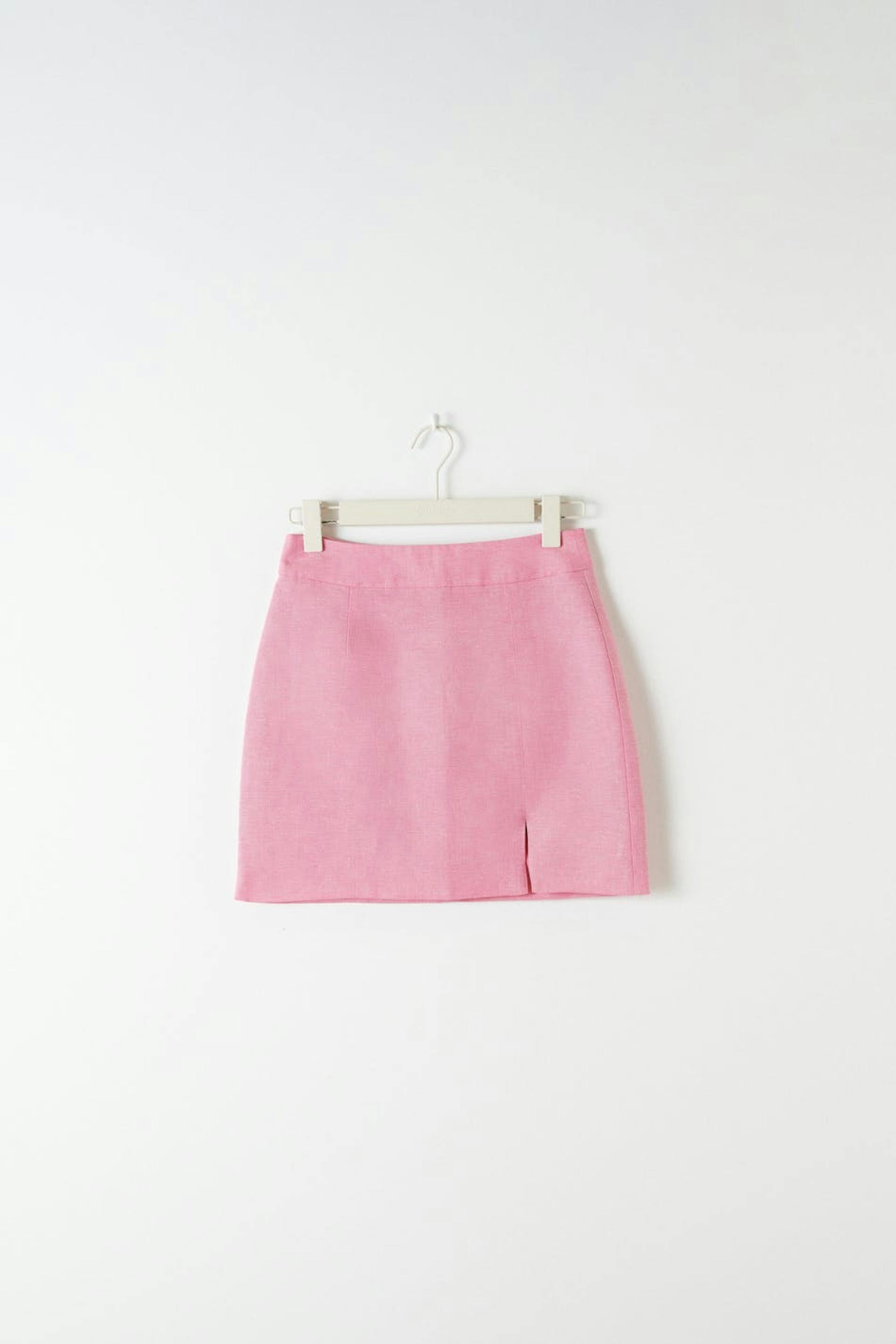 Short linen skirt with slit in front. The linen skirt is pink and has a zip at the back.