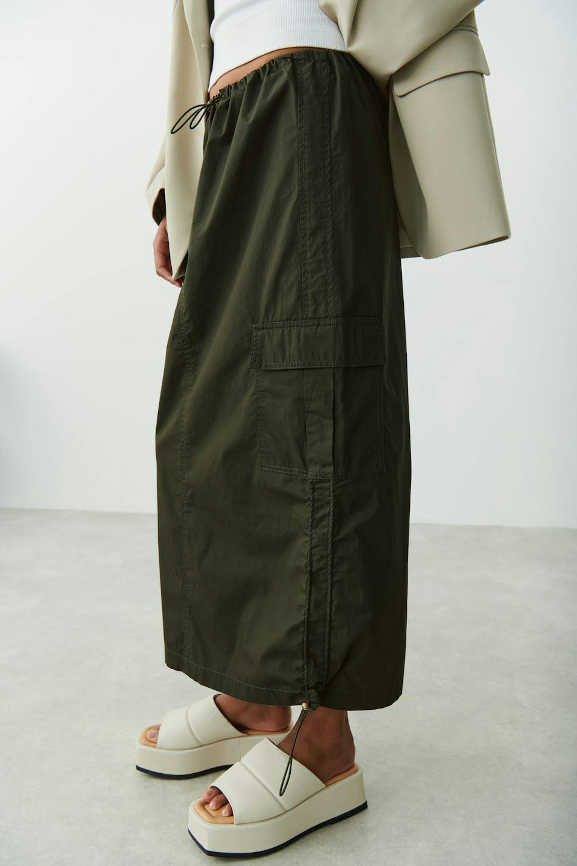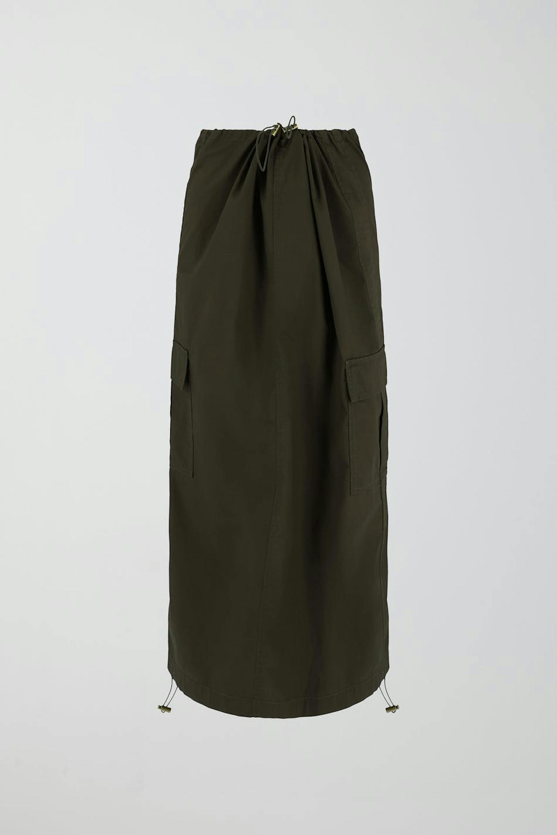 Long cargo skirt in crispy poplin with elastic at the waist. The skirt is green and has cargo pockets in the sides. It has slit detail at the back and elasticized drawstrings at the waist and at the bottom hem.