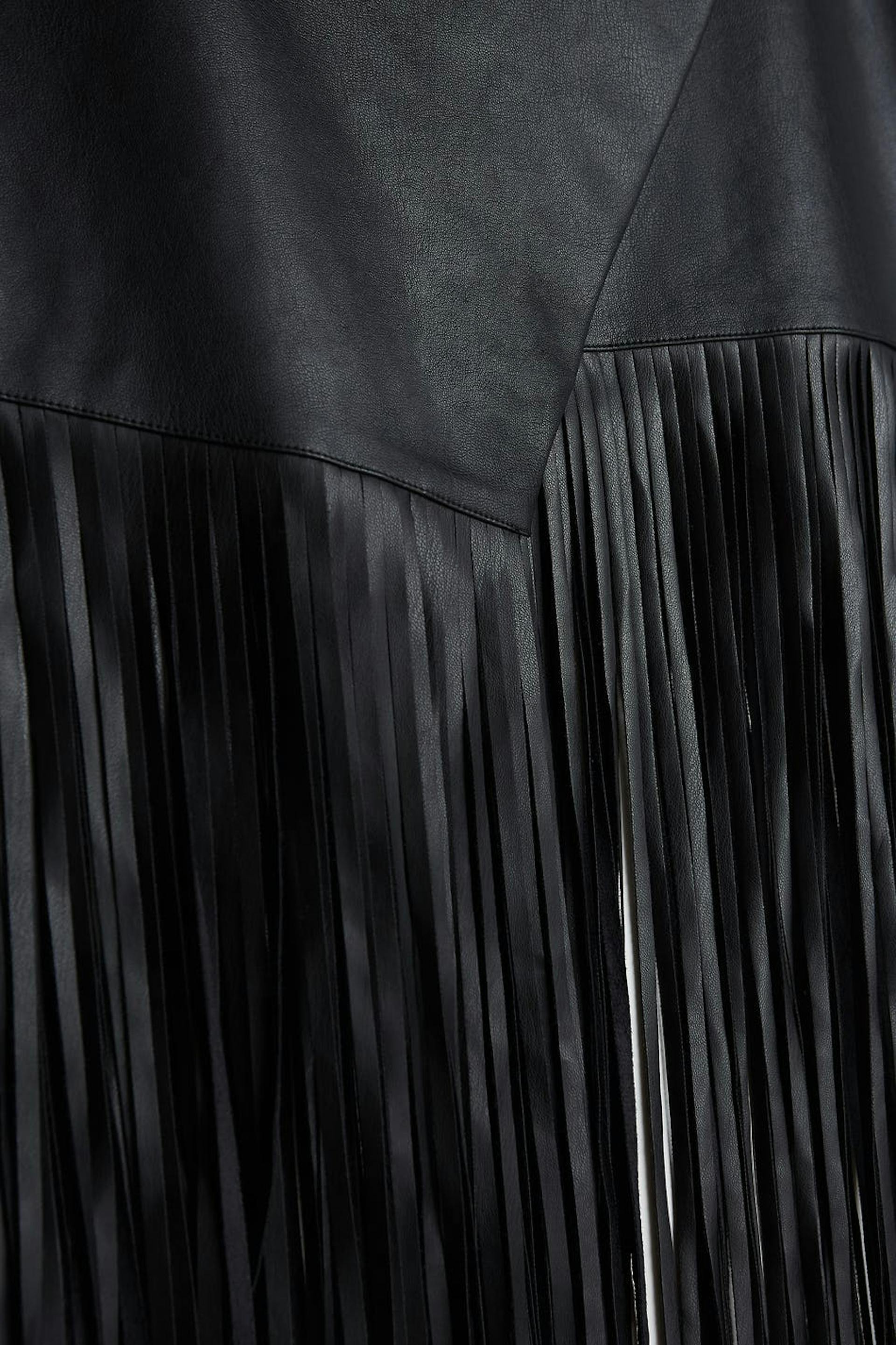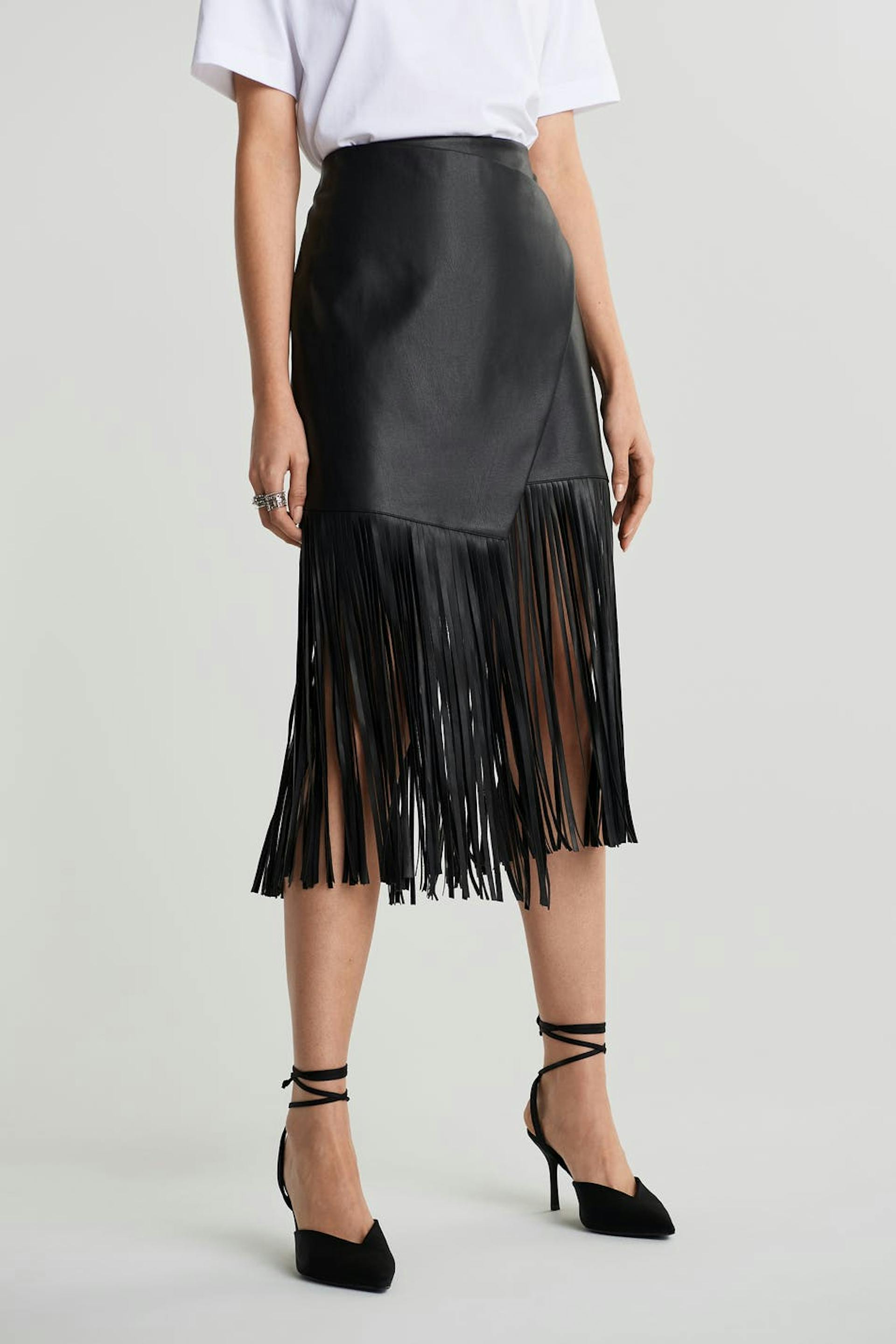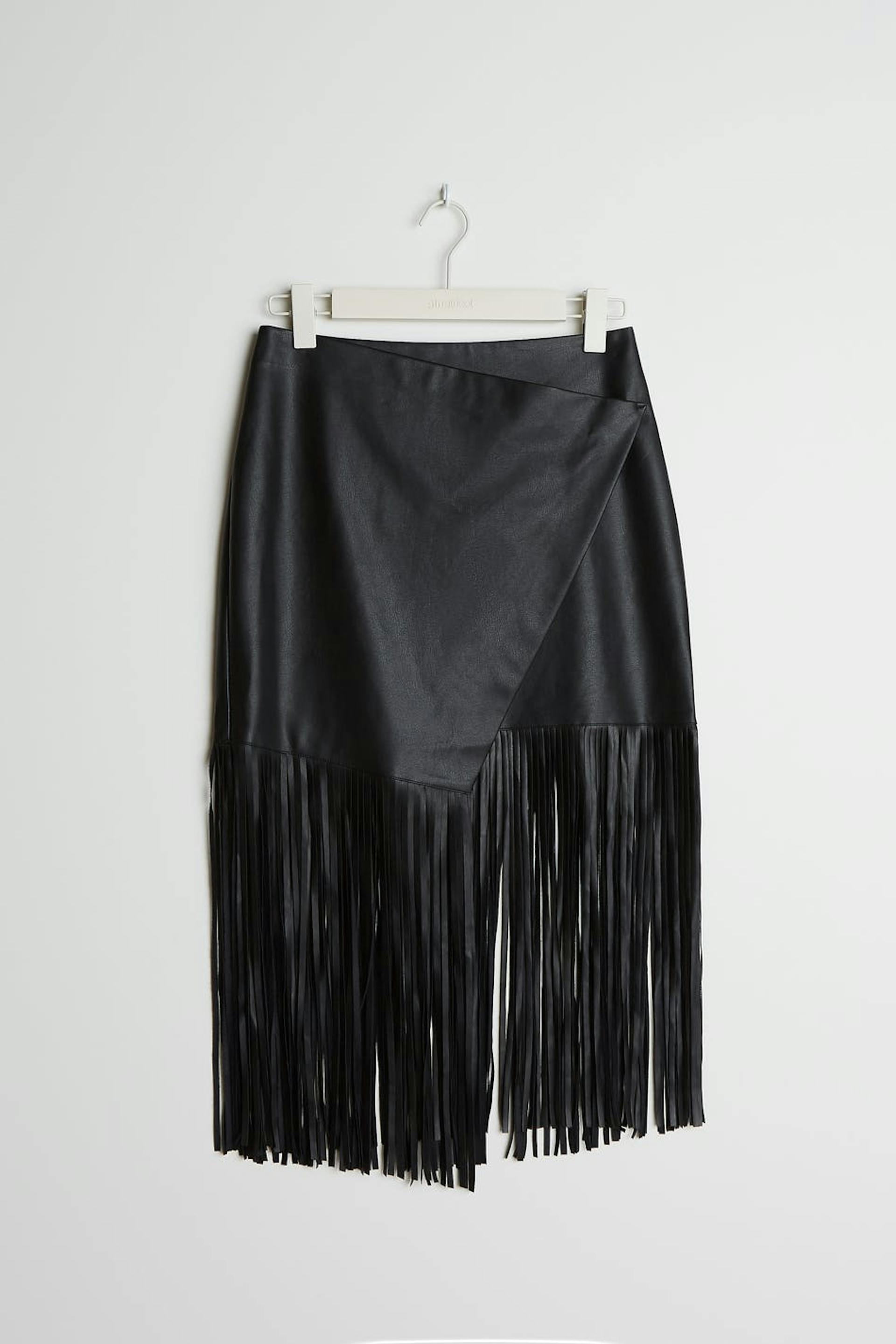 Skirt with long fringes at the hem. The skirt is black and has an overlap design. It is made of PU and has a zip at the back.
