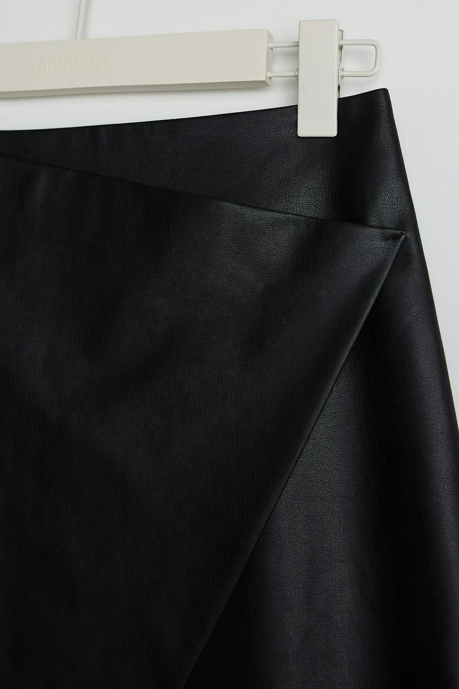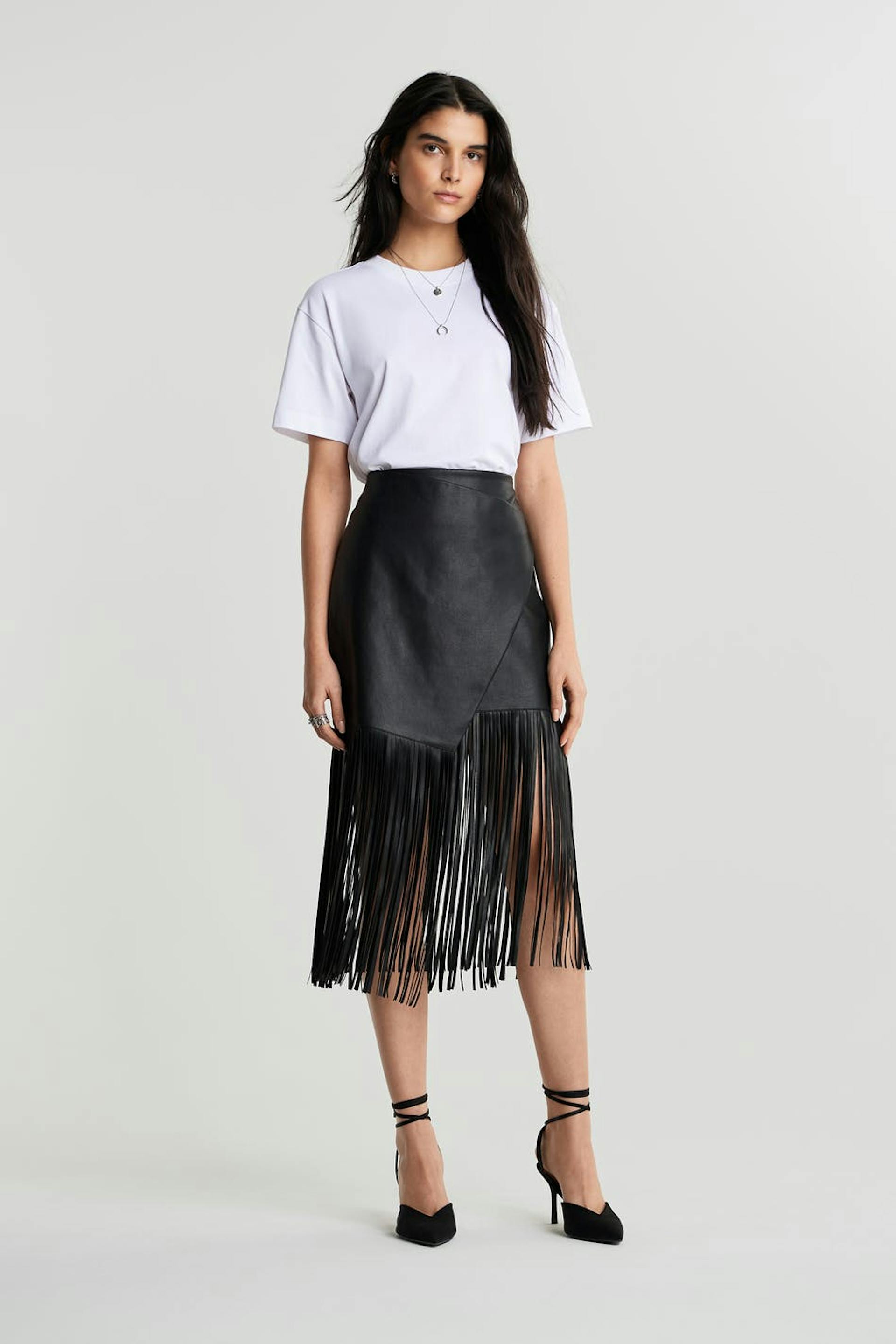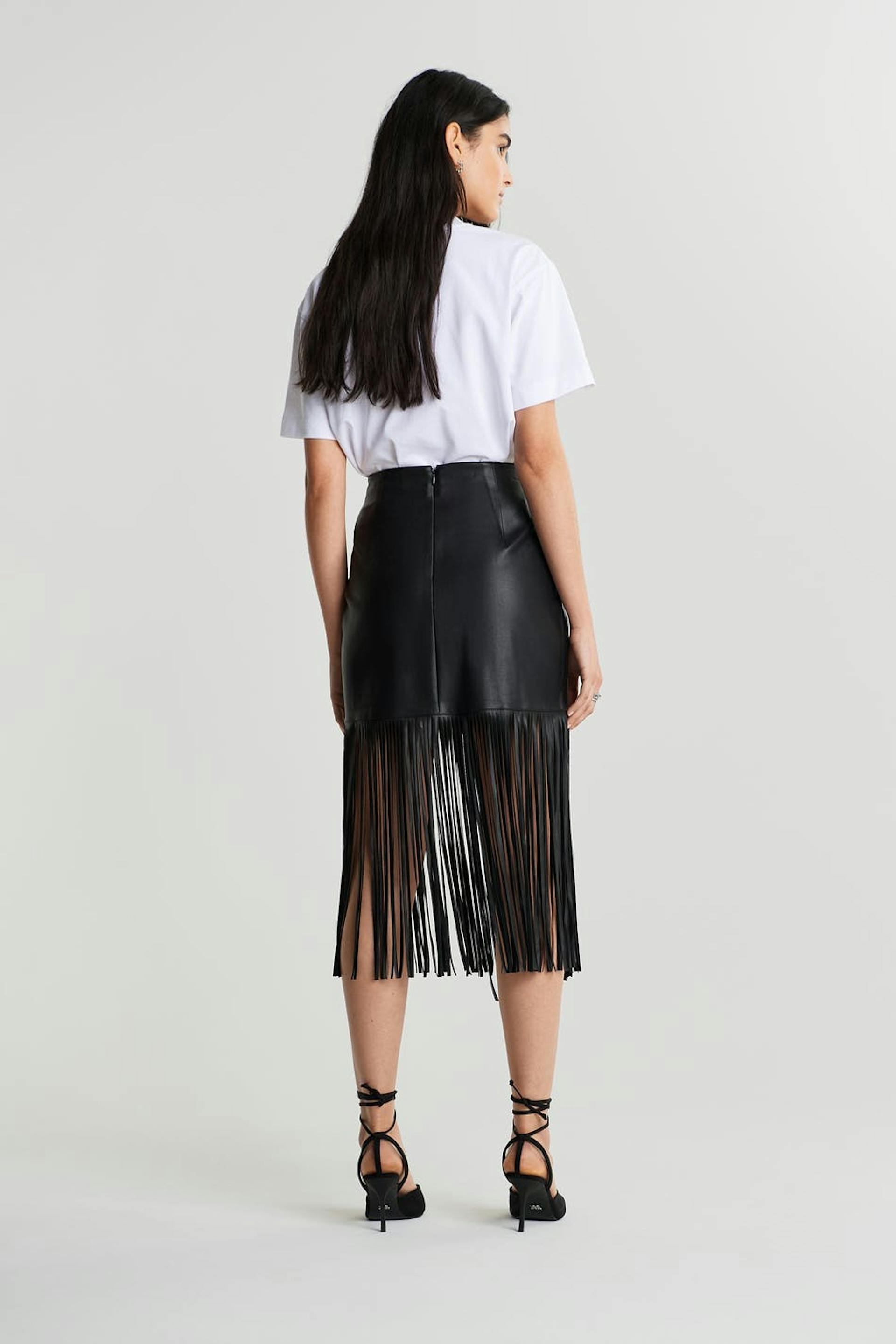 Skirt with long fringes at the hem. The skirt is black and has an overlap design. It is made of PU and has a zip at the back.
