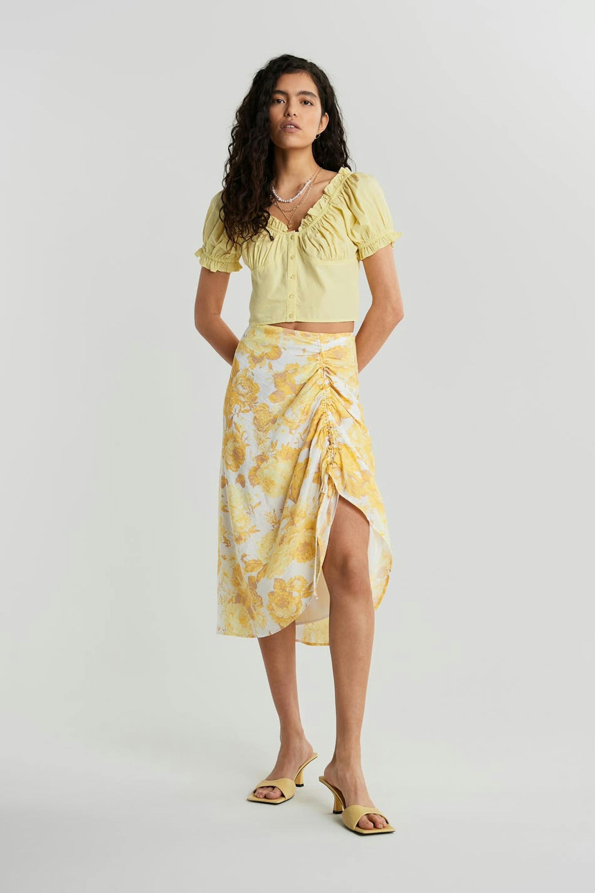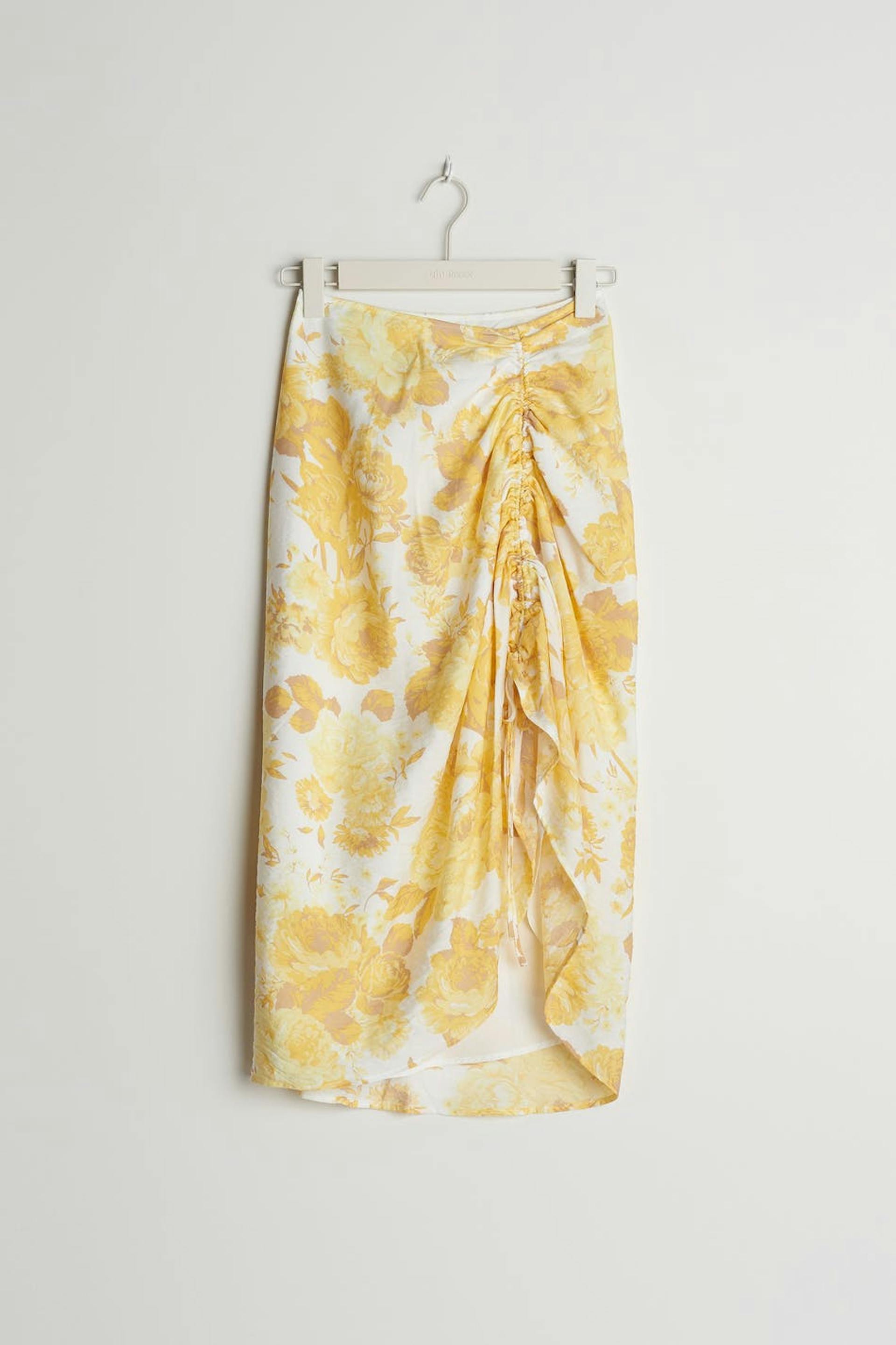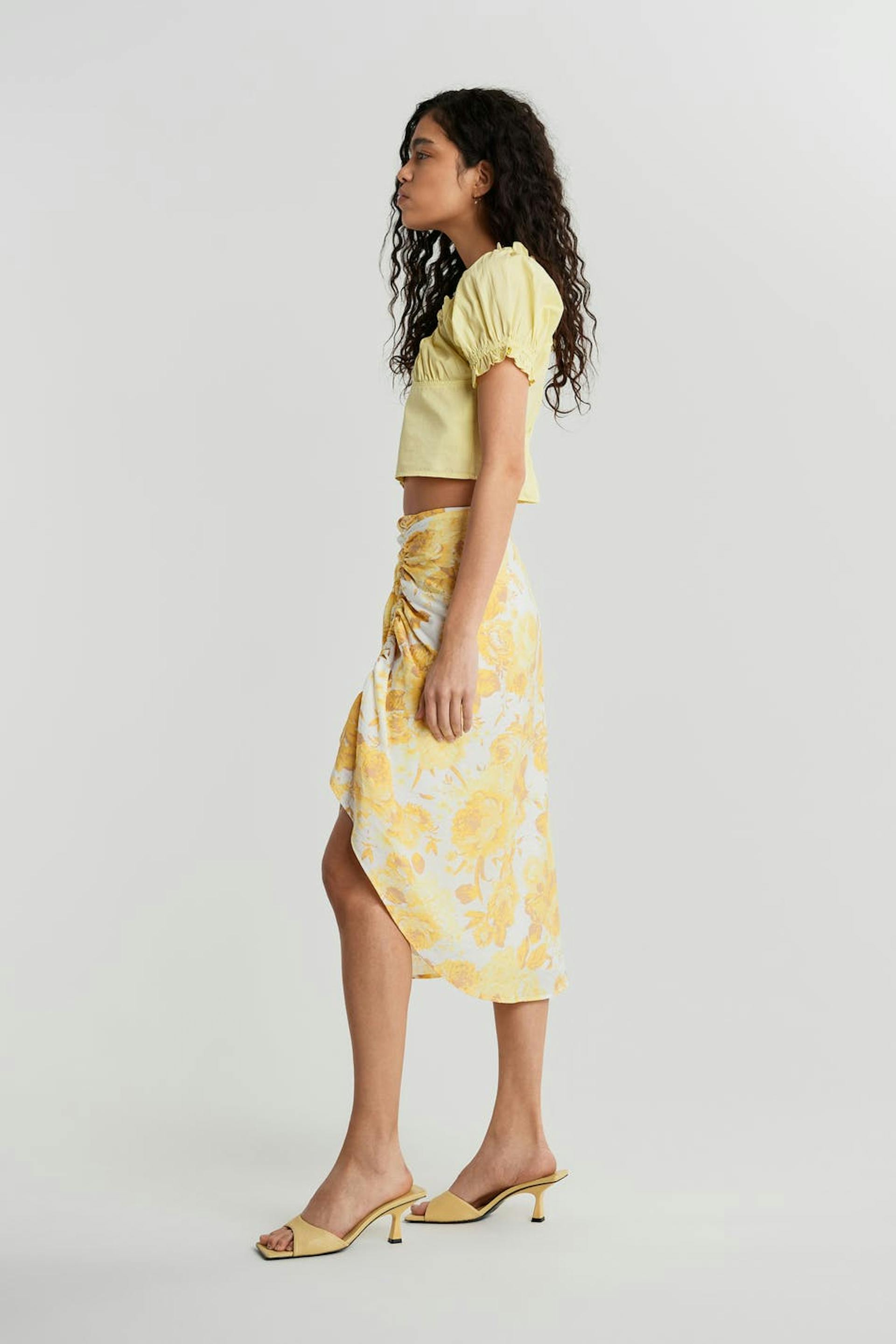 Skirt with a yellow, floral pattern. The skirt has a draped look with gathering and a self-tie drawstring. It has midi length.