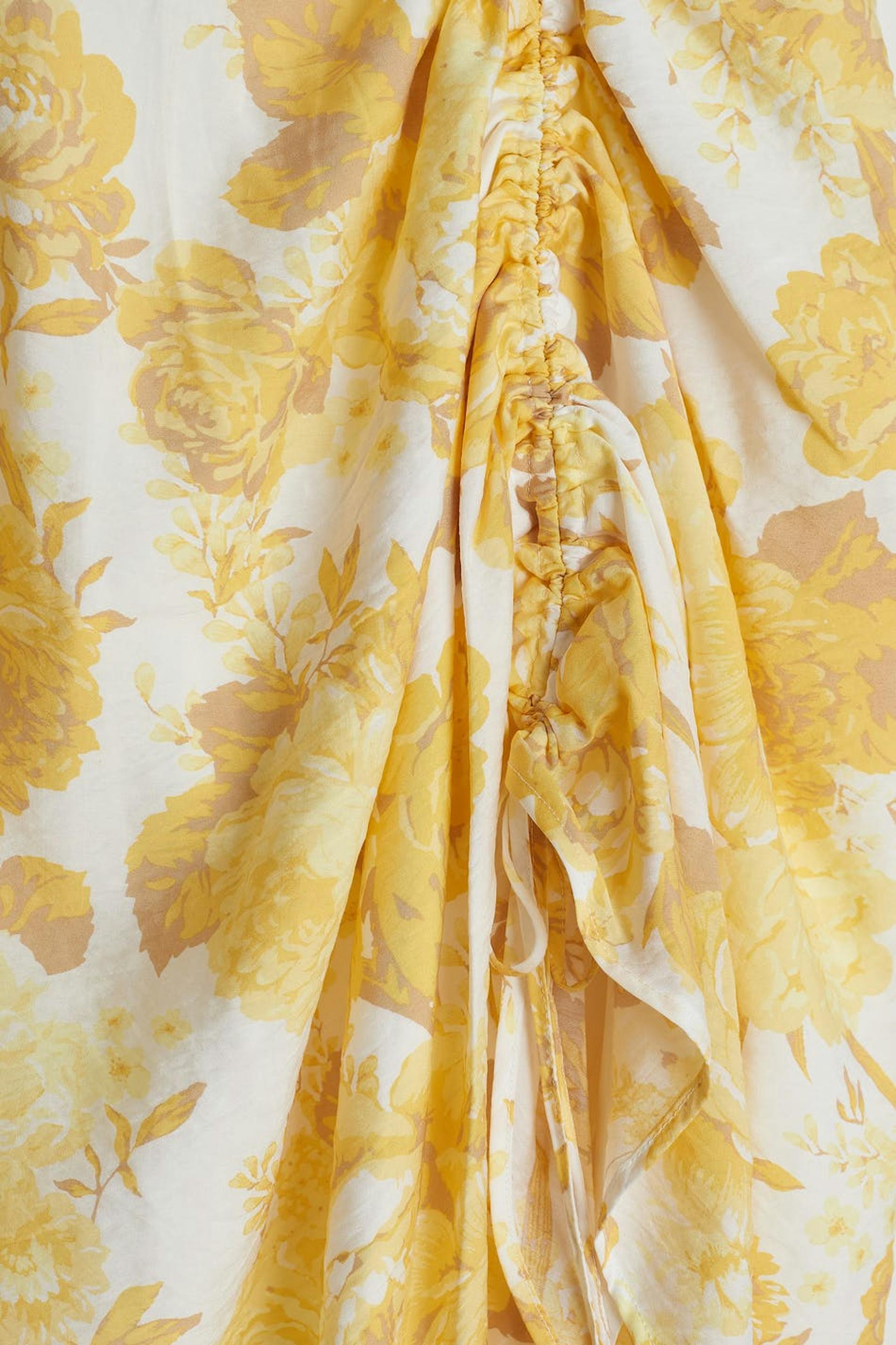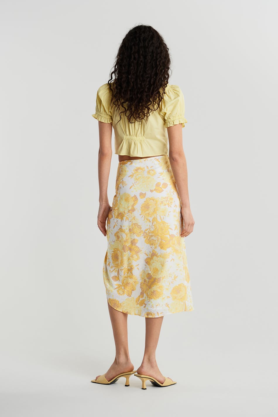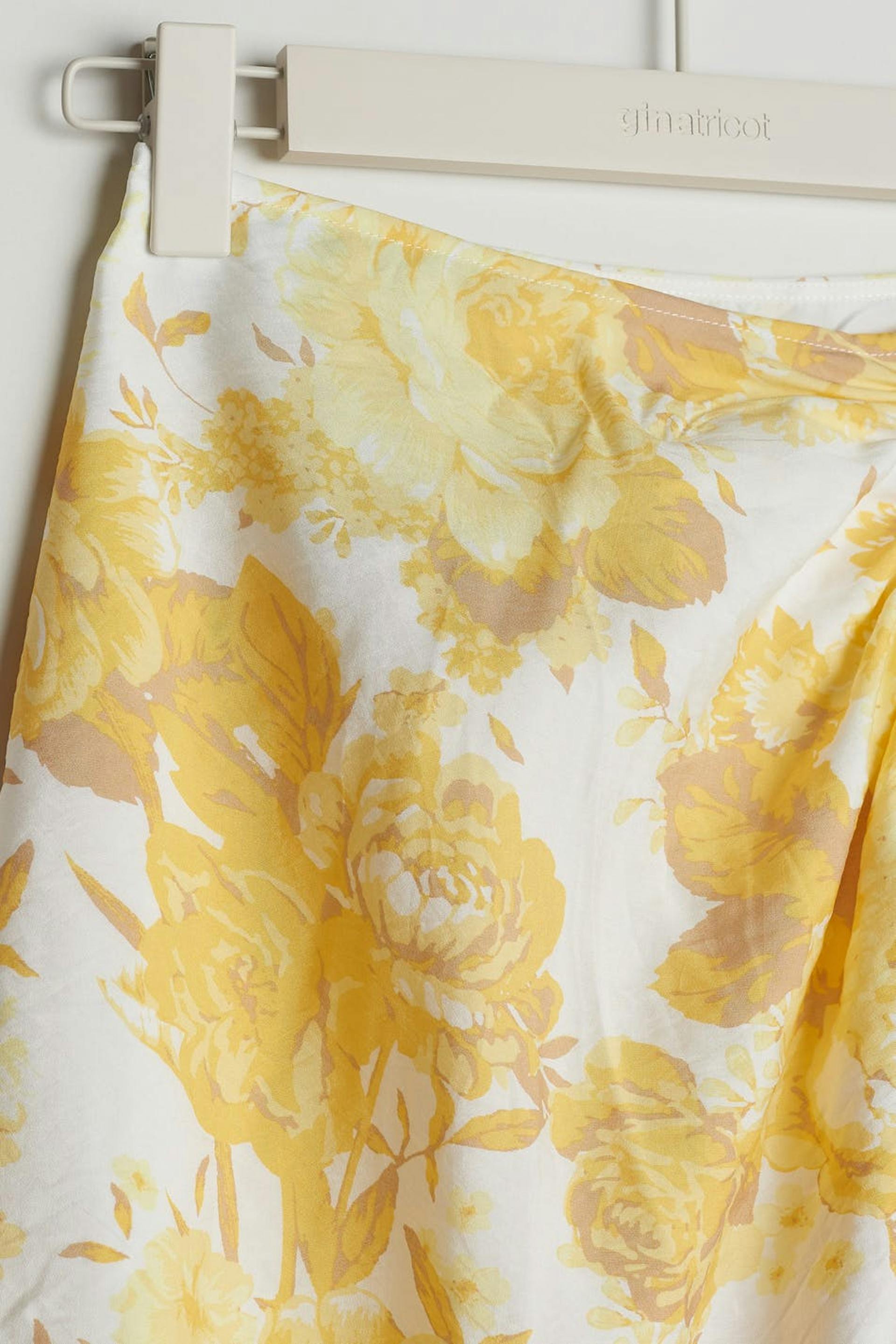 Skirt with a yellow, floral pattern. The skirt has a draped look with gathering and a self-tie drawstring. It has midi length.
