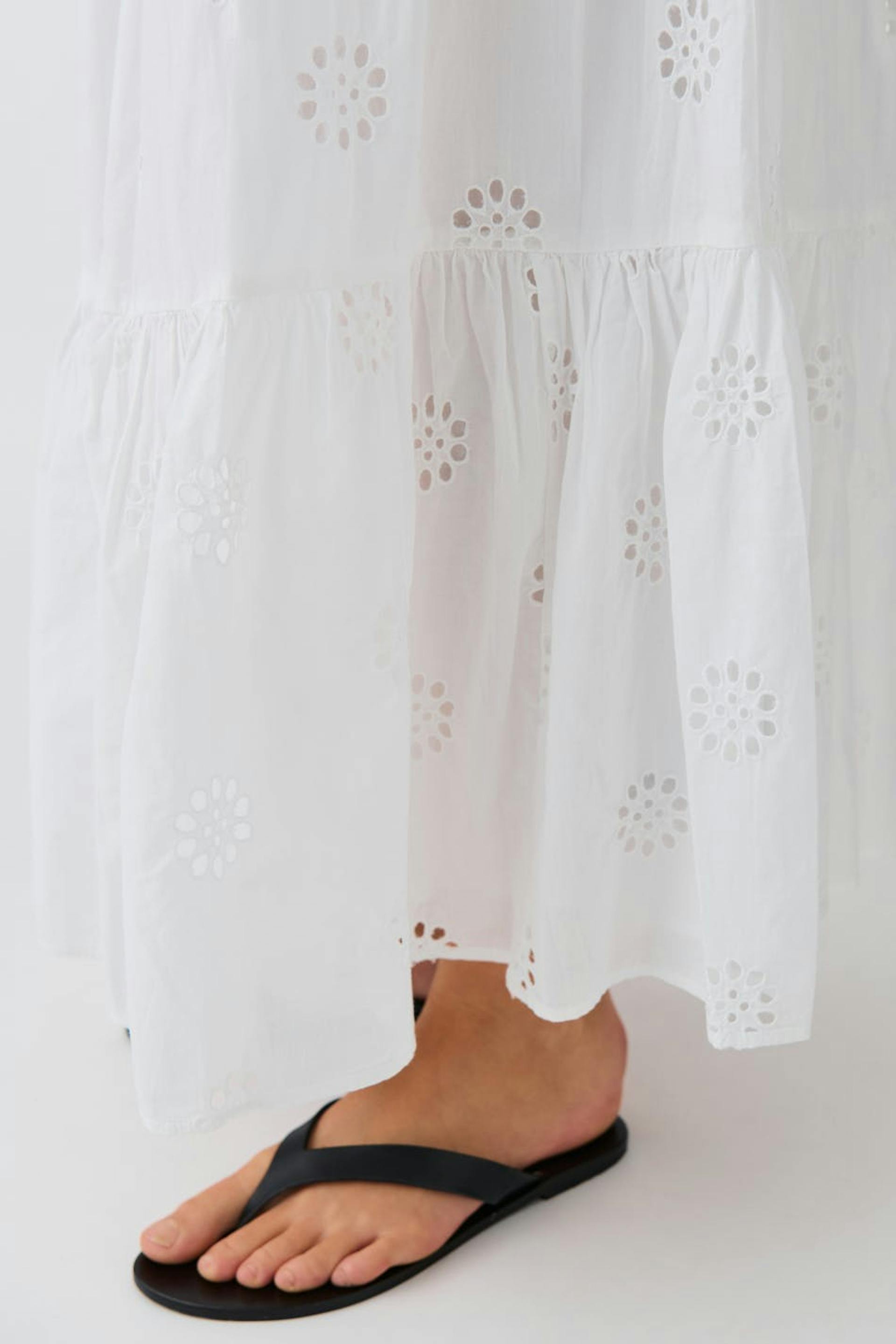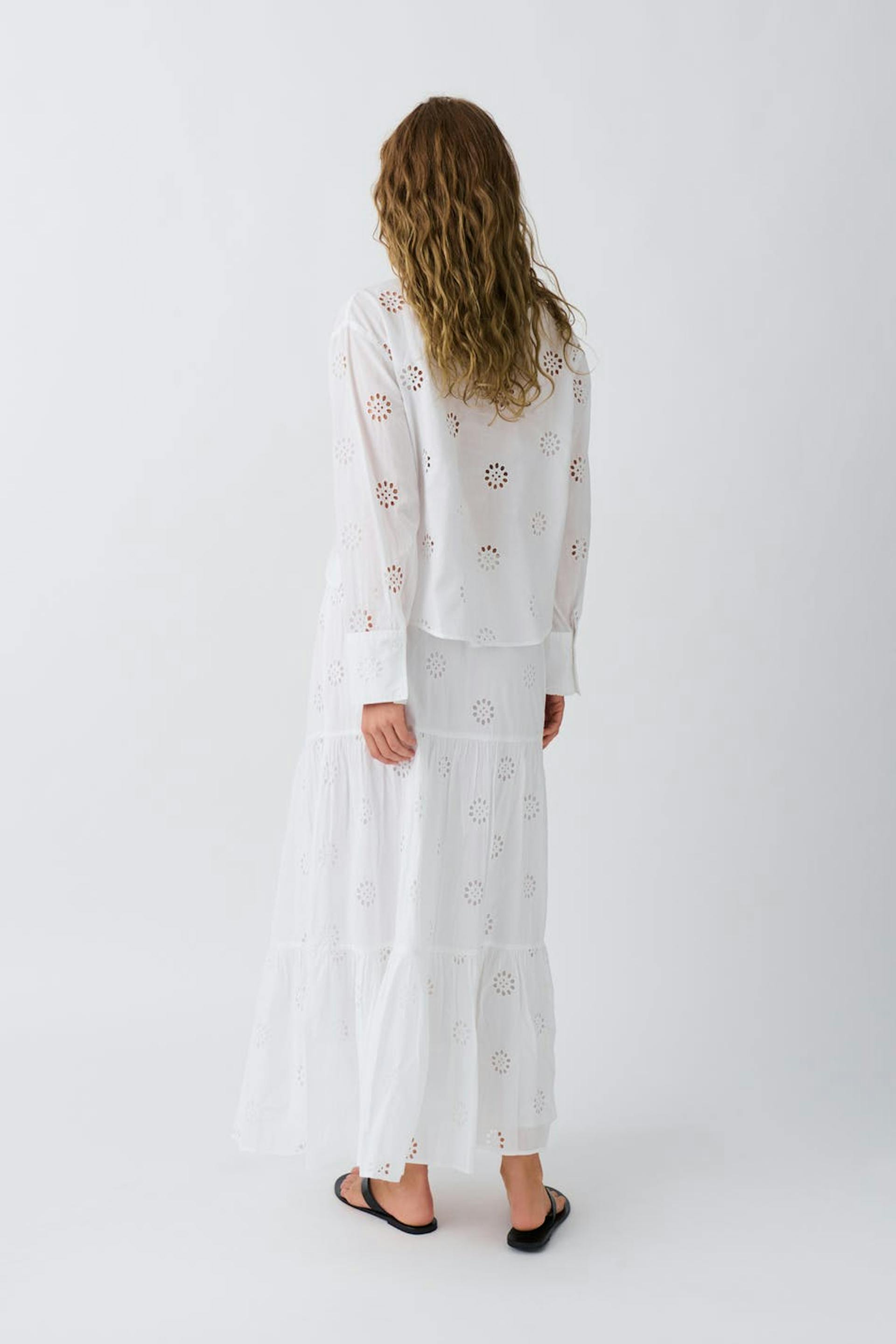 Maxi skirt with hole embroidery. The skirt is white and has flounces. It has elastic at the waist and maxi length.