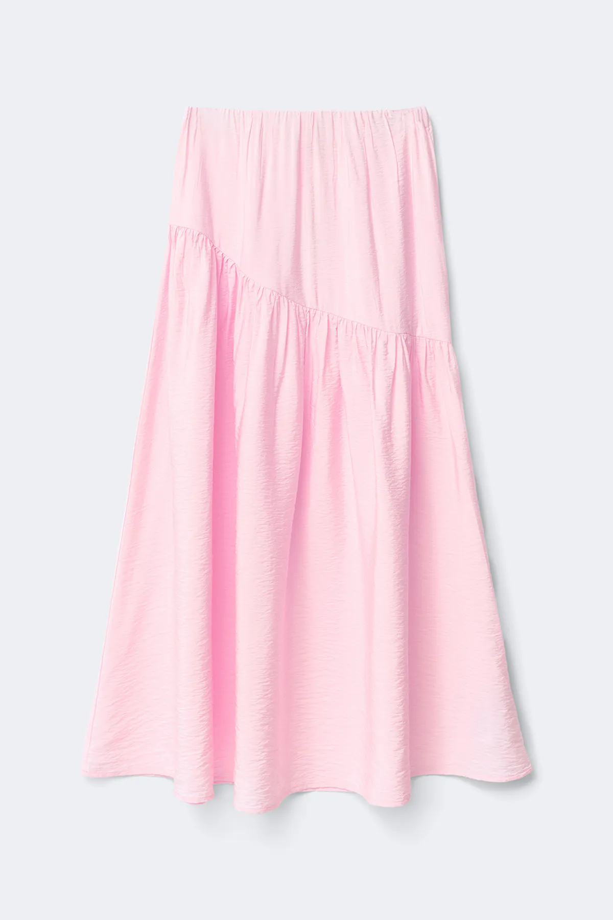 Maxi skirt with elastic waist. The skirt is pink and has decorative, slanted seam in the middle. It has regular waist, normal fit and inside in 100% recycled polyester.