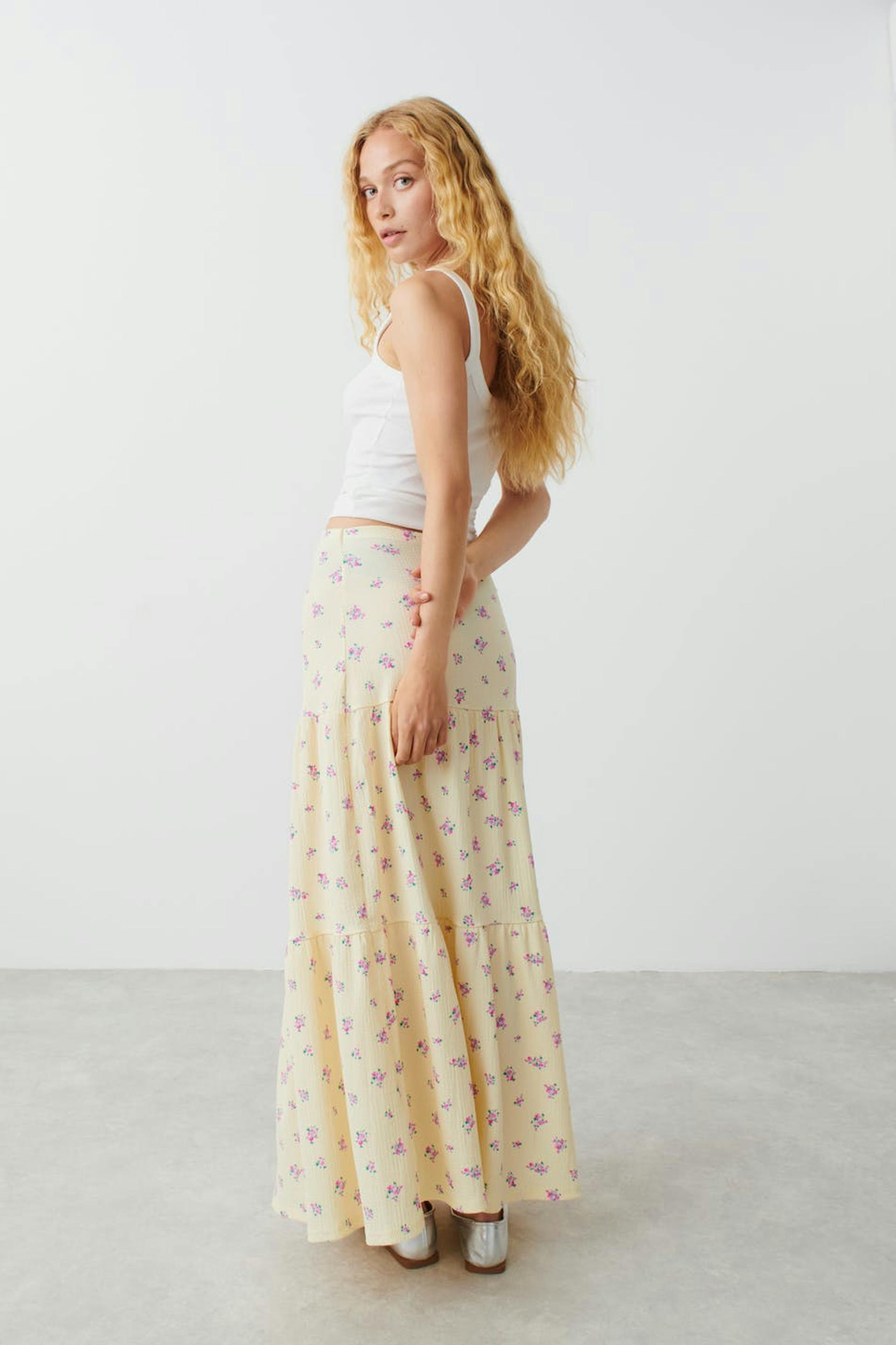 Floral maxi skirt with low waist. The skirt is yellow and has textured material. It has gently flared fit, elastic at the waist and flounced details.