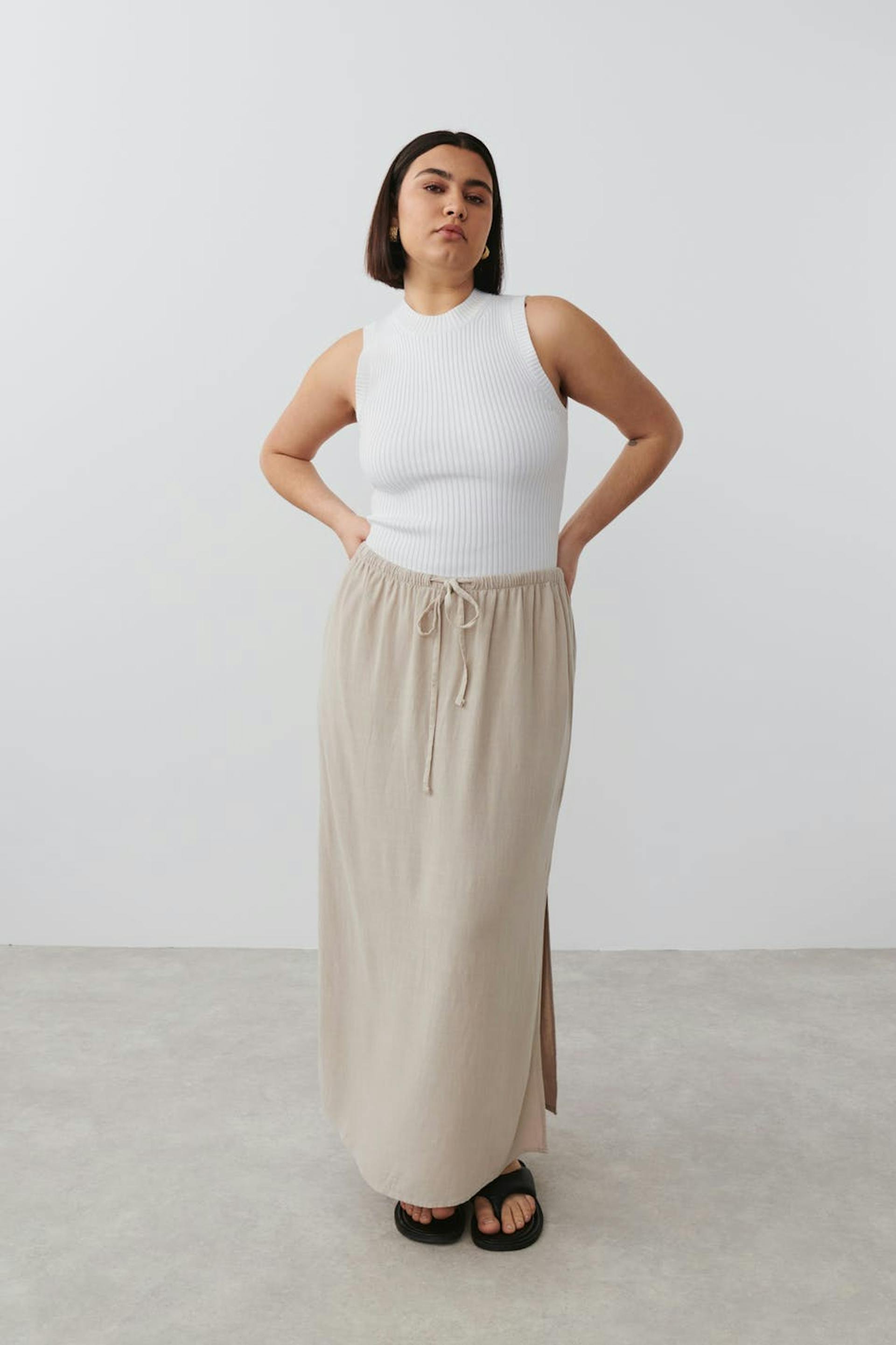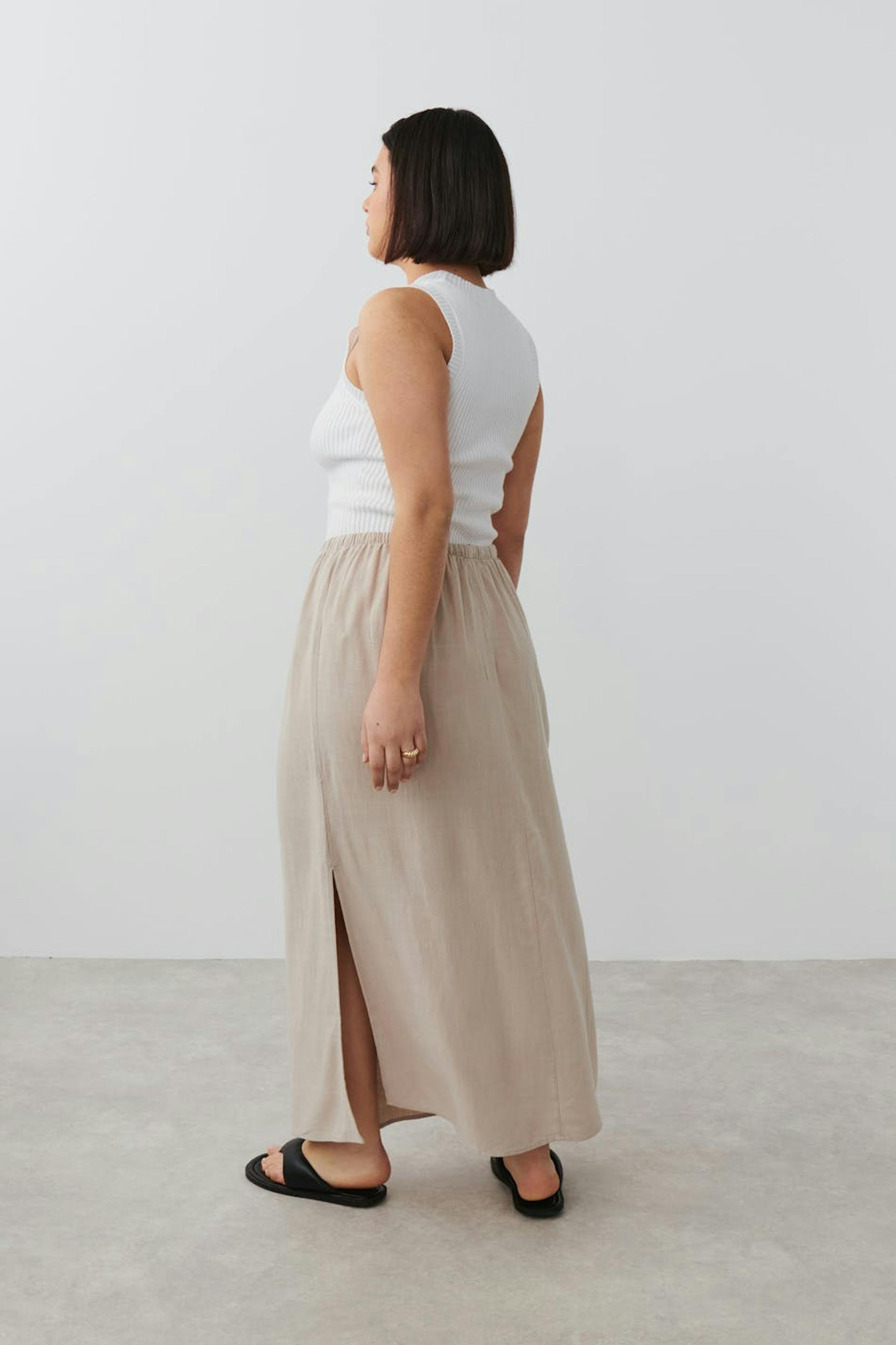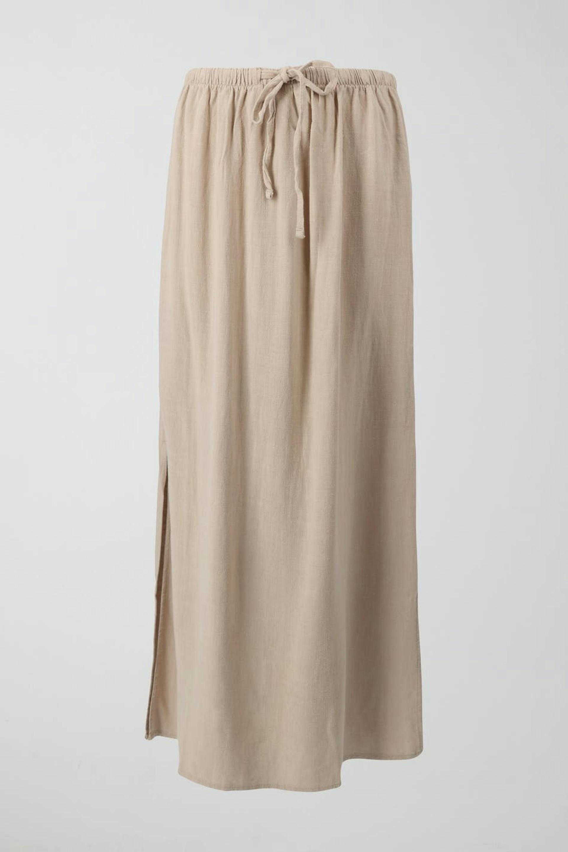 Long linen skirt with slit at the side. The linen skirt is beige and has mid waist. It has elastic at the waist with self-tie drawstring at the front.