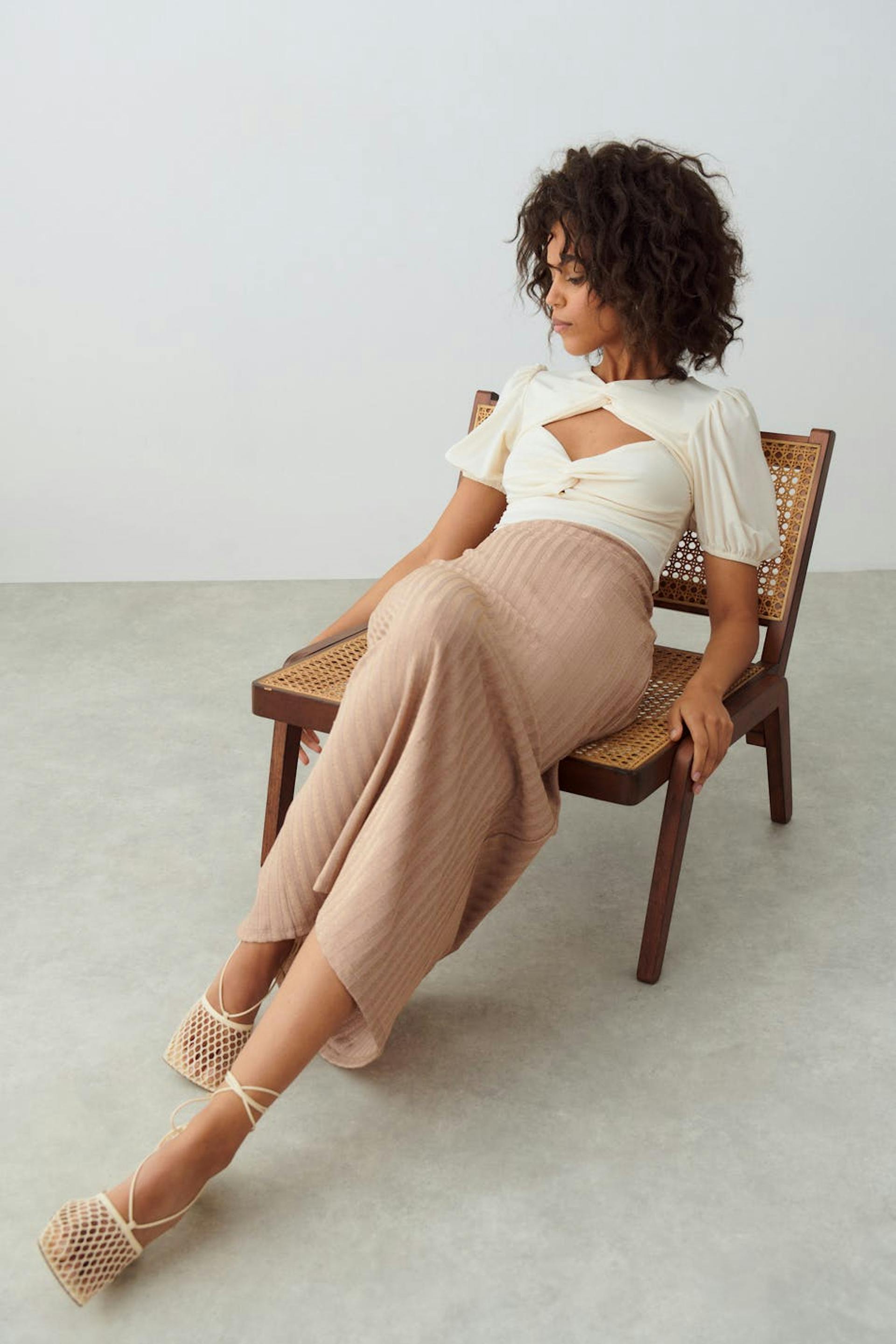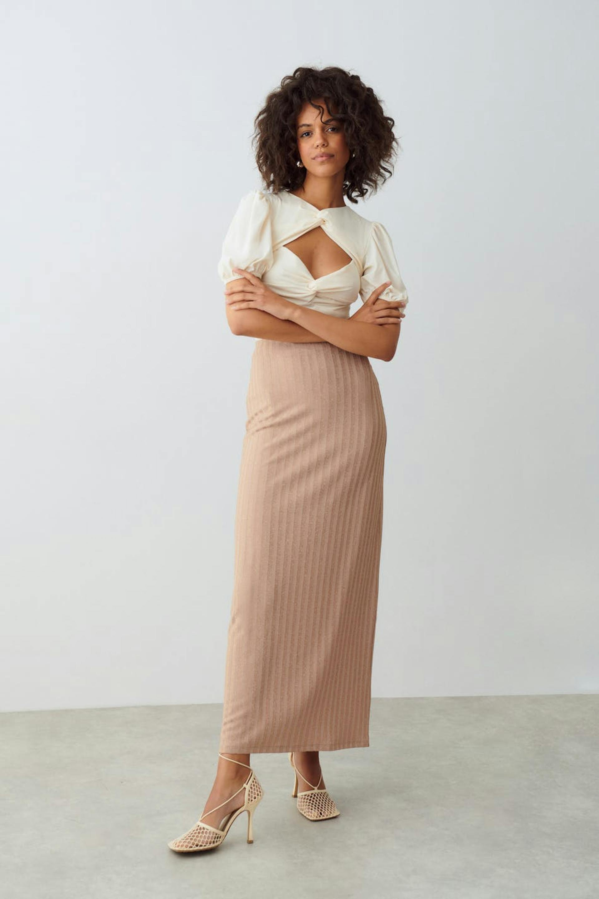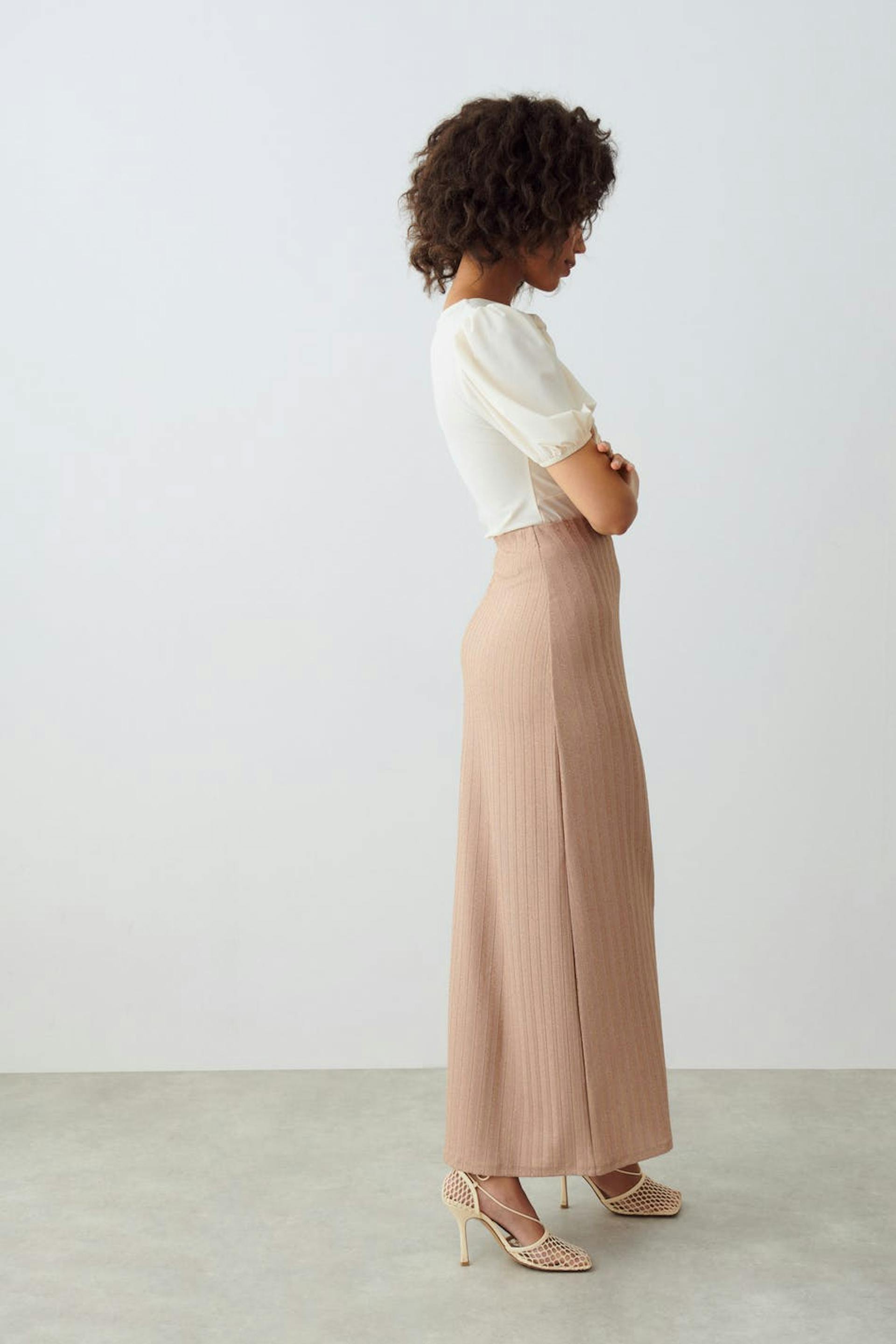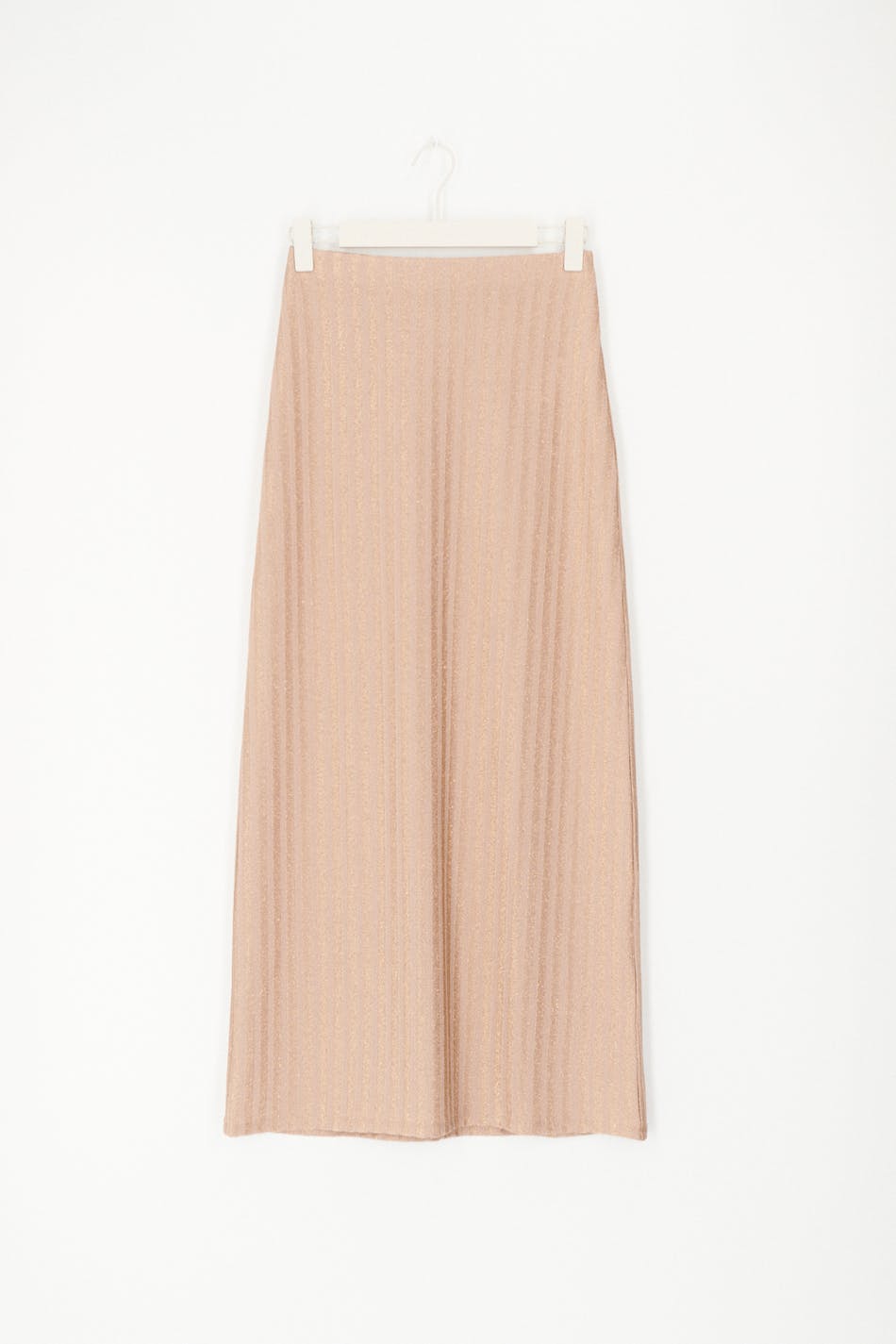 Maxi skirt in lurex with hidden elastic at the waist. The skirt is beige and has a sparkly material.
