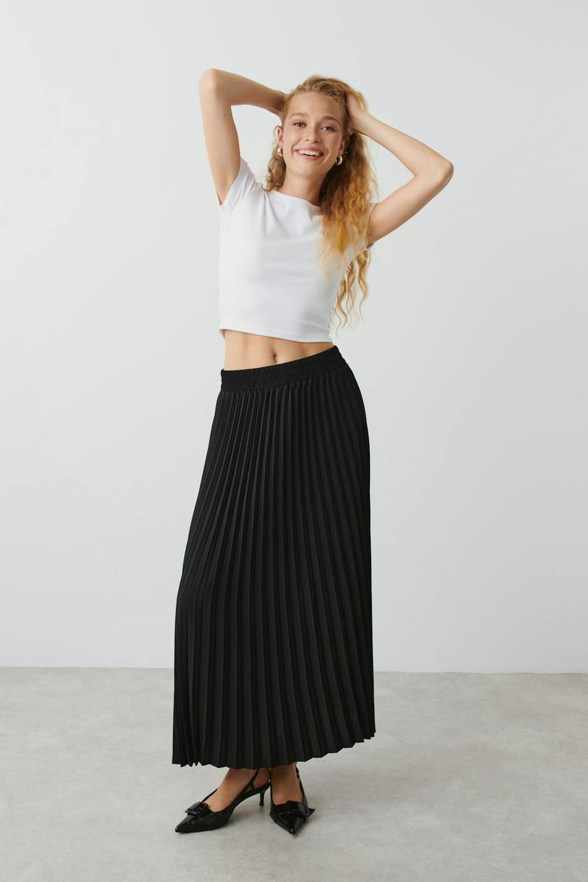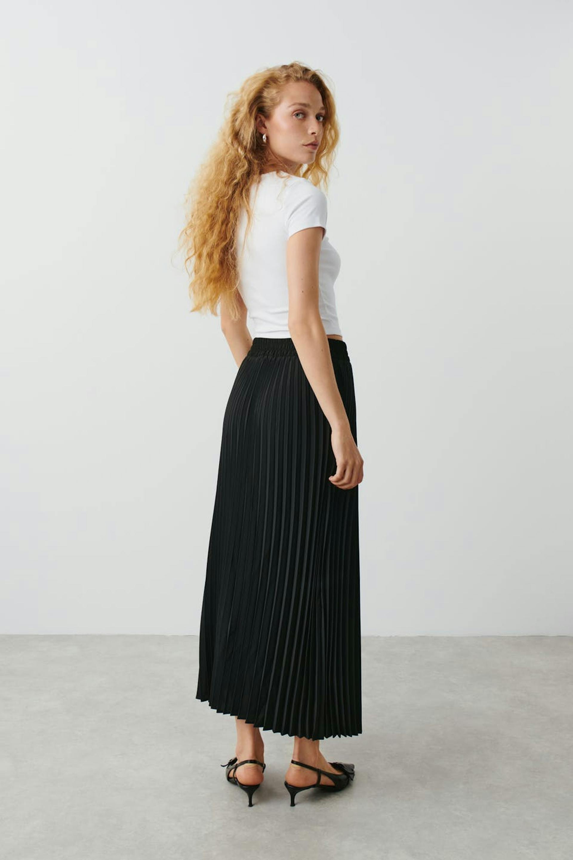 Pleated maxi skirt with satin touch. The skirt is black and has elastic at the waist.