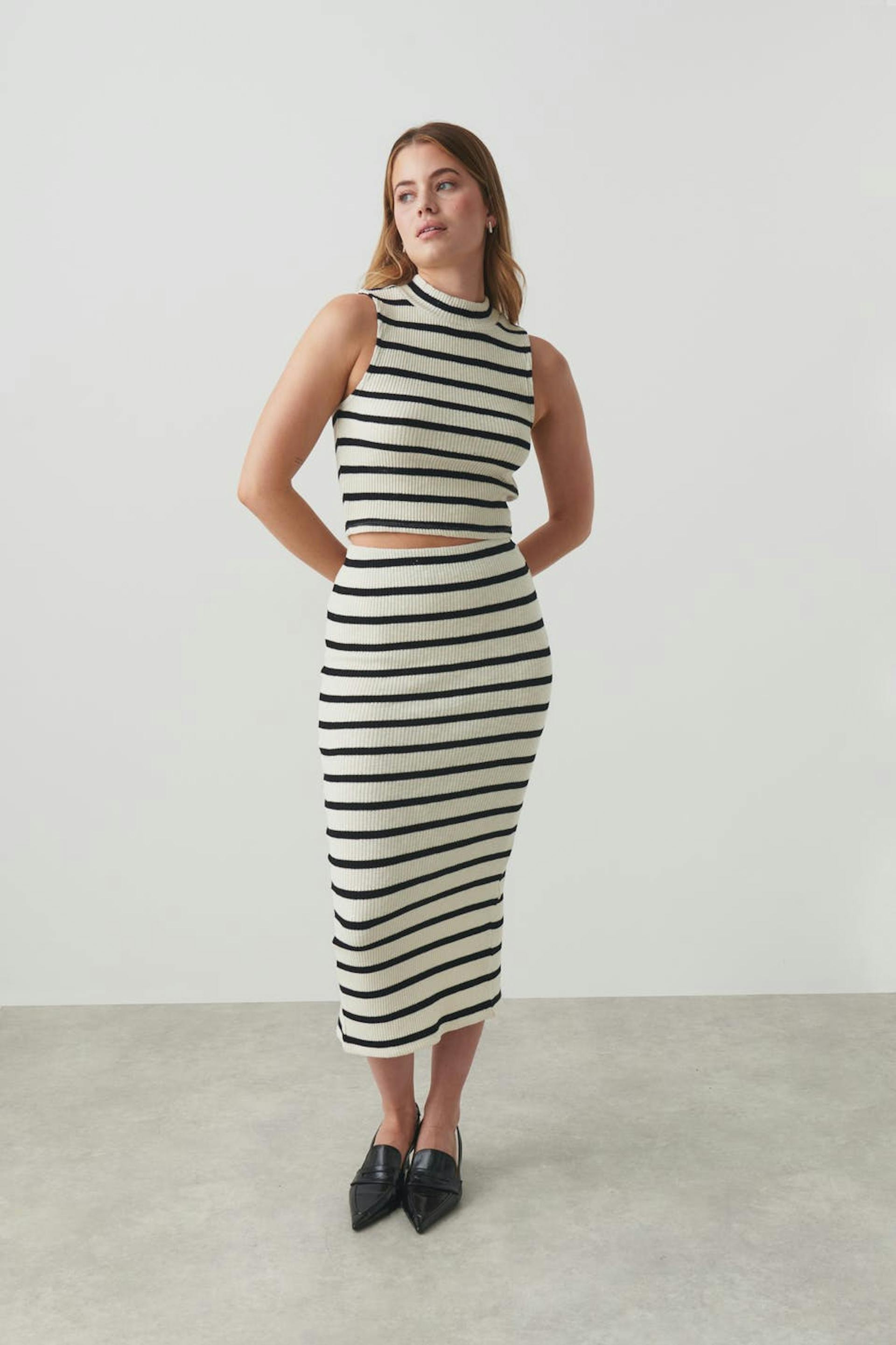 Striped midi skirt in jersey with slit at the back. The skirt is white, black and ribbed. It has figure-hugging fit and elastic at the waist.
