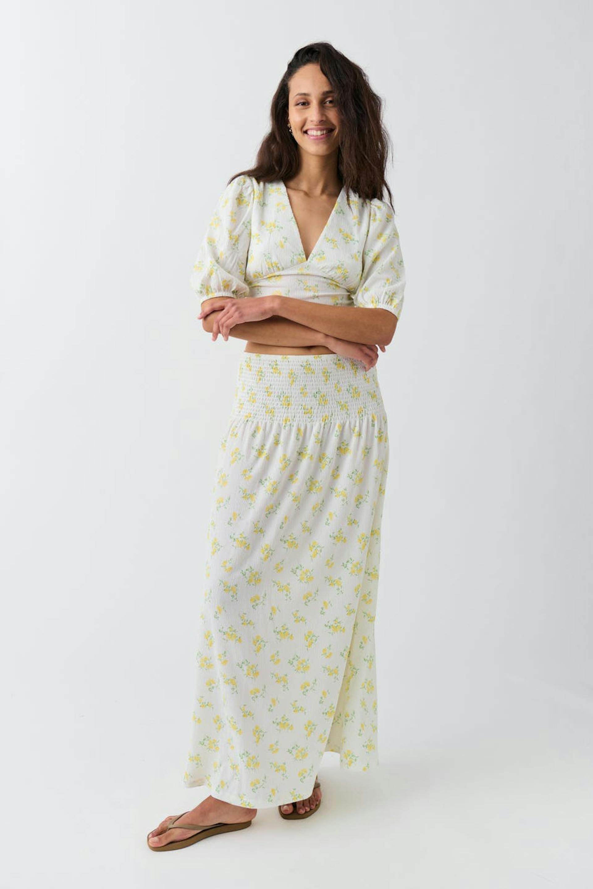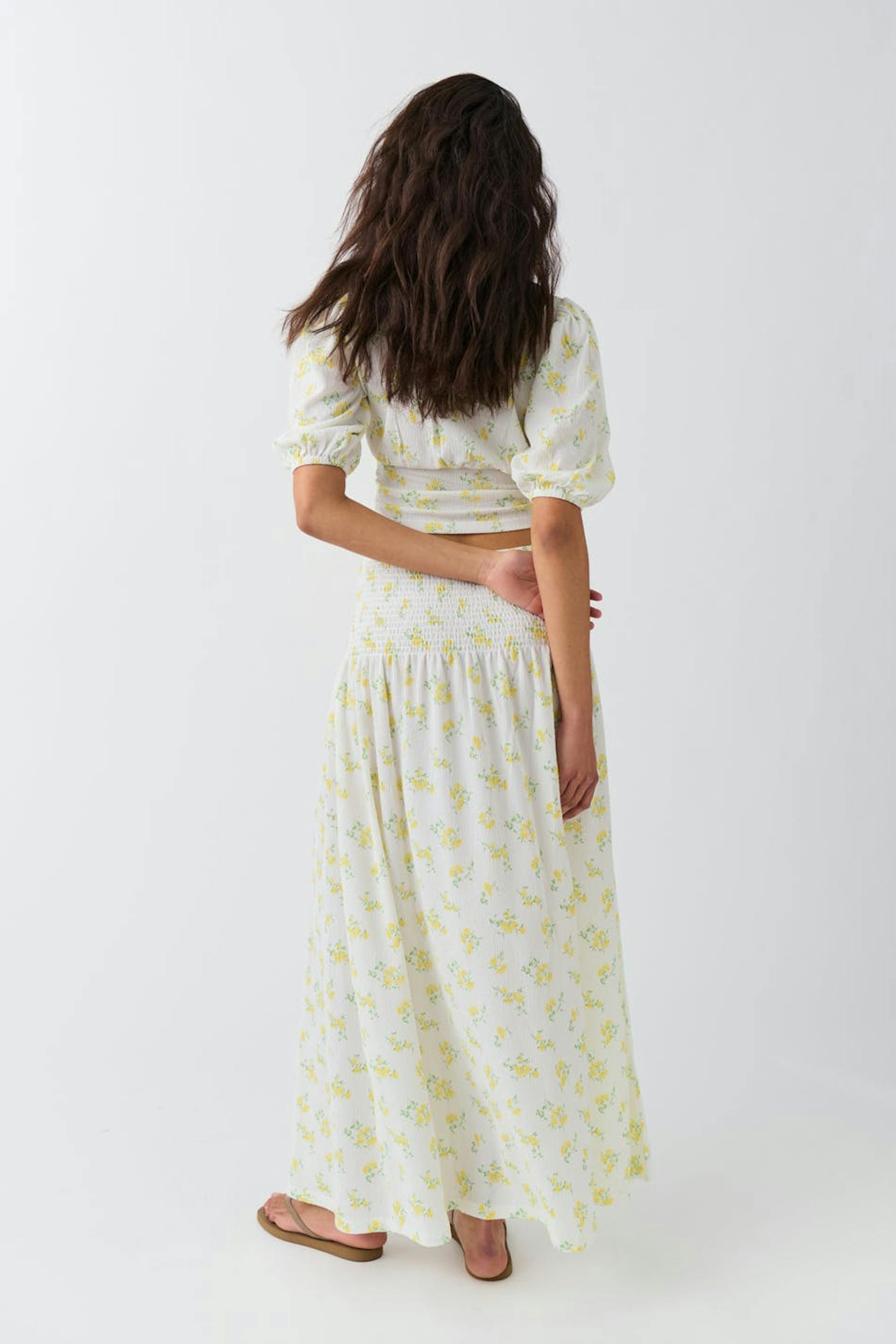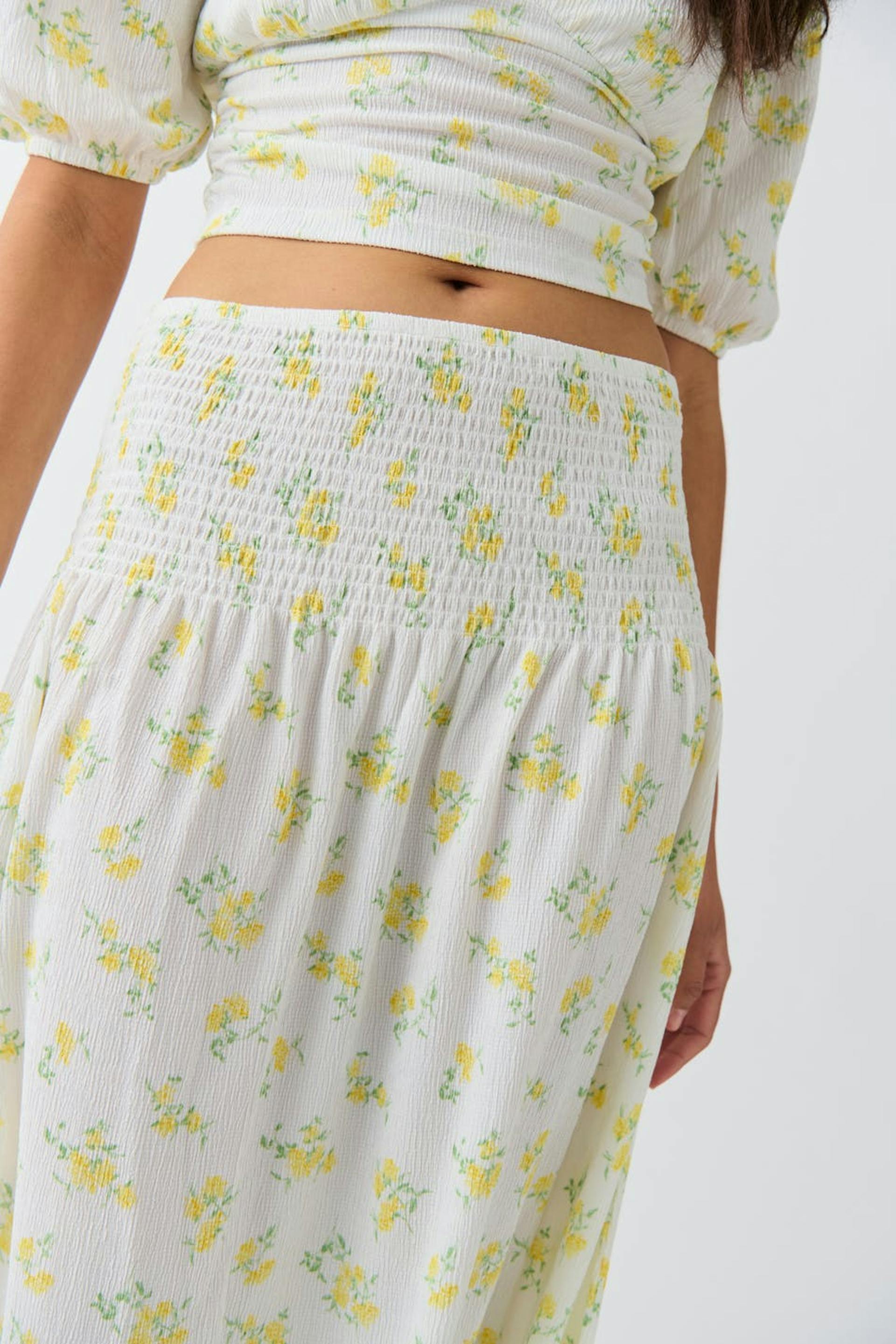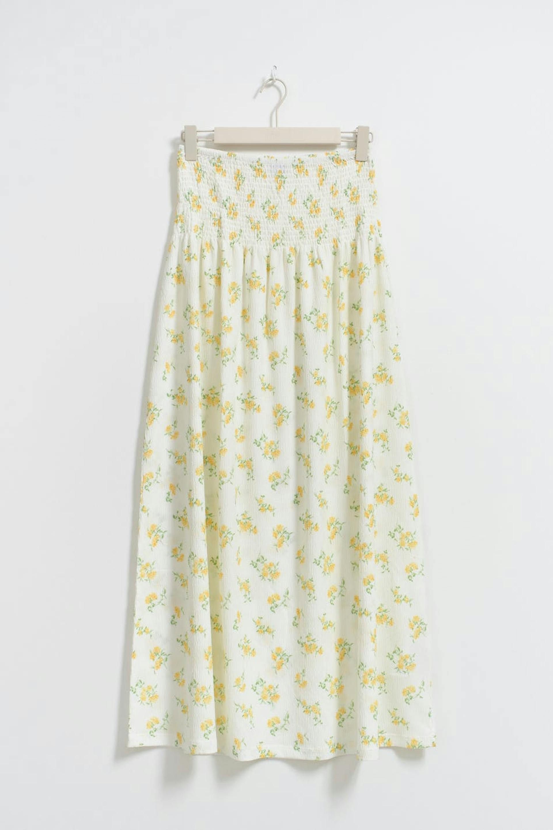 Floral maxi skirt with smocked waist. The skirt is yellow, white and low-waisted. It has textured quality, regular fit and gathered seam at the top.