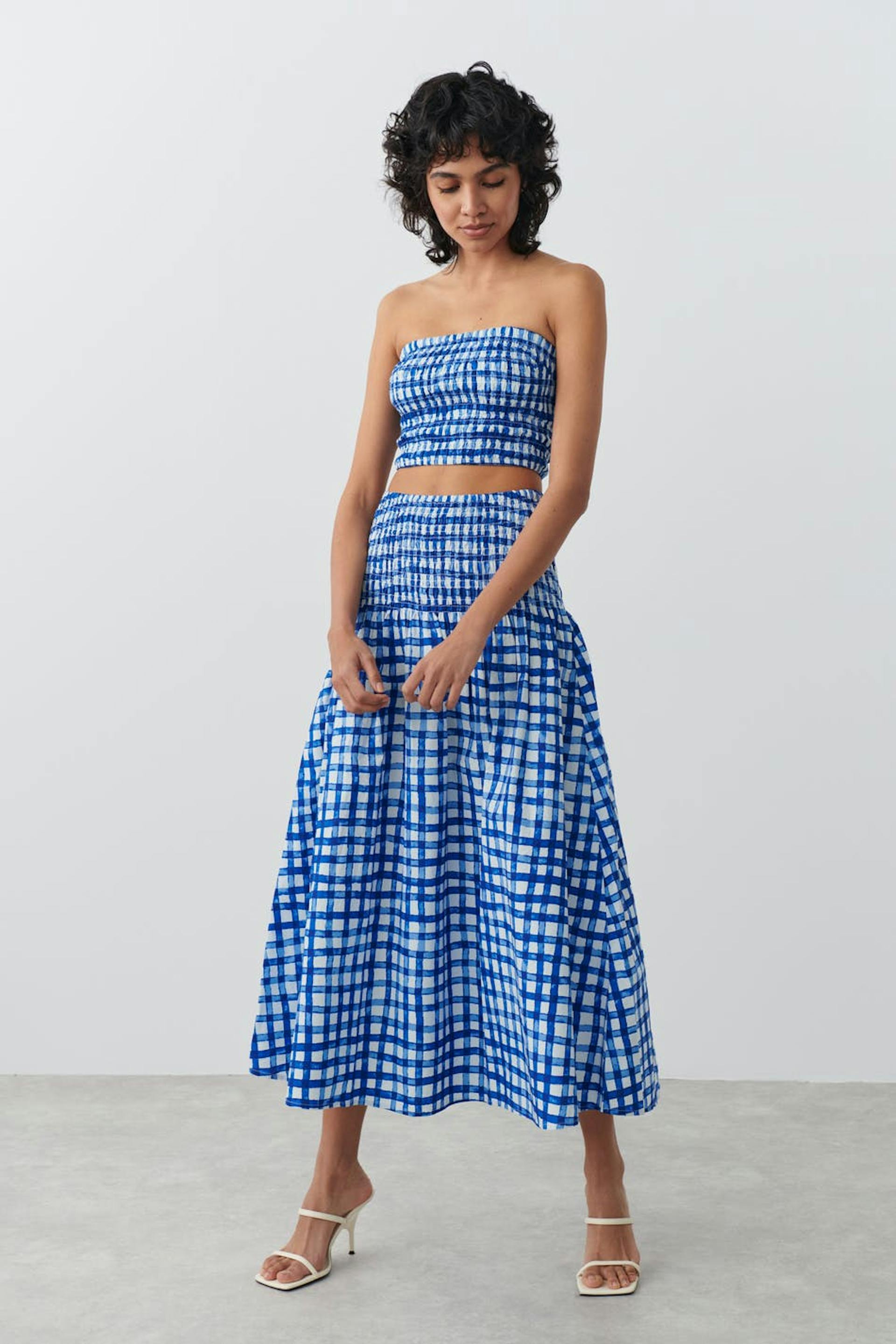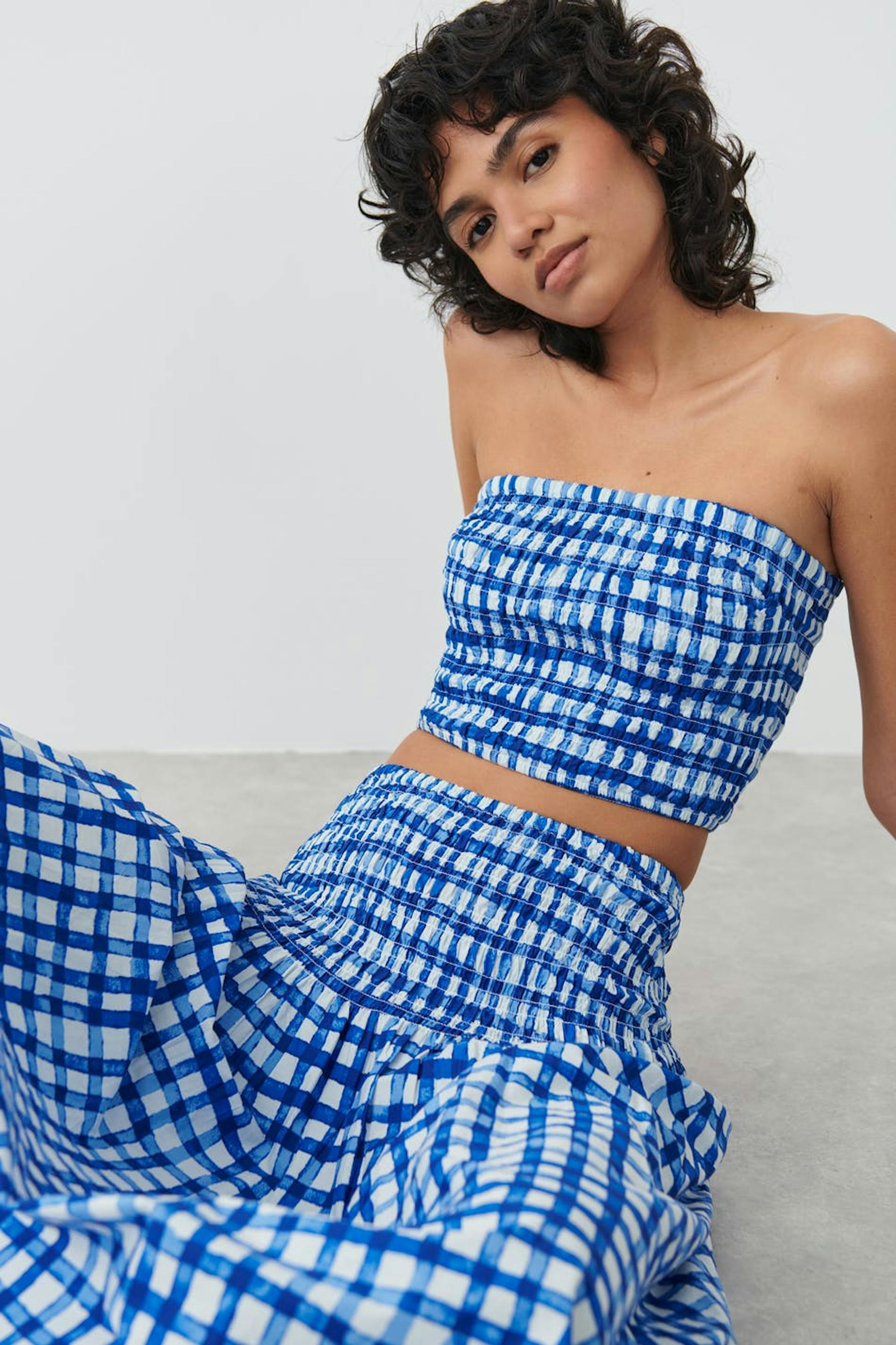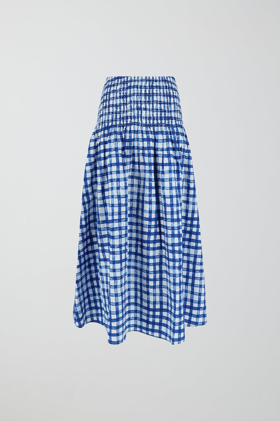 Maxi skirt with a checked pattern. The skirt is blue and has a snug smocked waist. It has frill at the bottom.