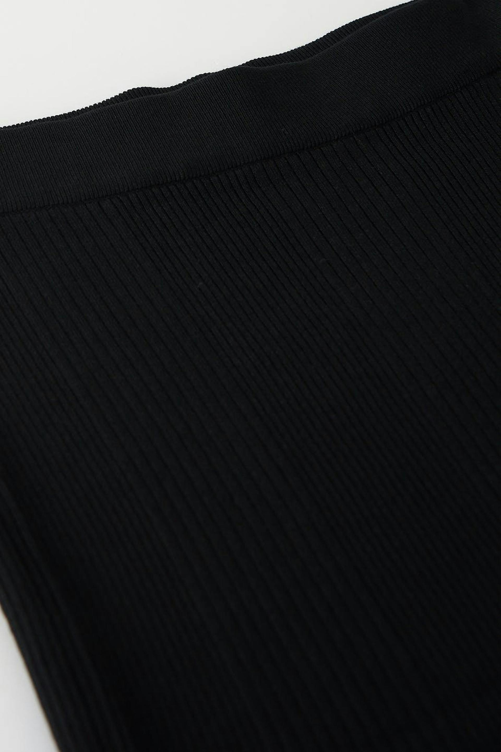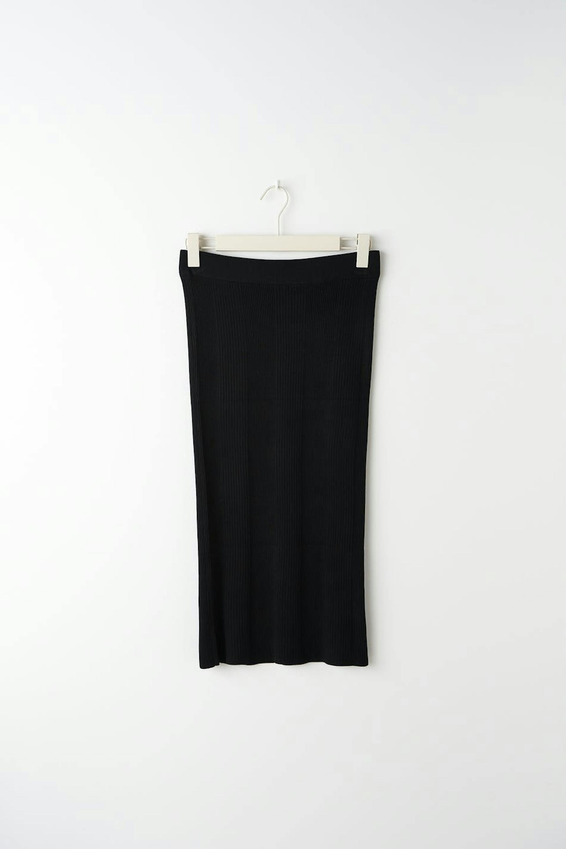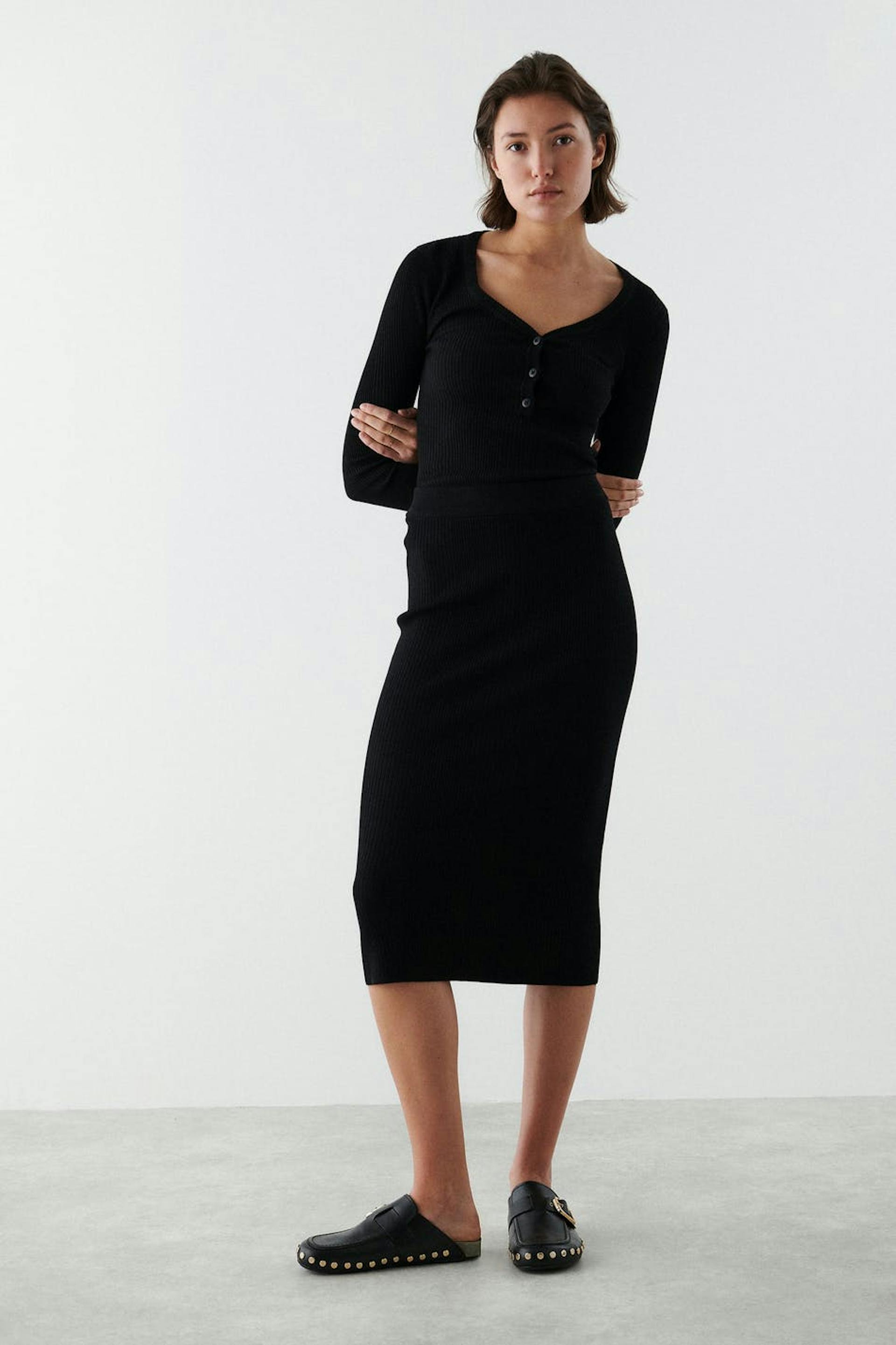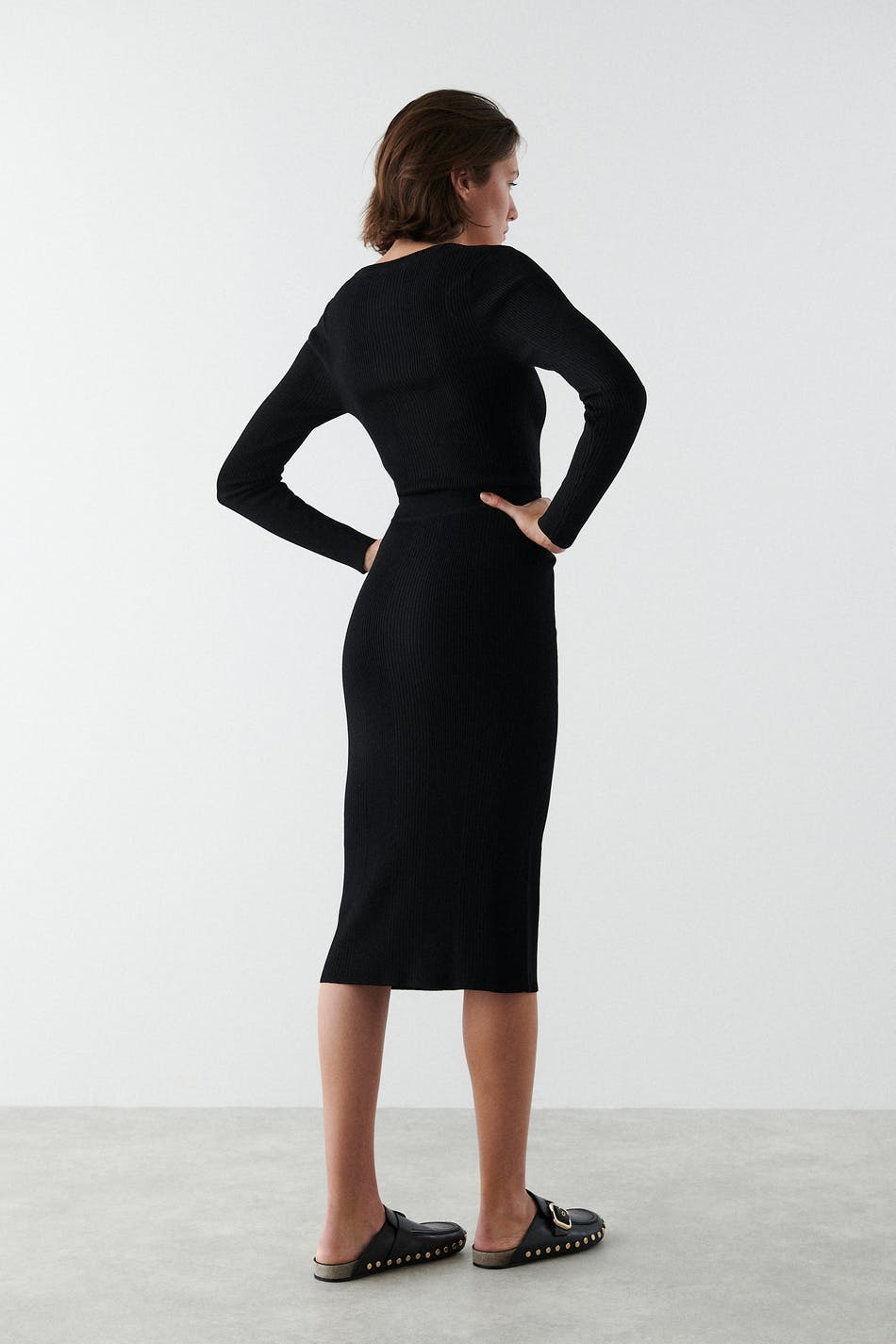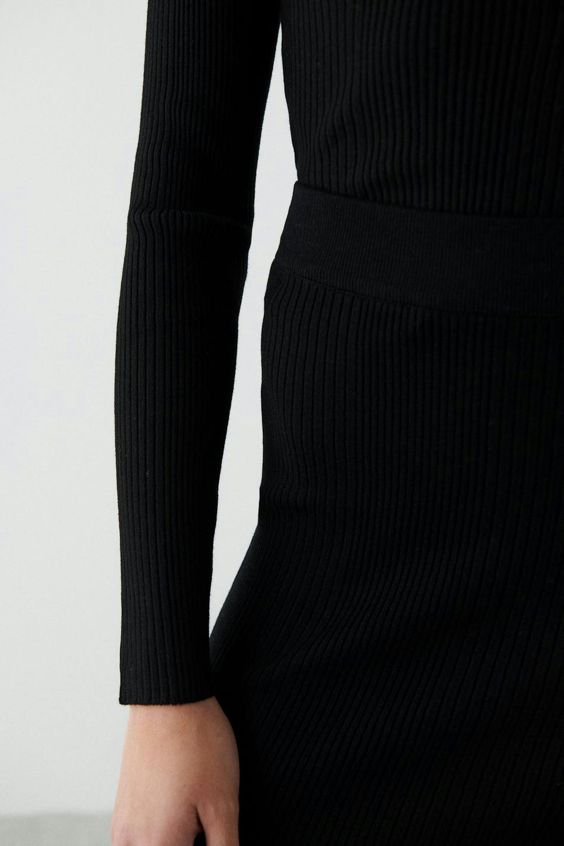 Knitted skirt with fitted fit. The skirt is black and has a ribbed quality with a soft elastic at the waist.