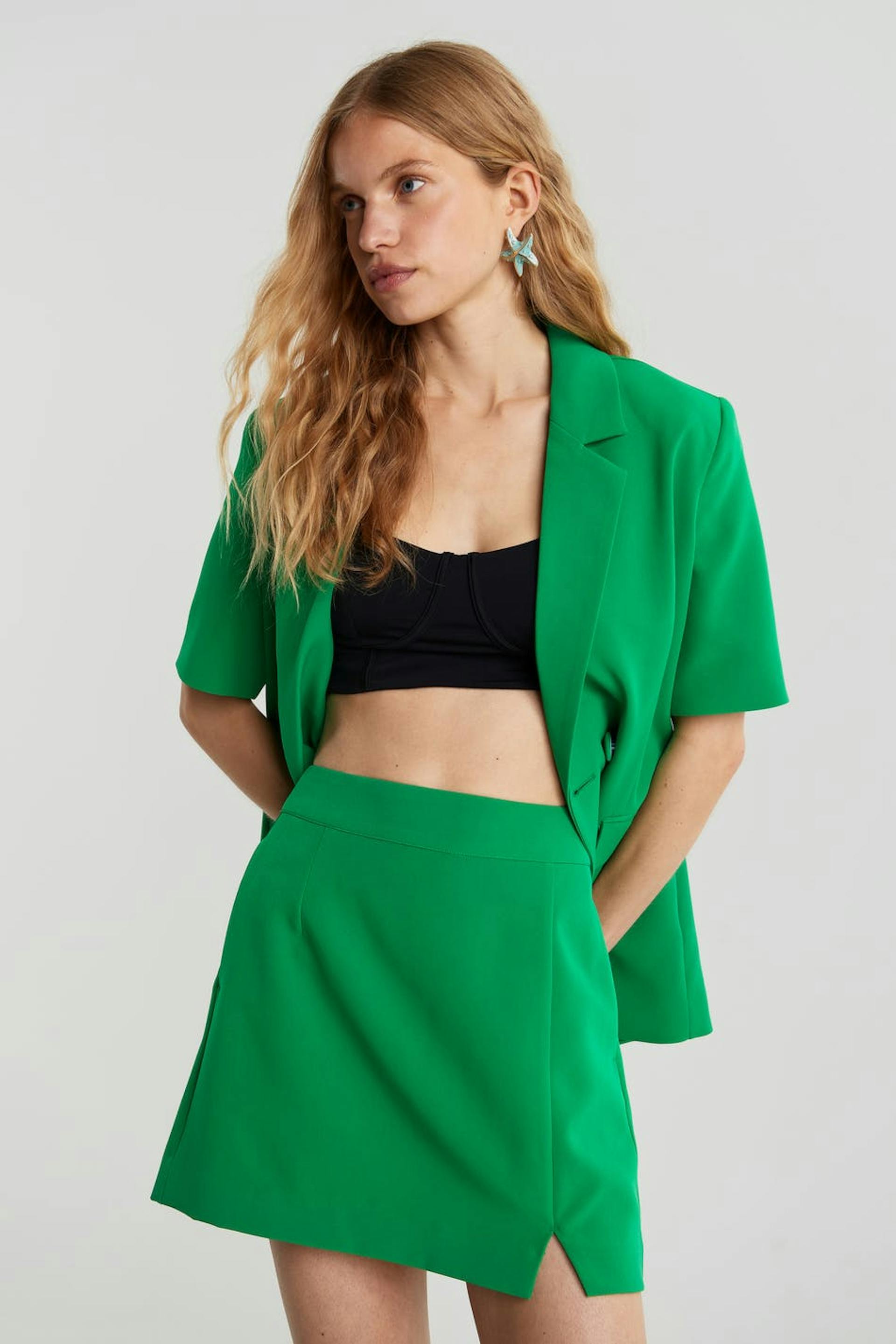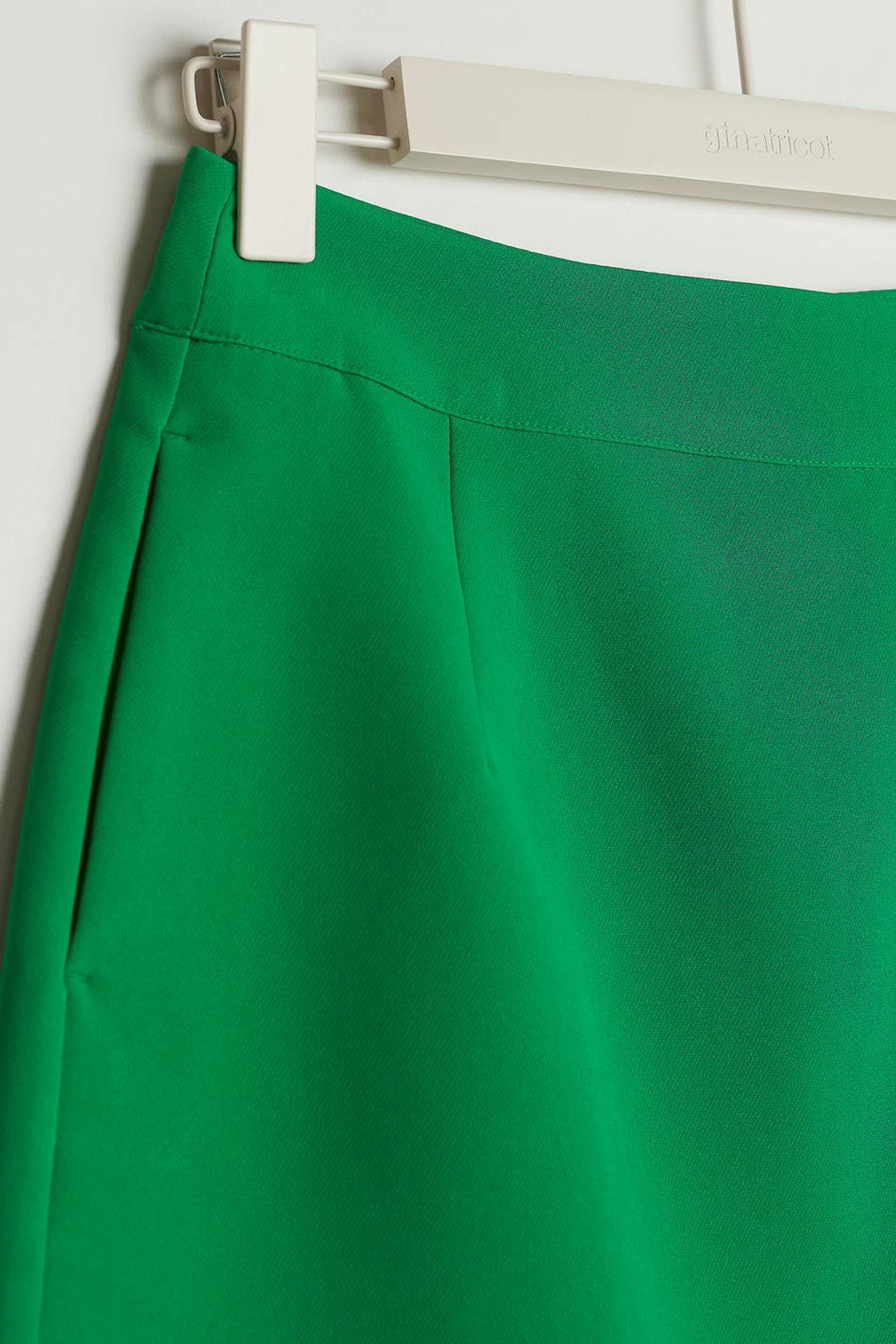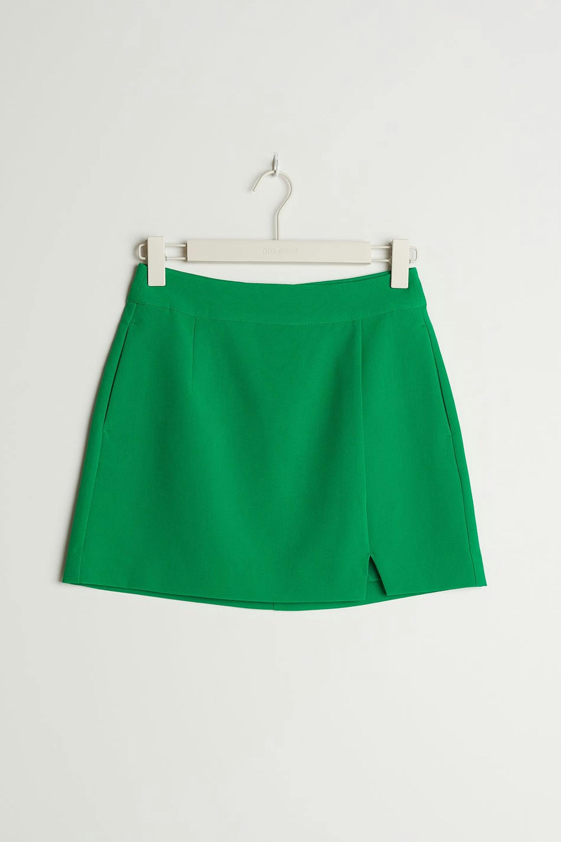 Mini skirt with a small slit at the front. The skirt is green and has a hidden zip at the back. It has side pockets.