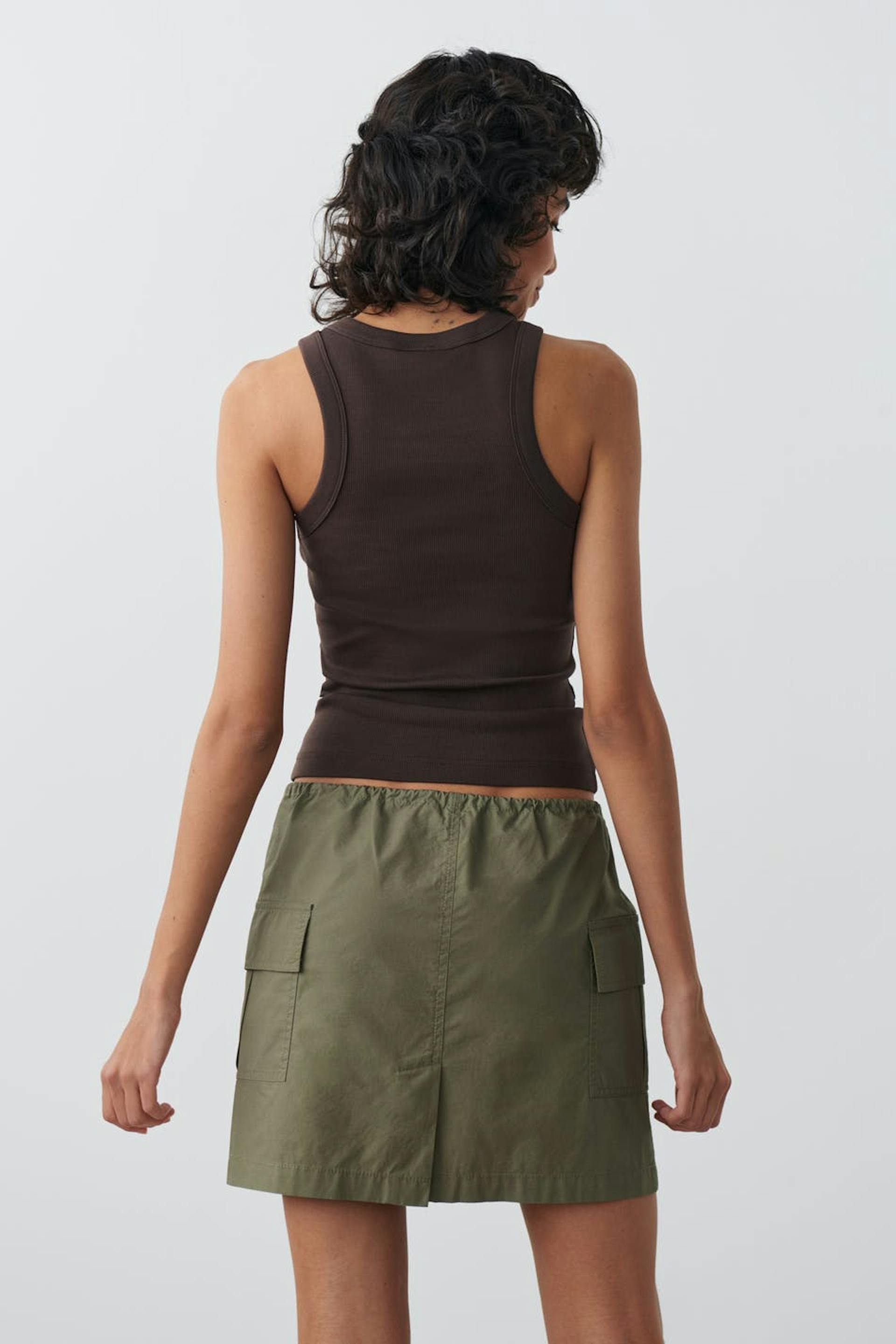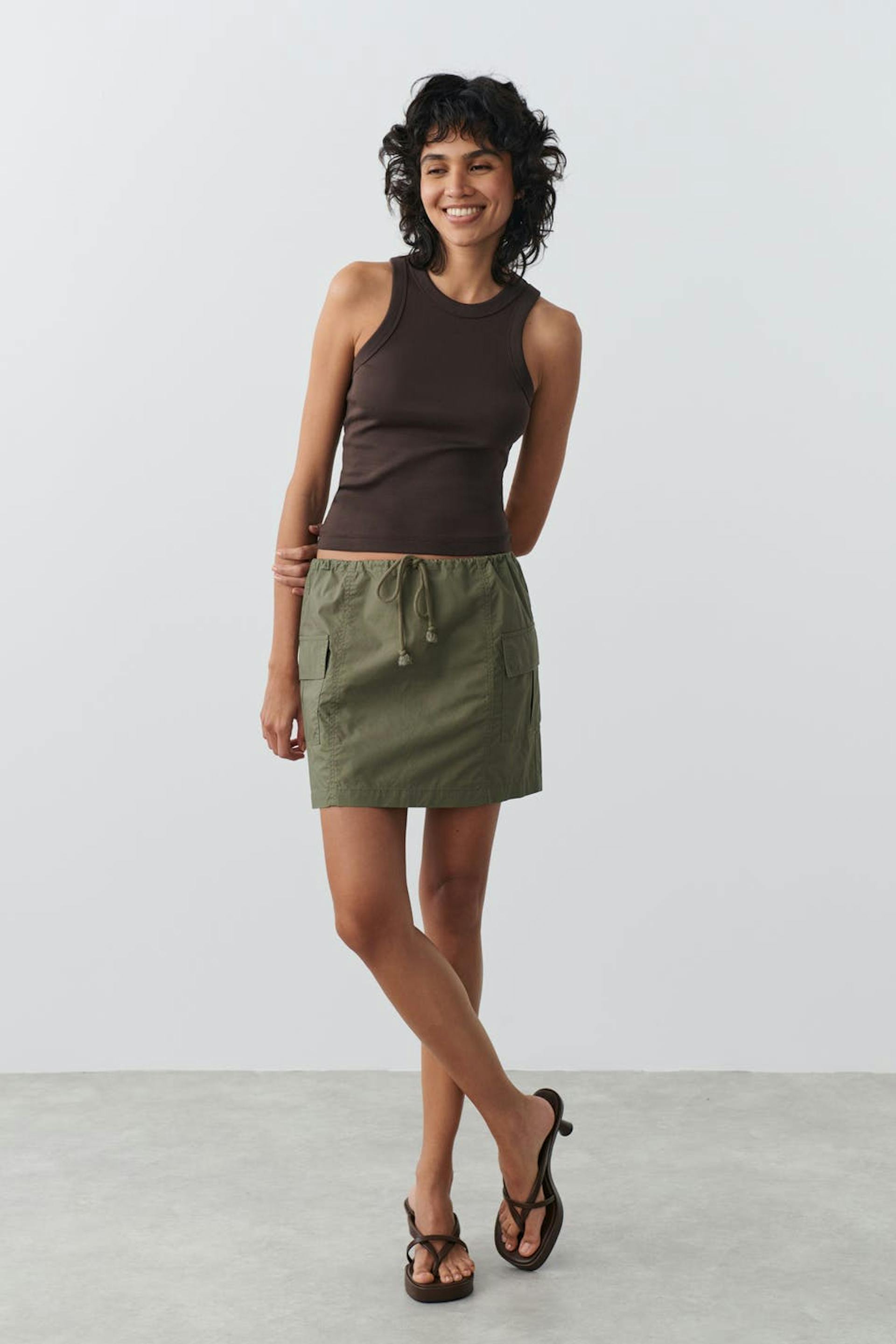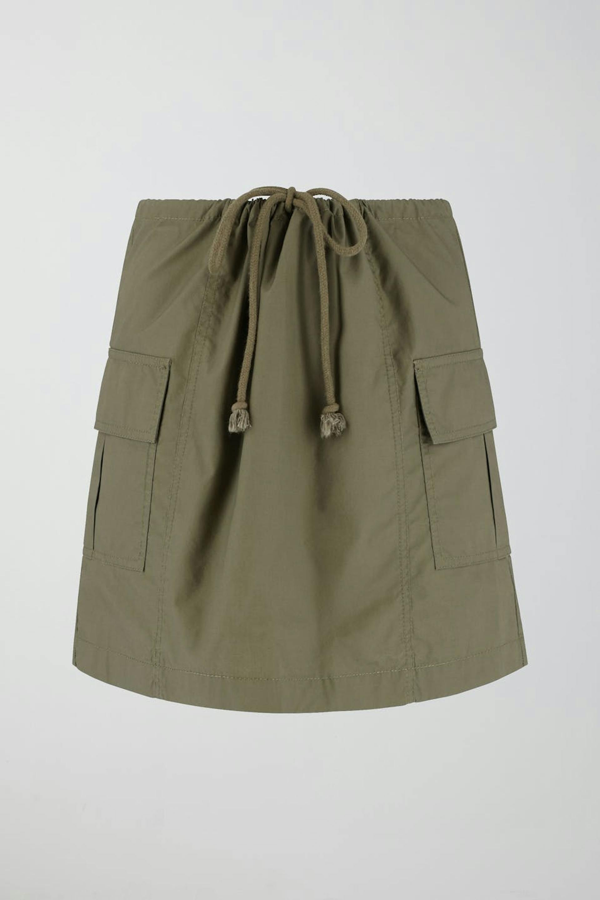 Short skirt with figure-hugging fit. The skirt is green and has cargo pockets on the sides with a small slit at the back. It has a drawstring with self-tie at the waist.