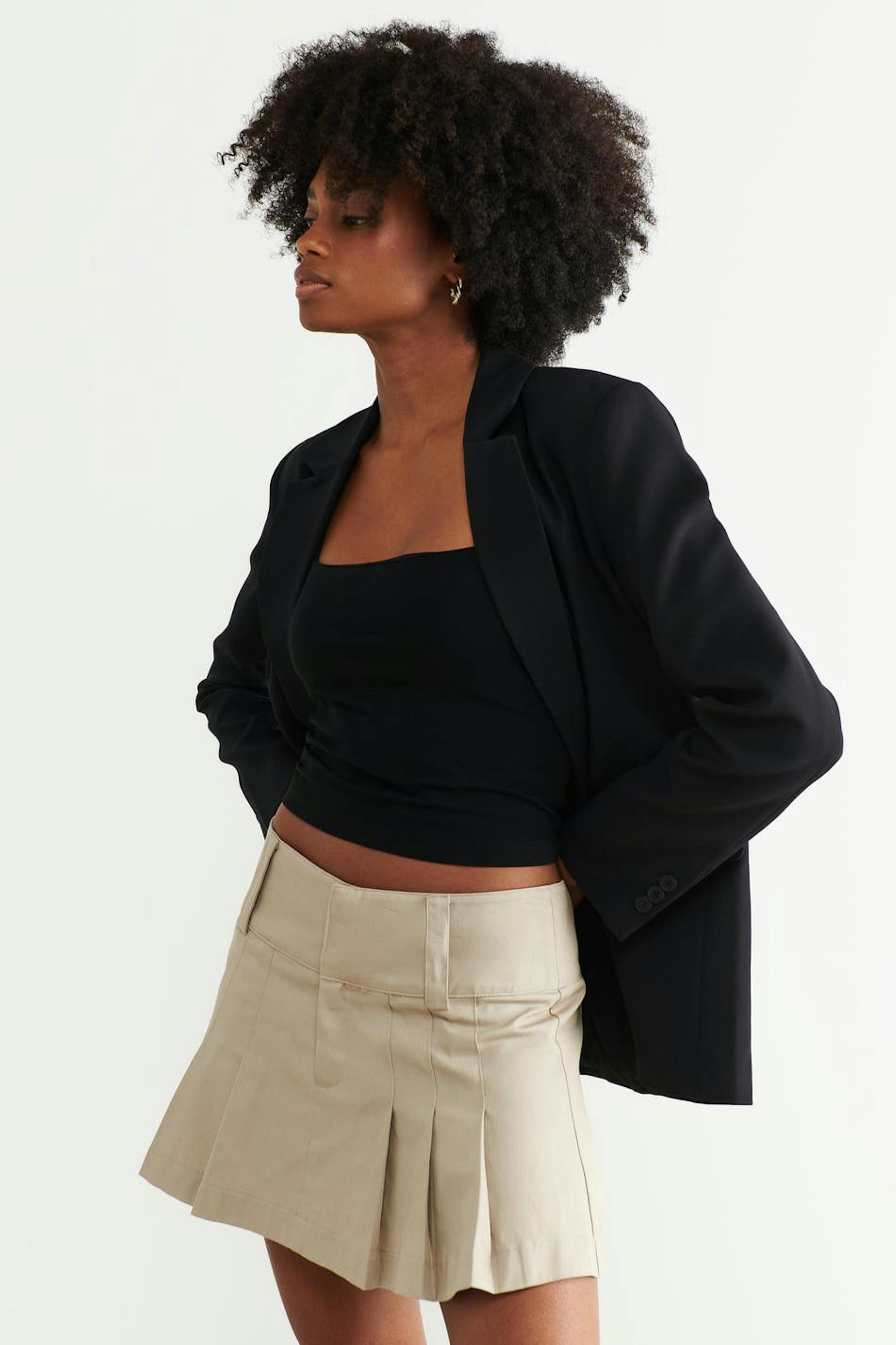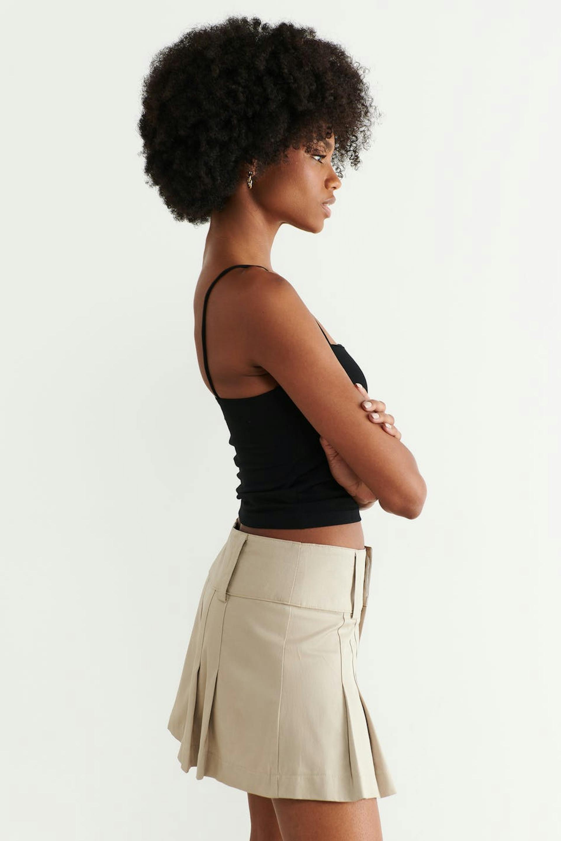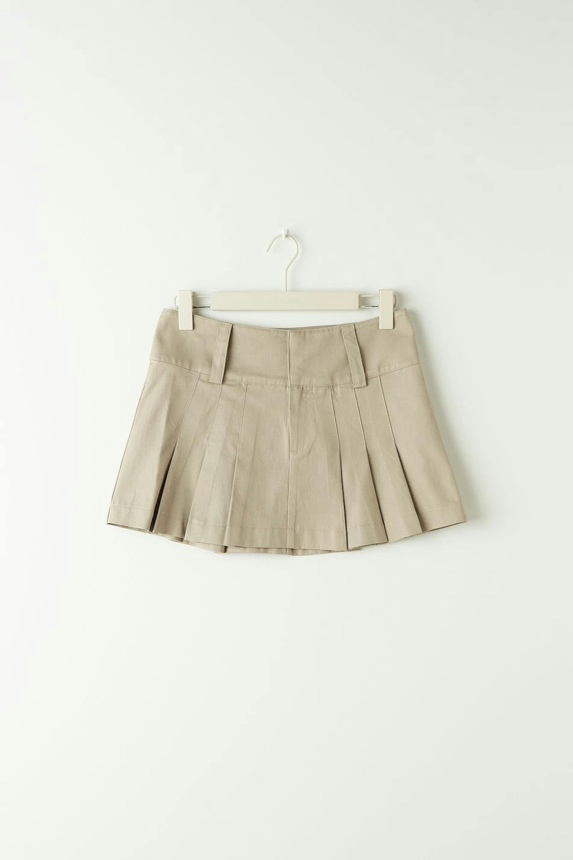 Low-waisted mini skirt with pleats at the front and back. The skirt is beige and has zip fly. It has a broad waistband with belt loops.