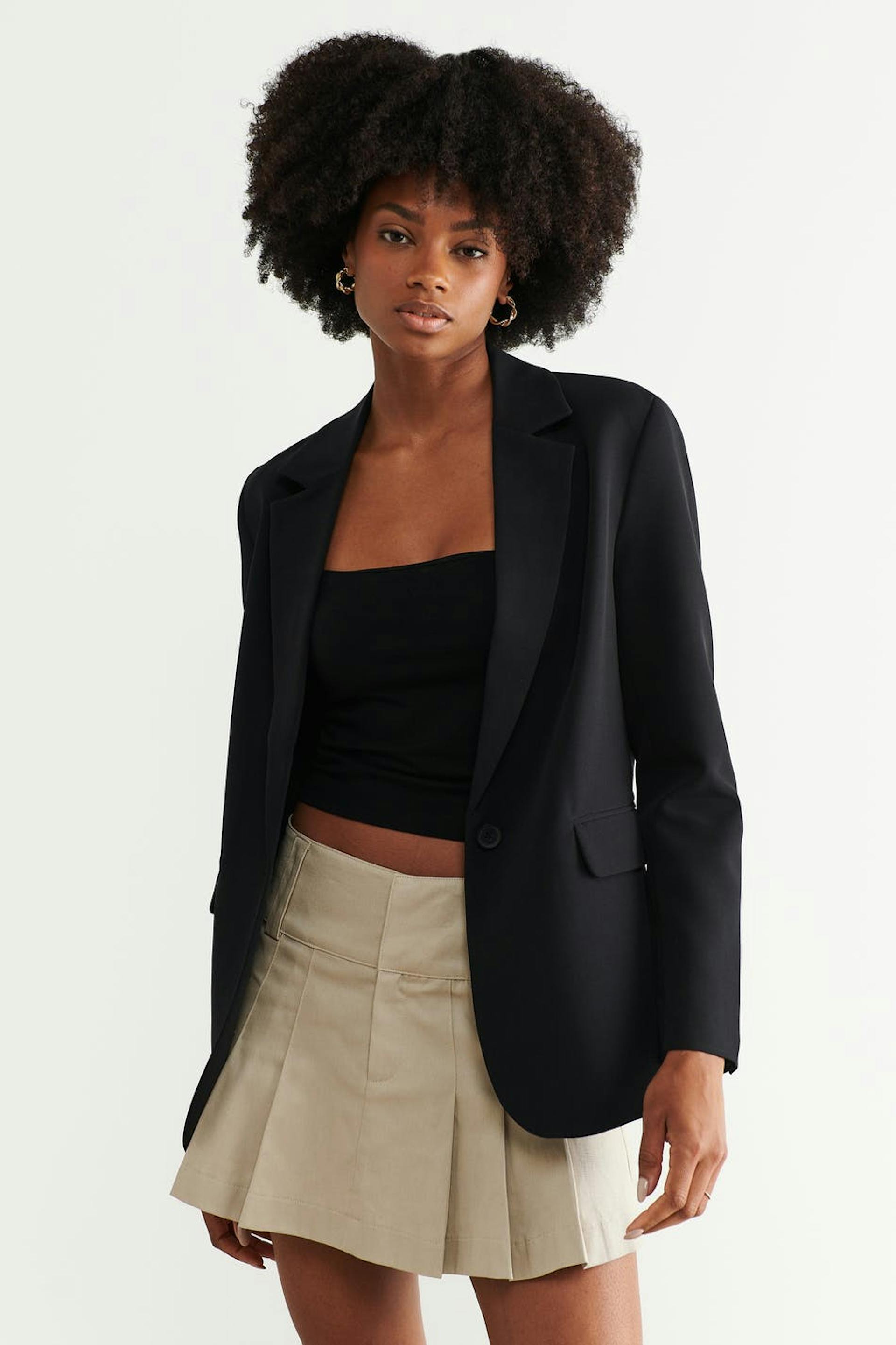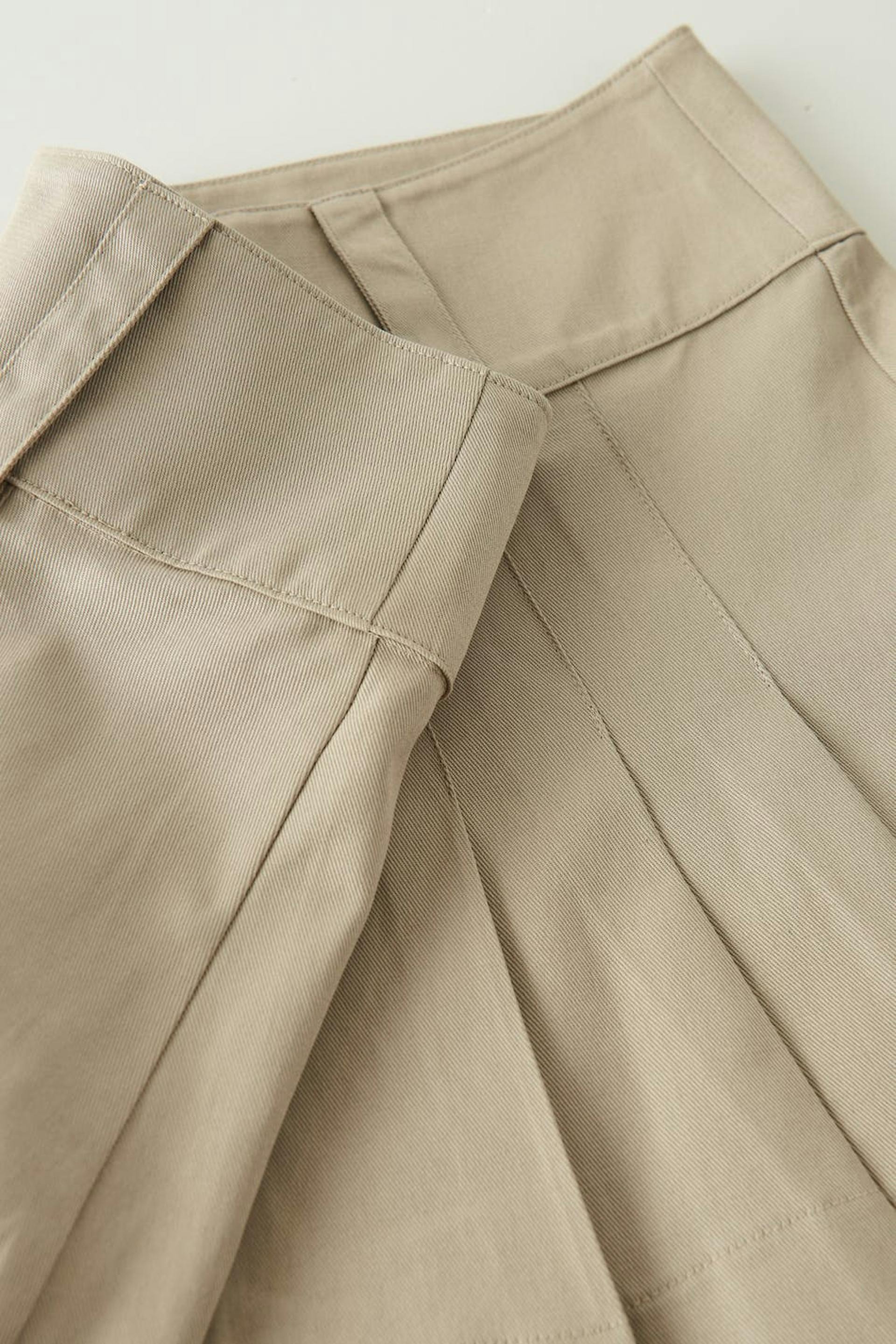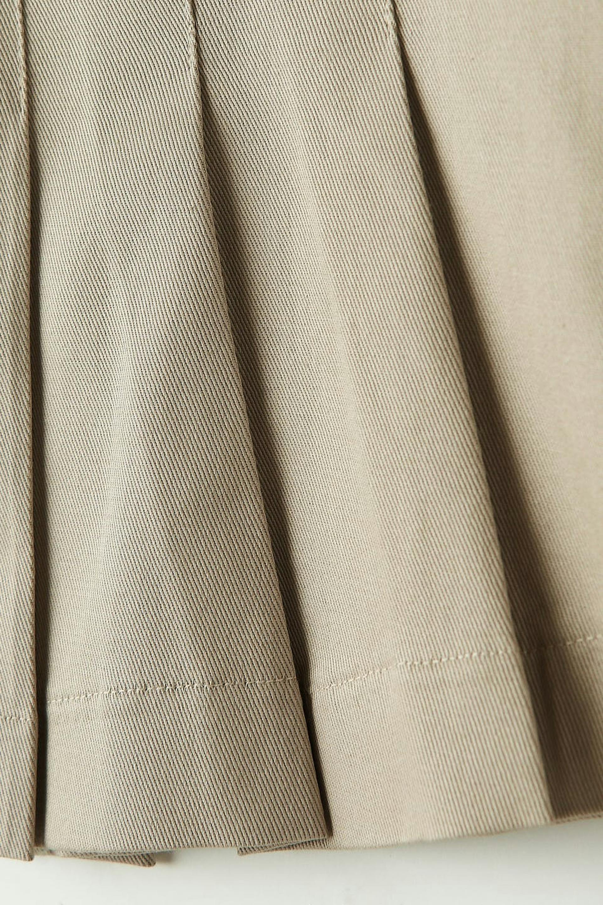 Low-waisted mini skirt with pleats at the front and back. The skirt is beige and has zip fly. It has a broad waistband with belt loops.