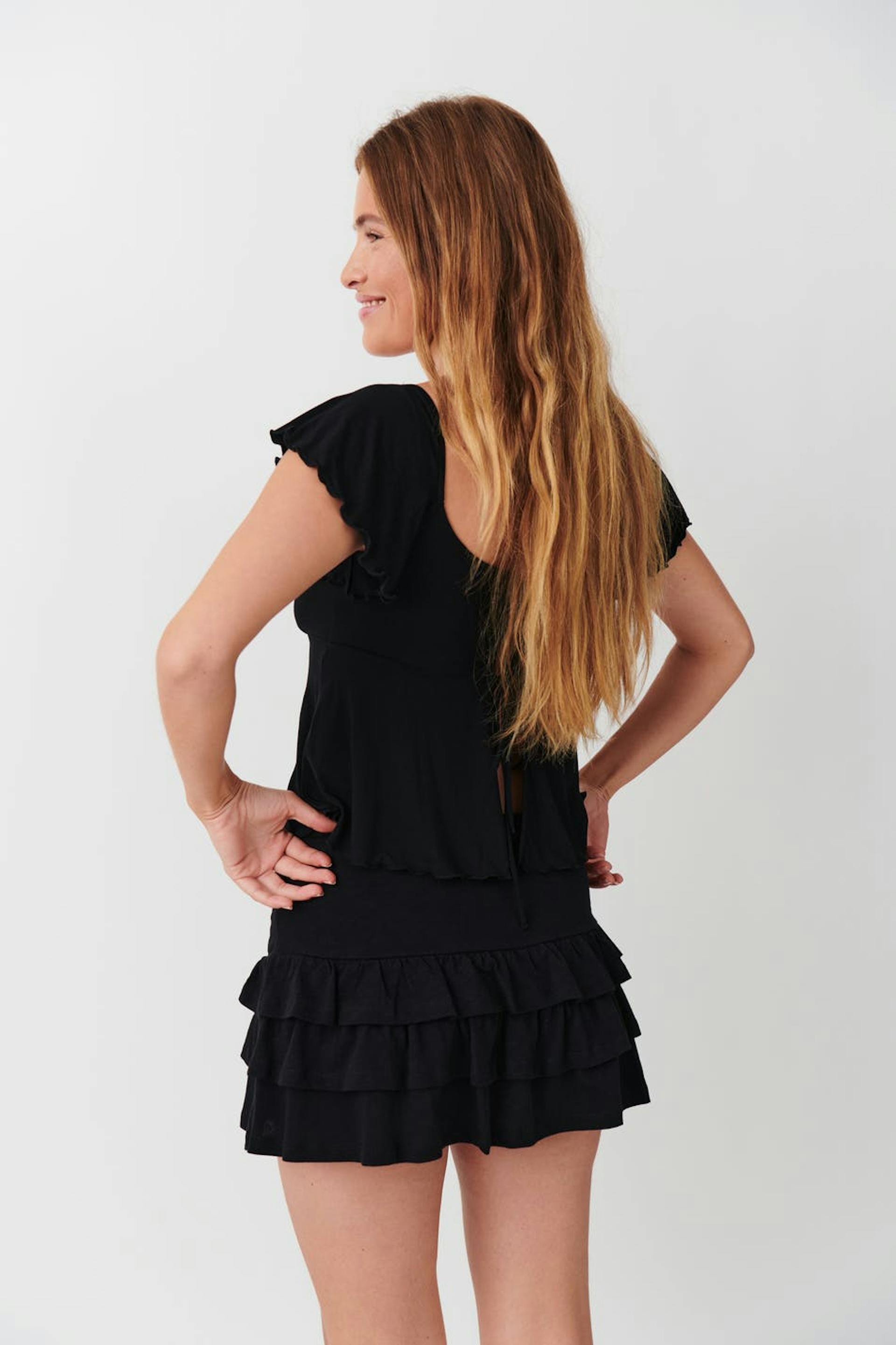 Short frill skirt with low waist. The skirt is black and has self-tie at the front. It has regular fit and elastic at the waist.