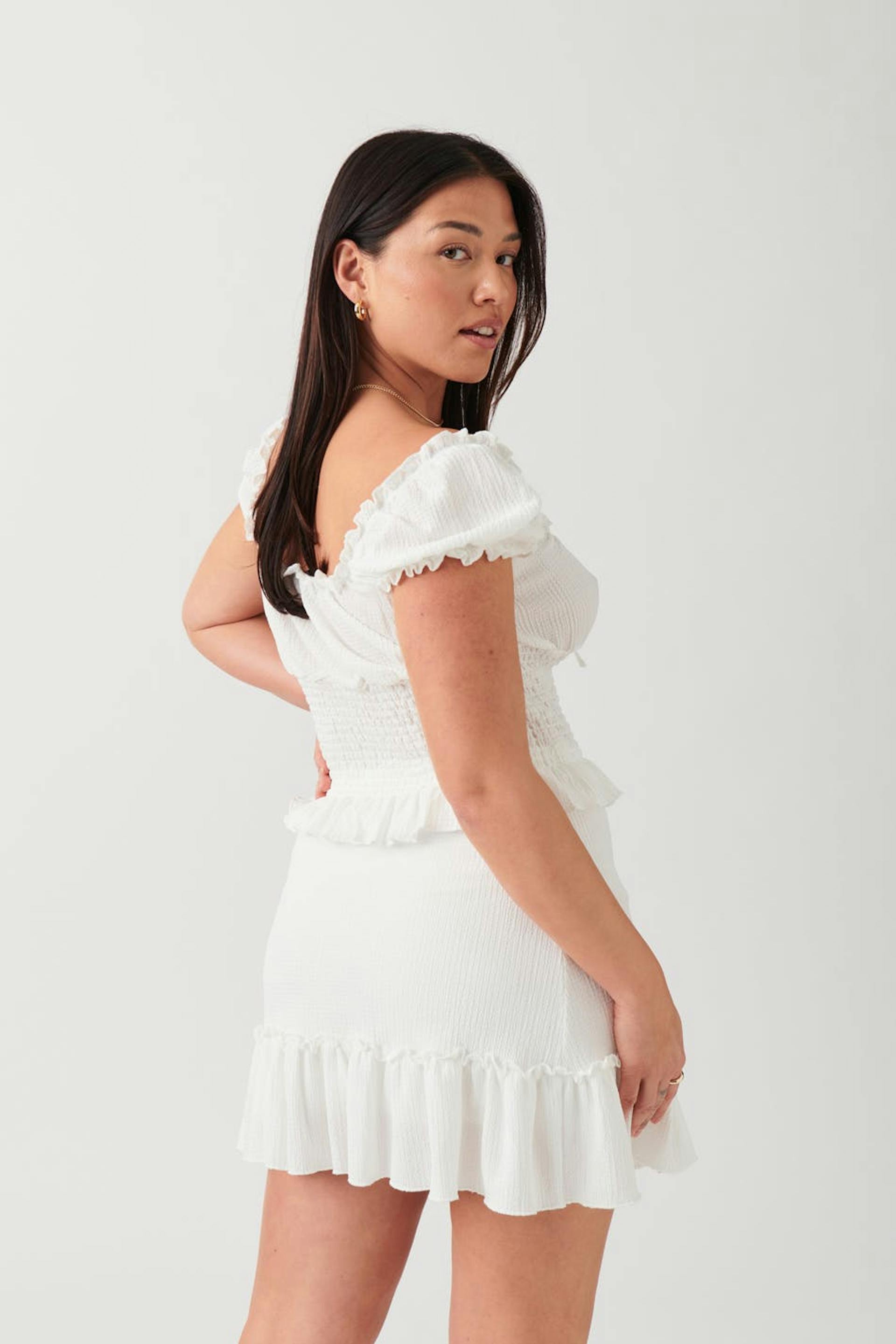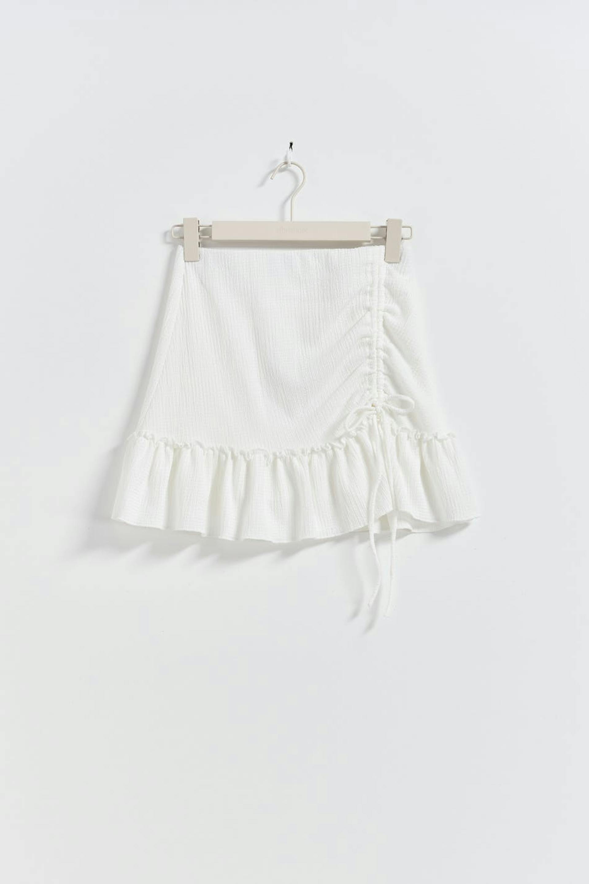 Ruched mini skirt with frill at the bottom. The skirt is white and has regular waist. It has figure-hugging fit, slit at the front, soft elastic at the waist and drawstring with self-tie at the side.
