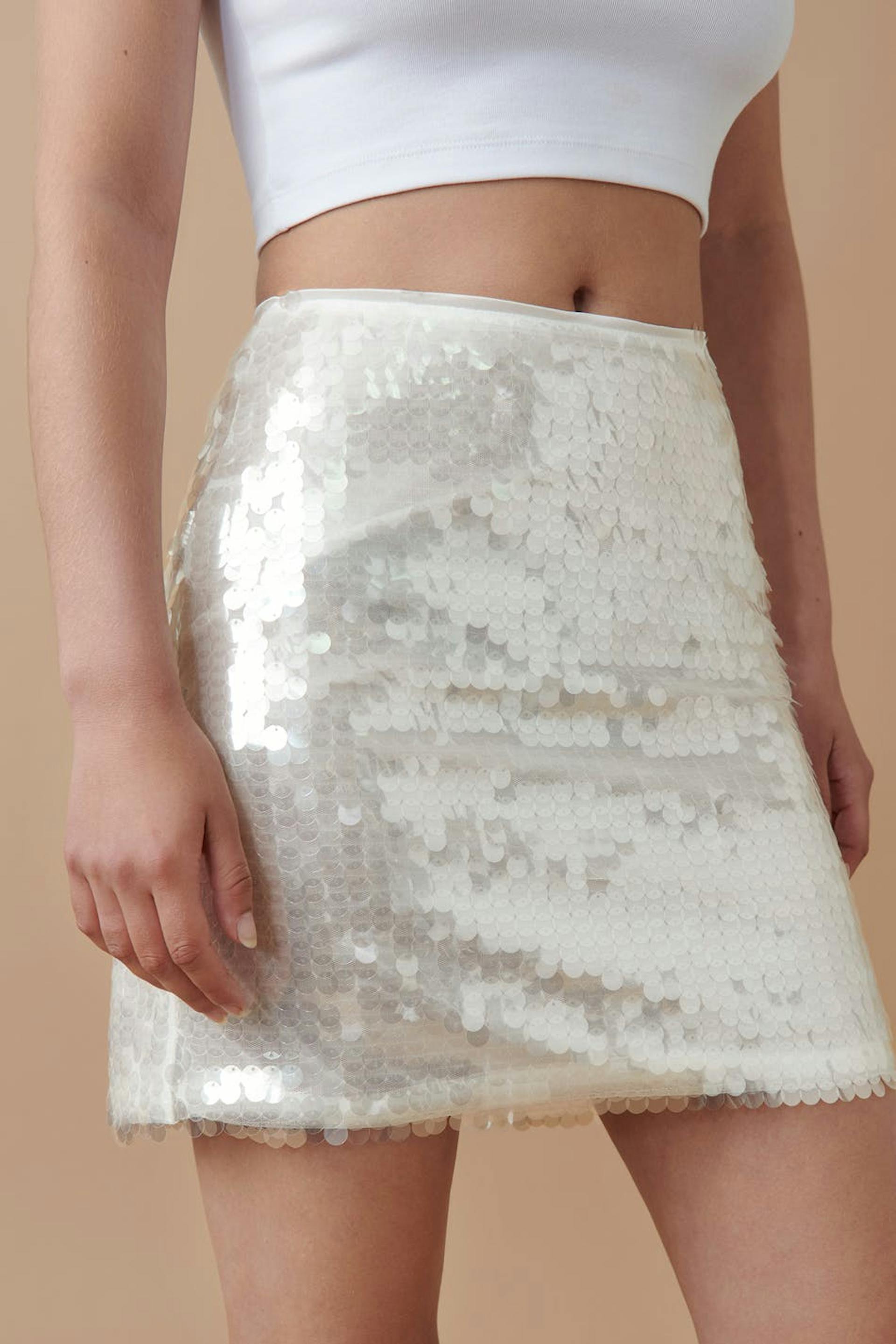 Short sequin skirt with figure-hugging fit. The skirt is silver coloured, woven and fully lined. It has round sequins and zip in the side seam.