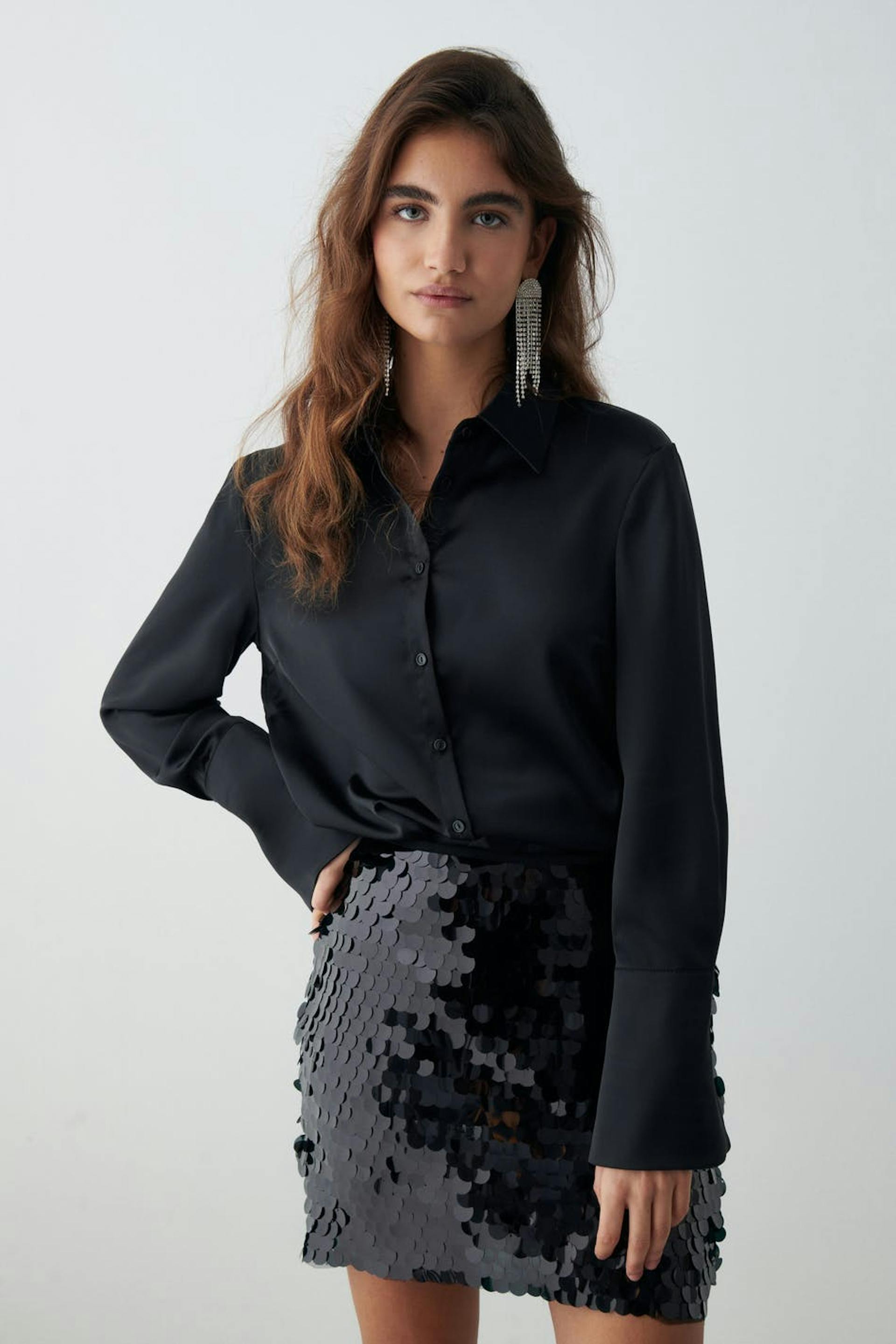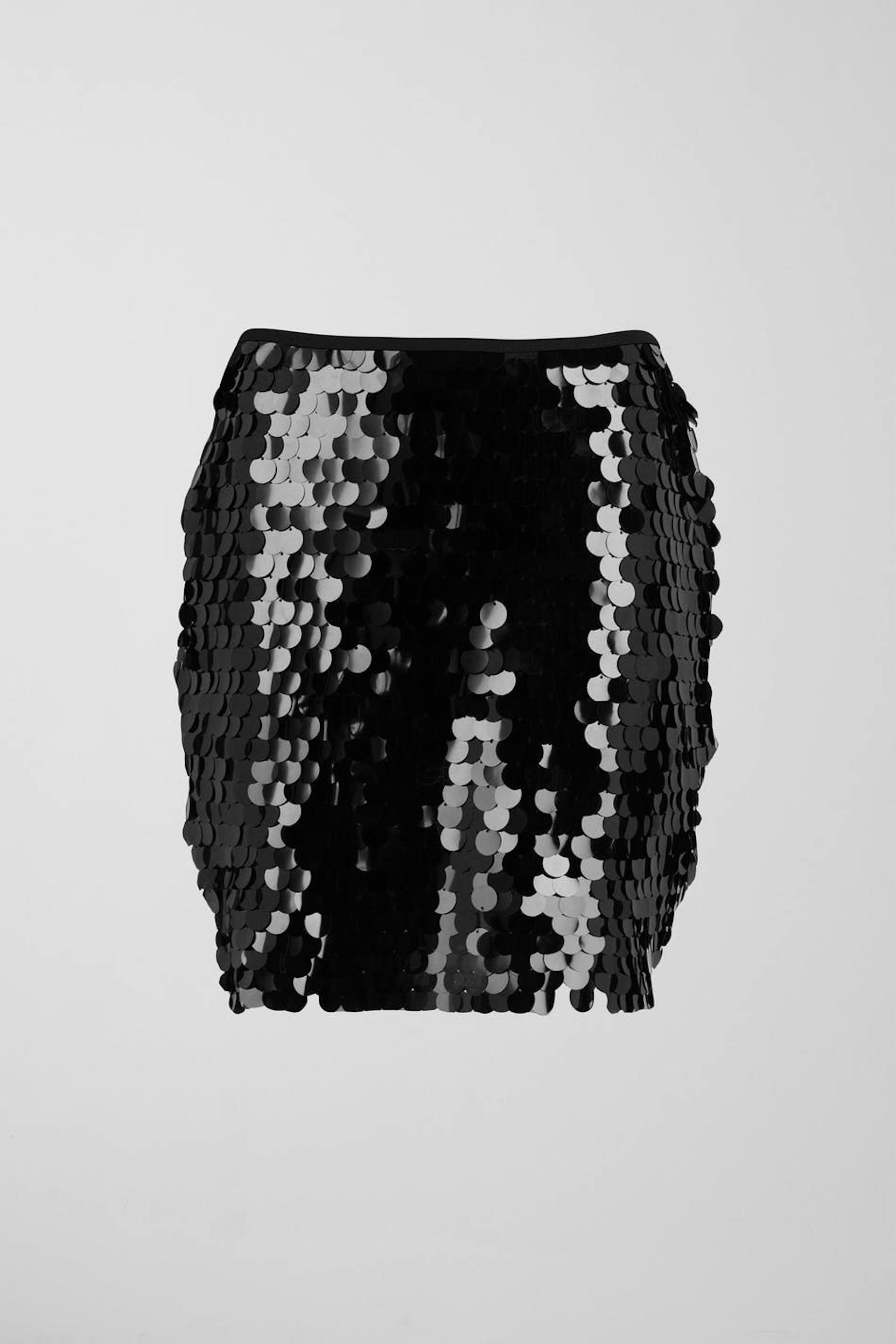 Short skirt with big sequins. The skirt is black and has zip at the back.