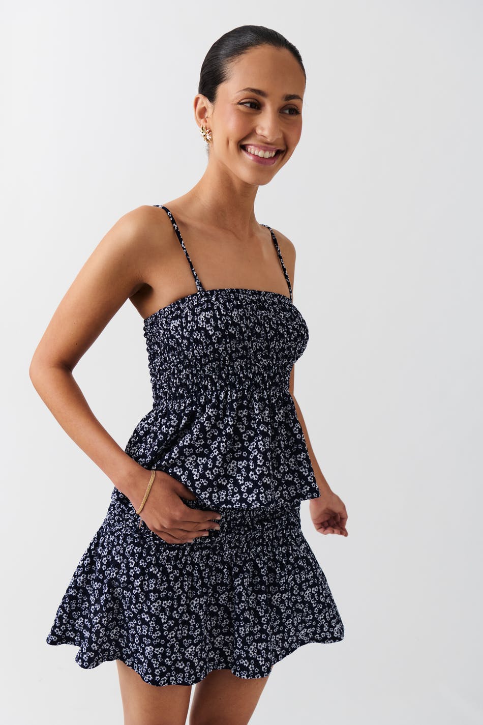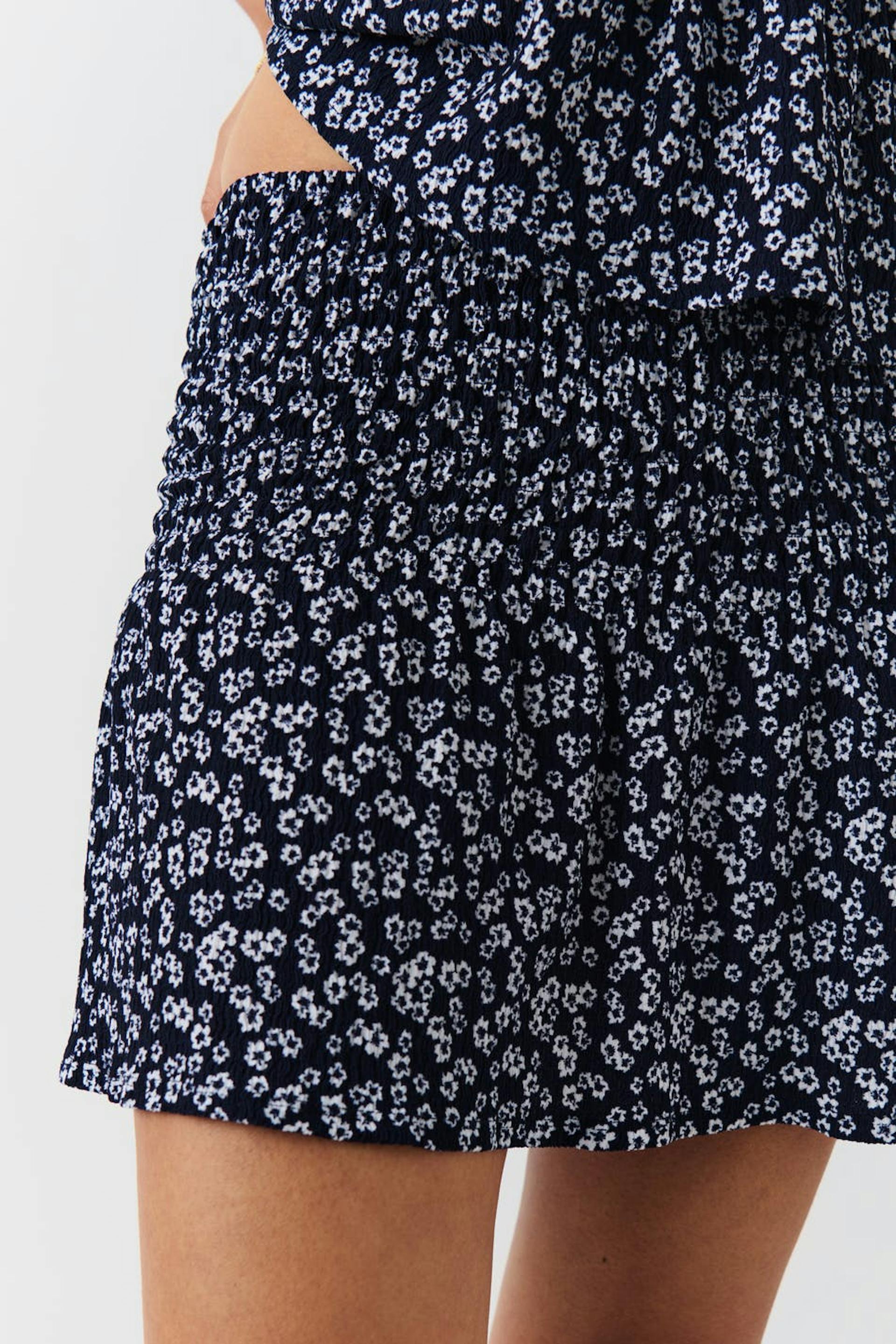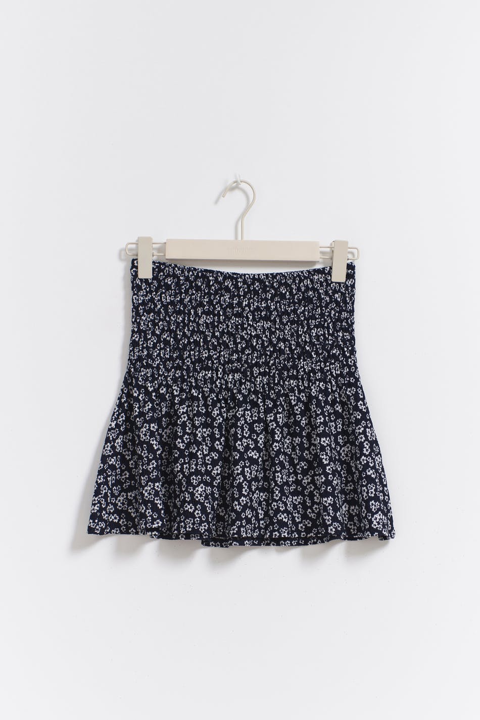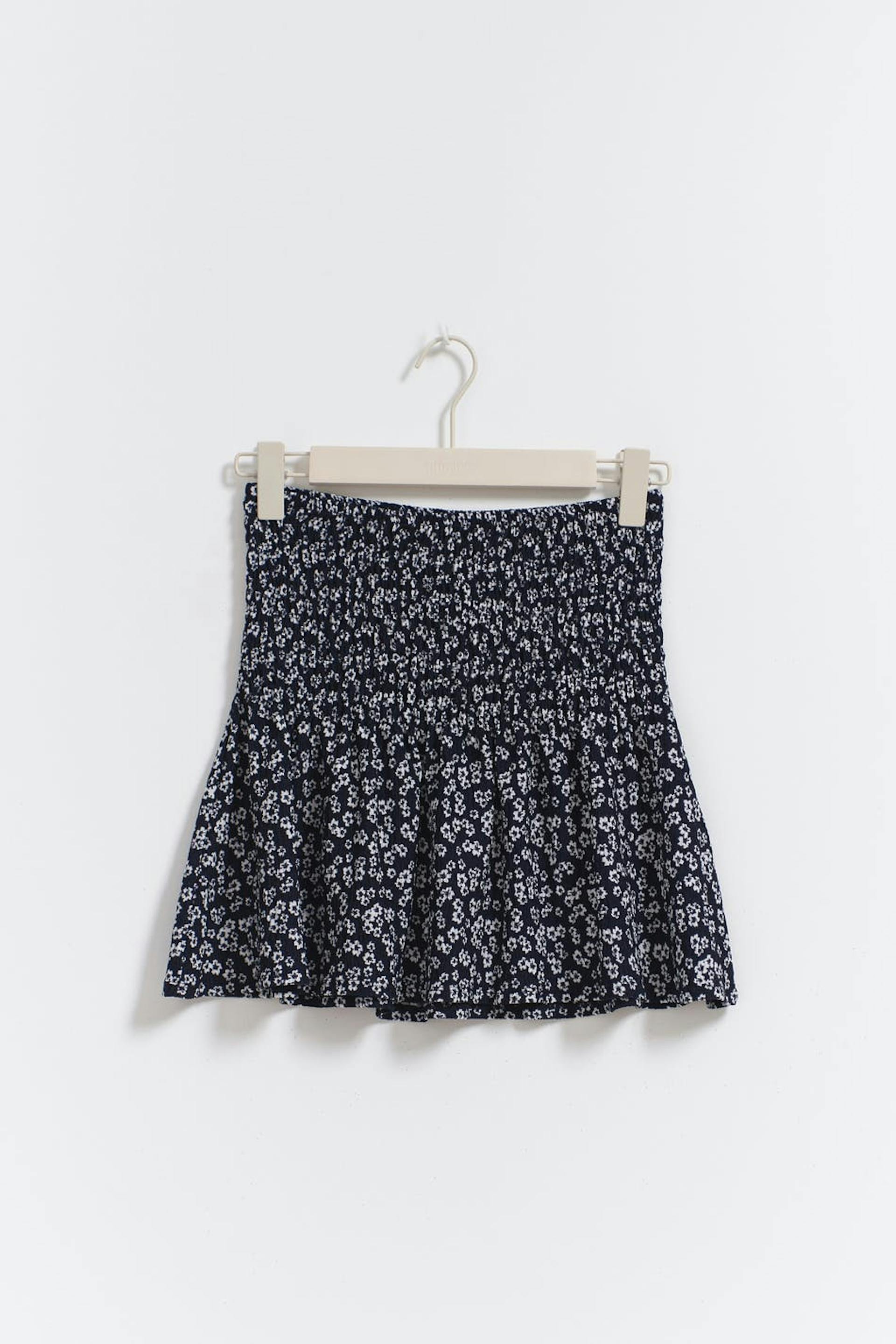 Short skirt in jersey with smocking at the waist. The skirt is blue and has structured material. It has low waist, gathered seam at the top and flared hem.