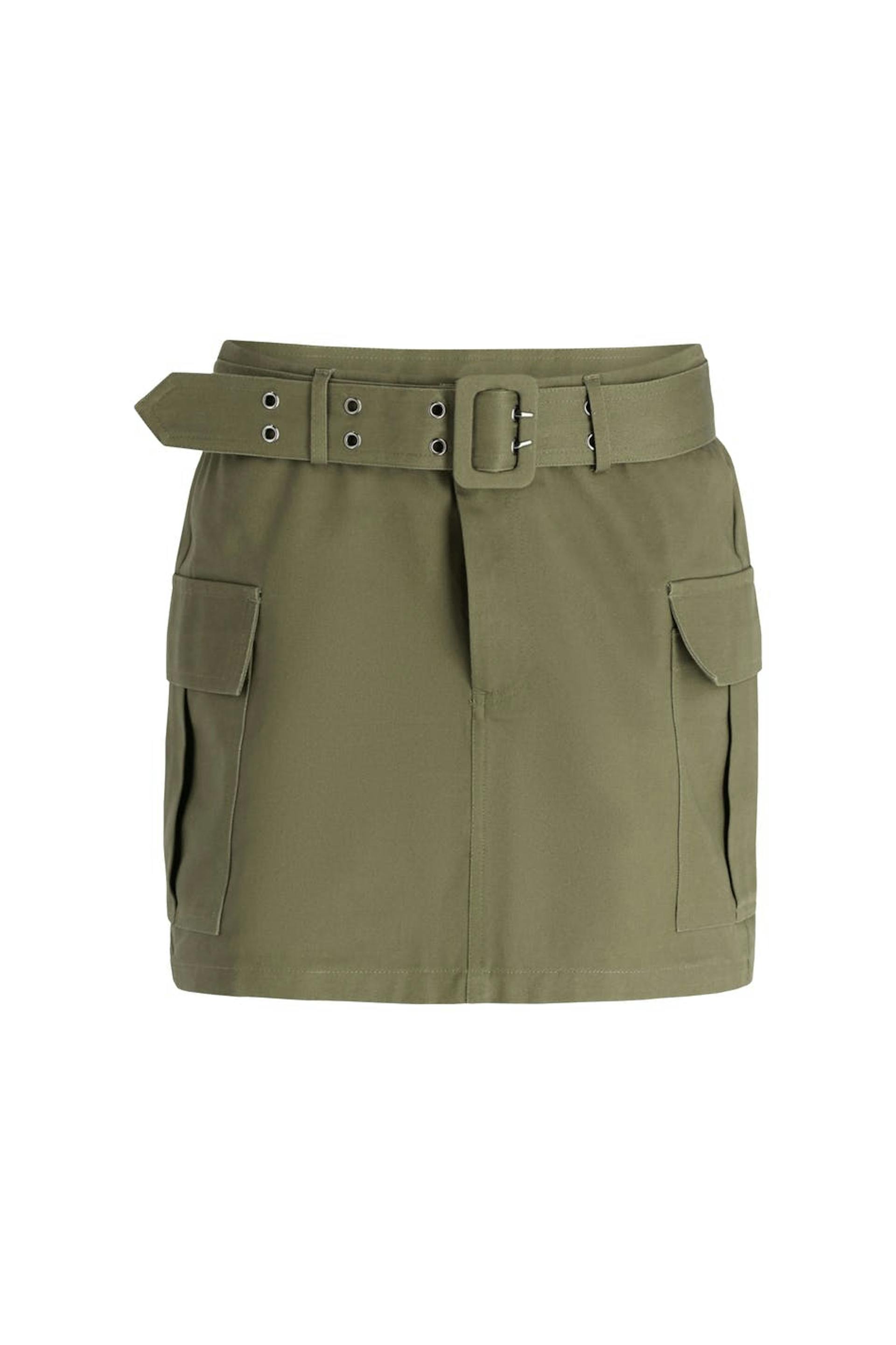 Short cargo skirt with belt at the waist. The skirt is green and has a woven, stiff quality. It has high waist, cargo pockets in the sides, belt loops and zip fly.