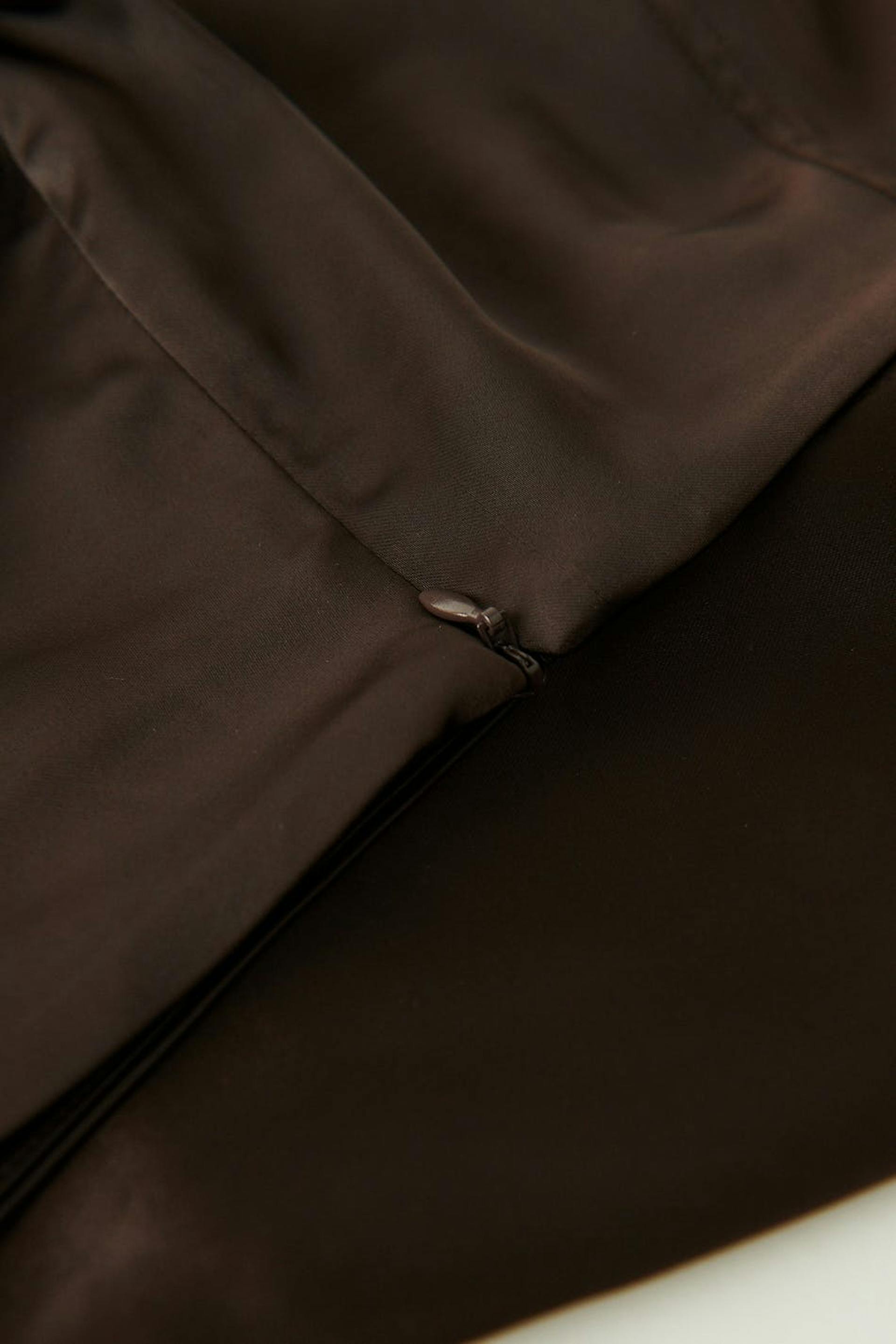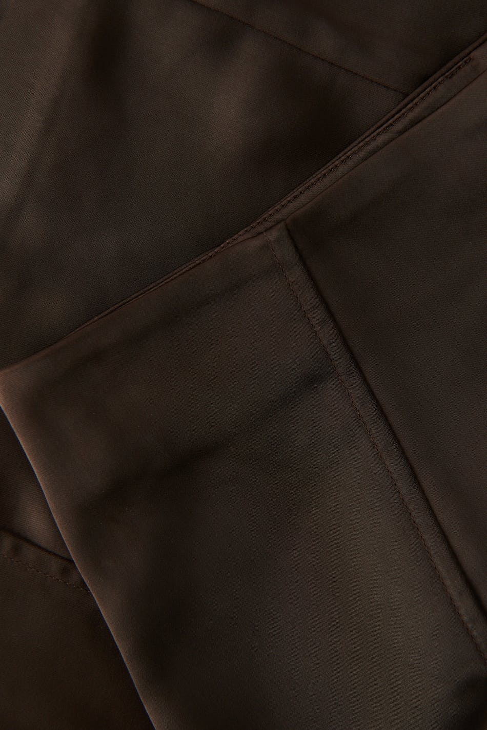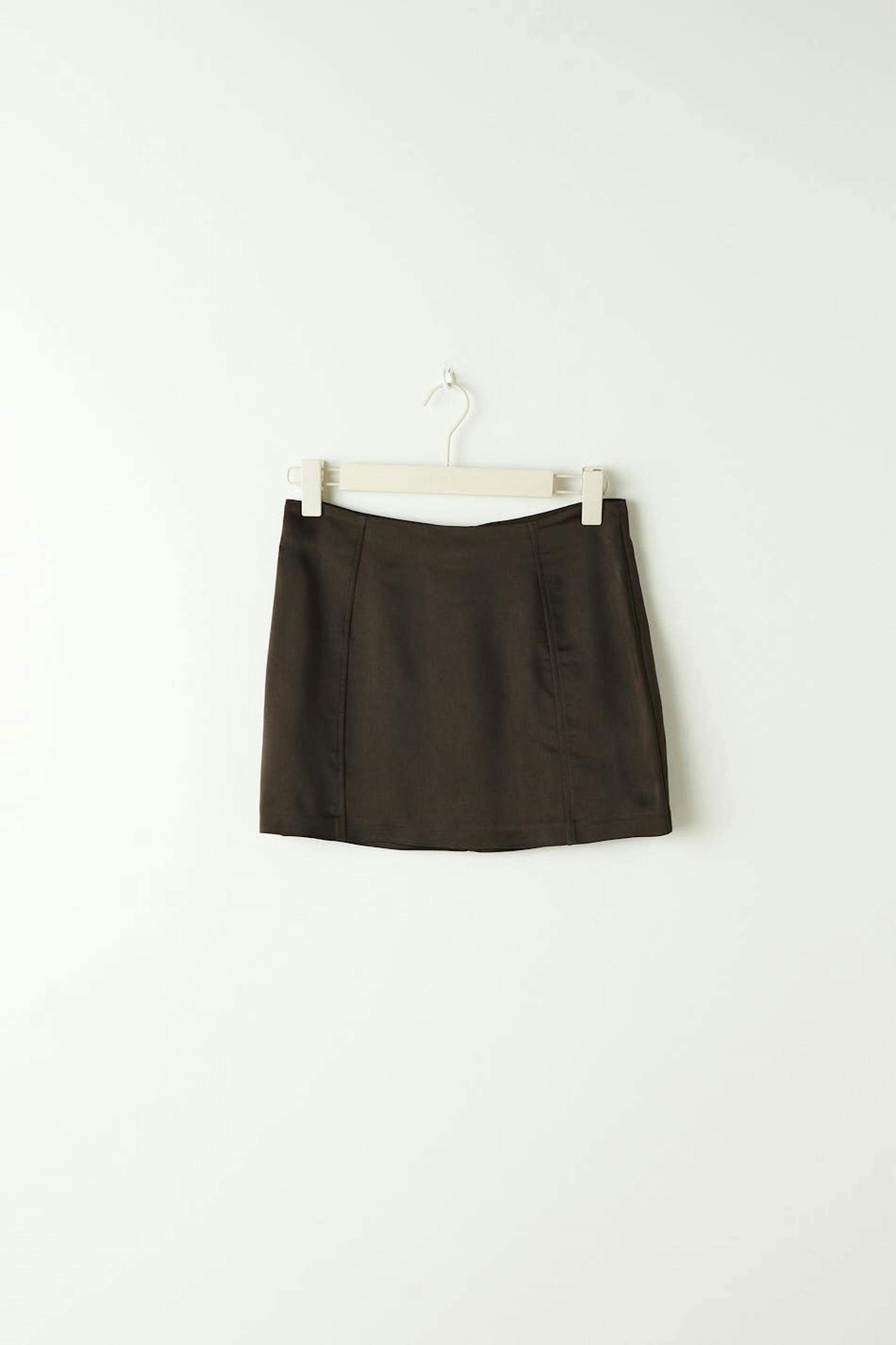 Mini skirt with low waist. The skirt is brown and has a slim fit. It has decorative seams in front and hidden zip at the back.