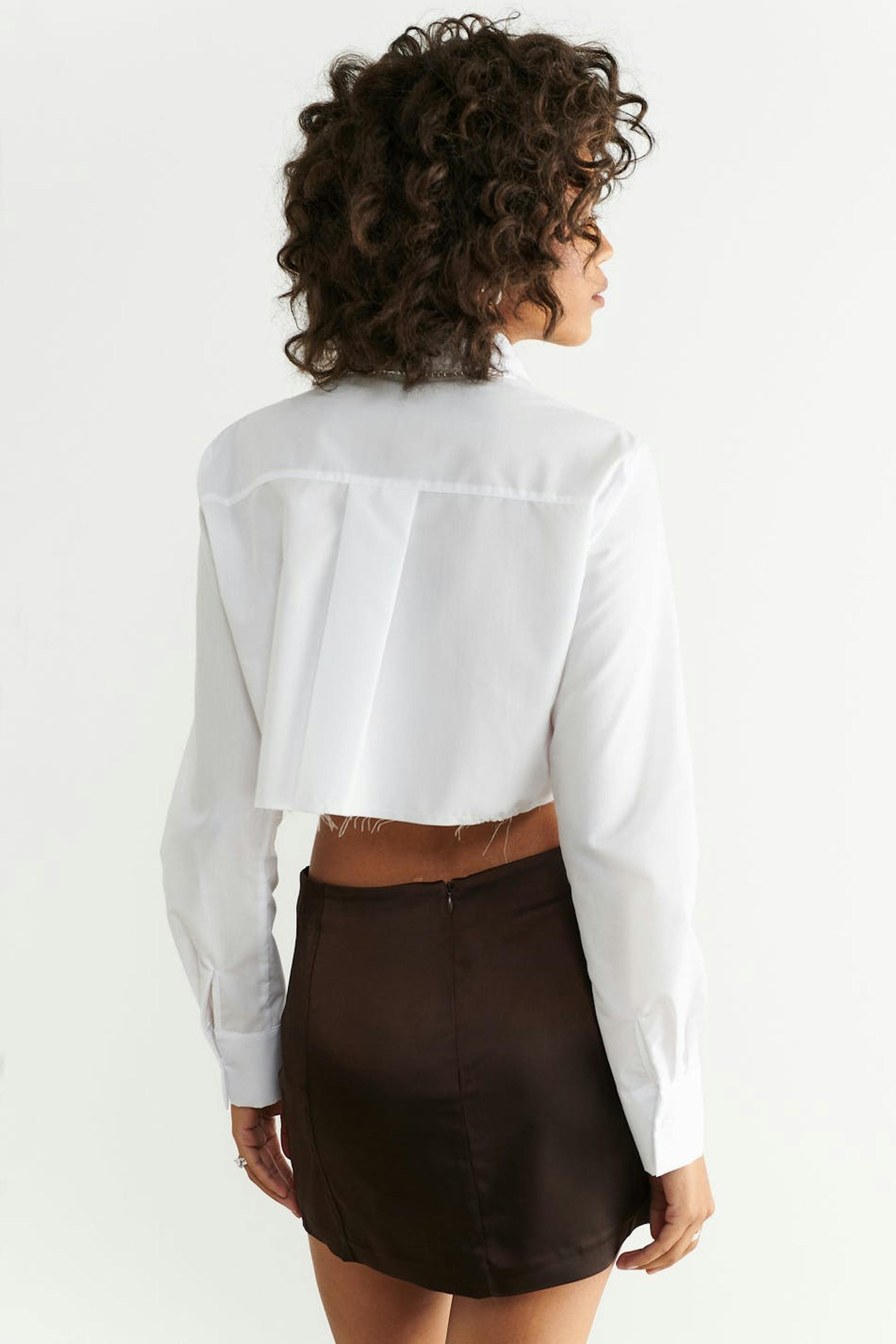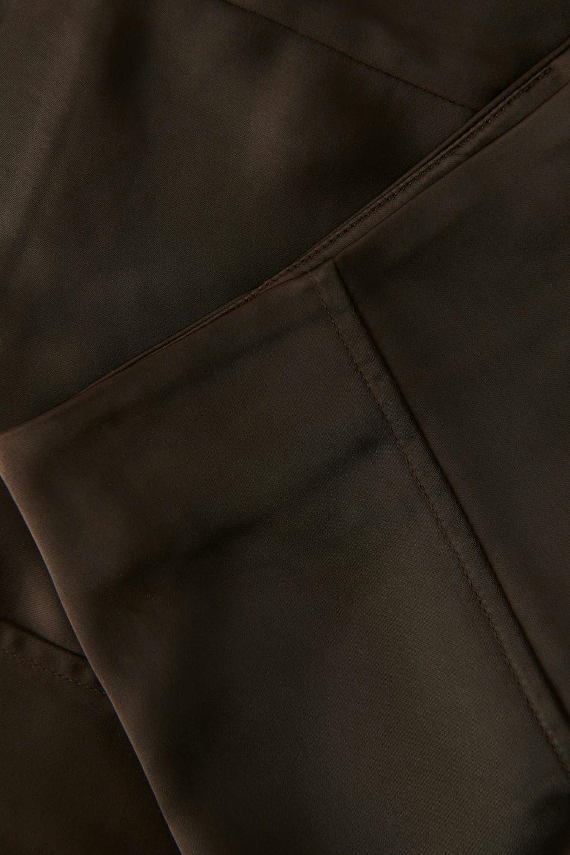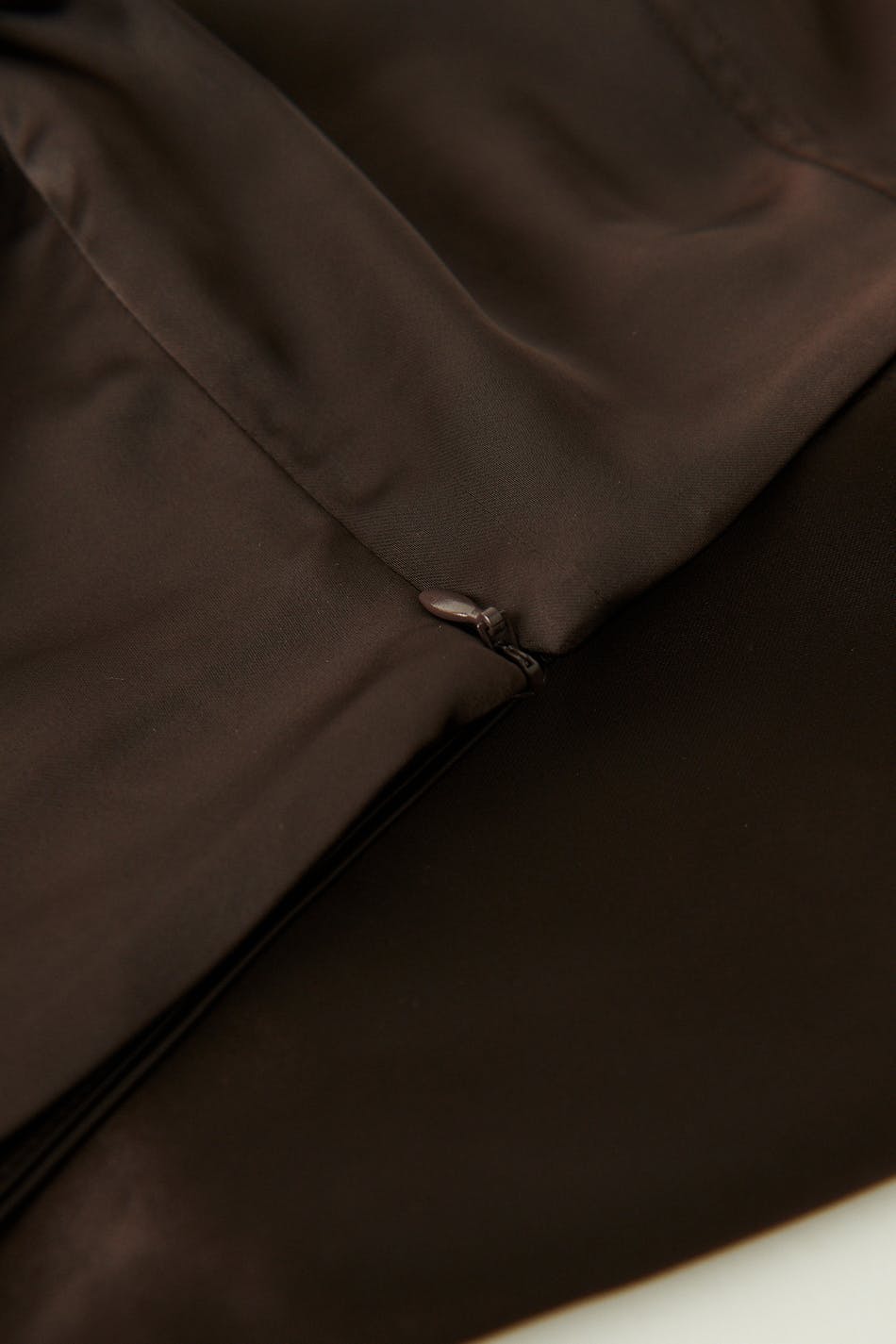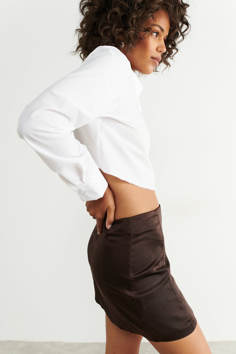 Mini skirt with low waist. The skirt is brown and has a slim fit. It has decorative seams in front and hidden zip at the back.