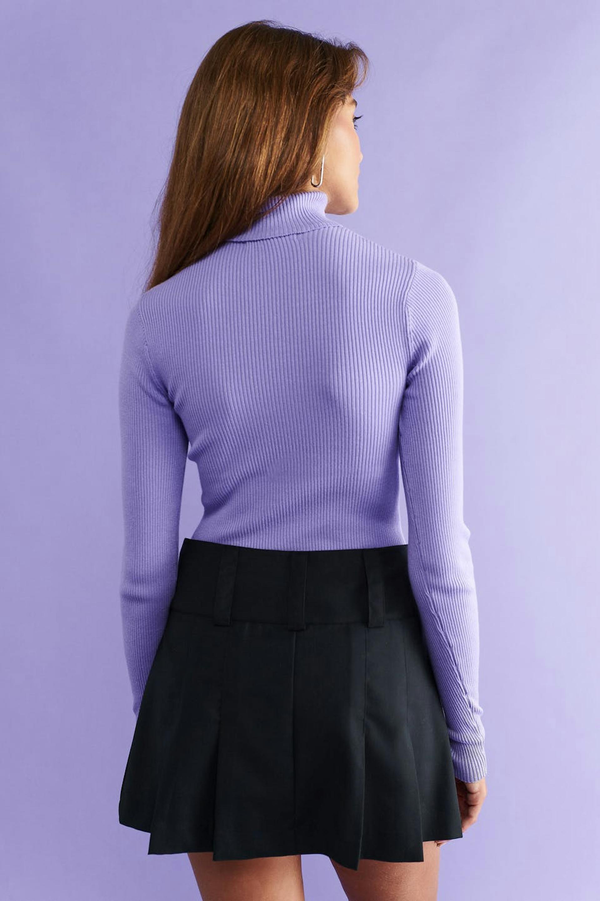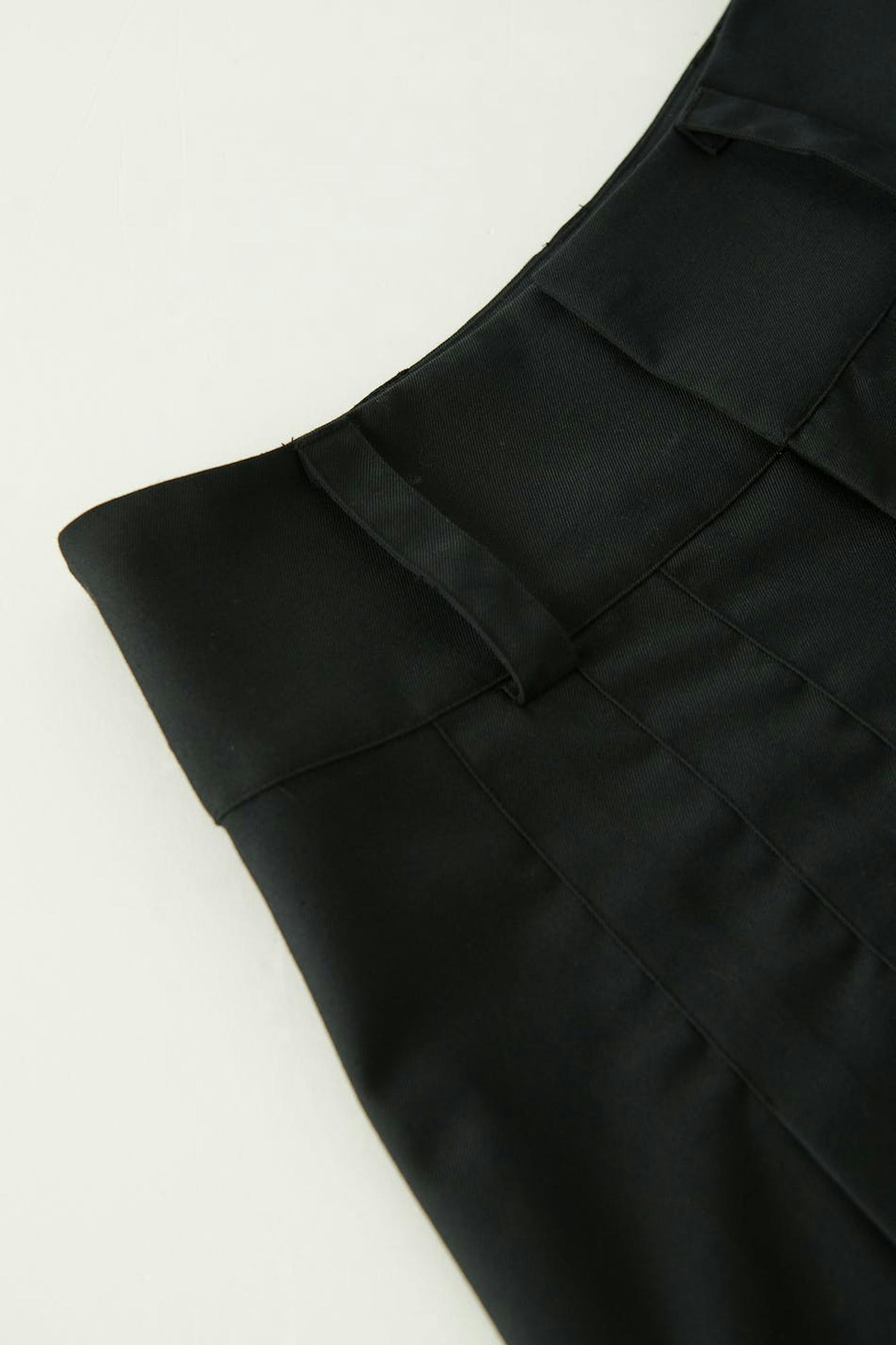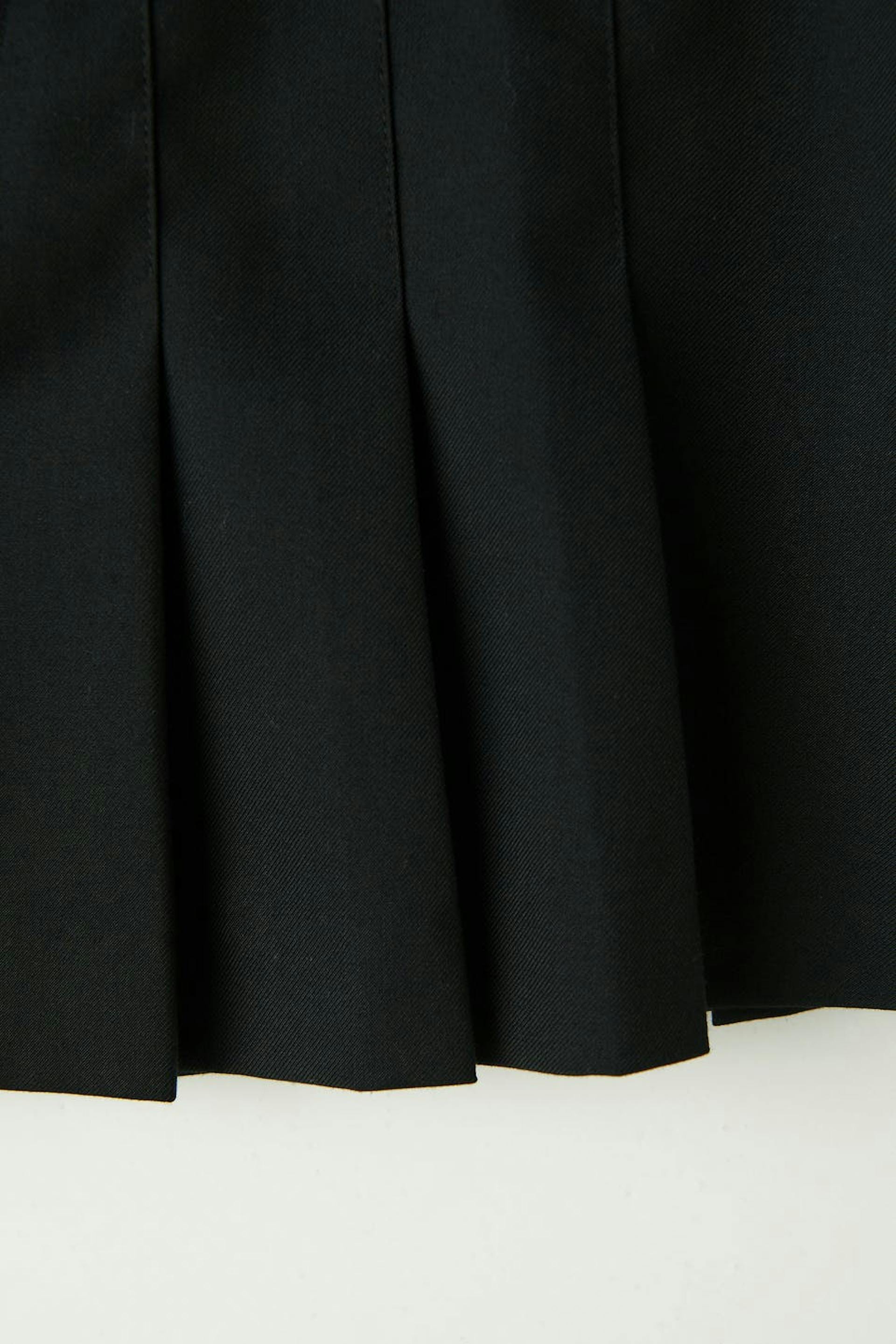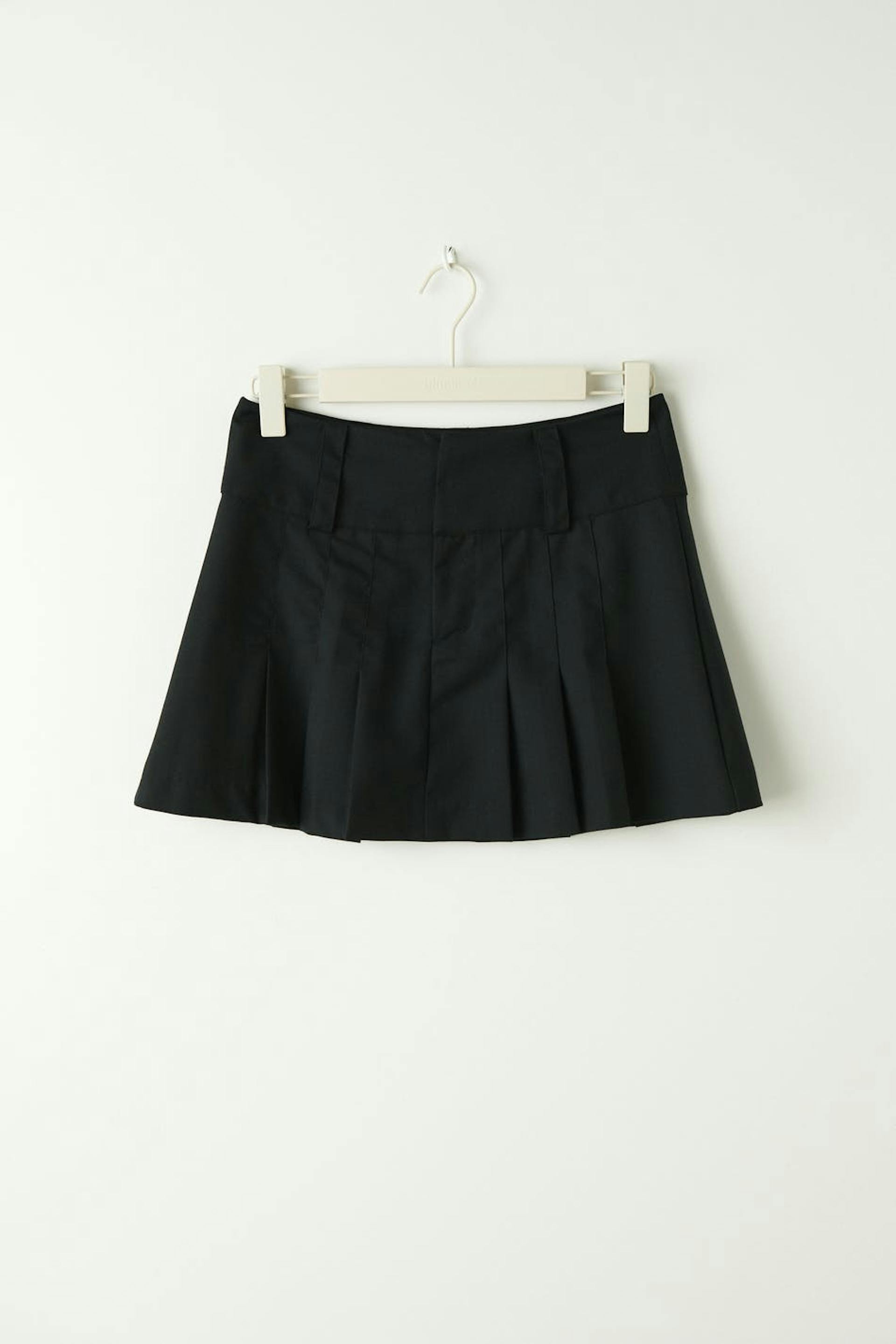 Pleated mini skirt with fitted fit. The skirt is black and has broad waistband with belt loops. It has zipper in the side seam and zip fly.