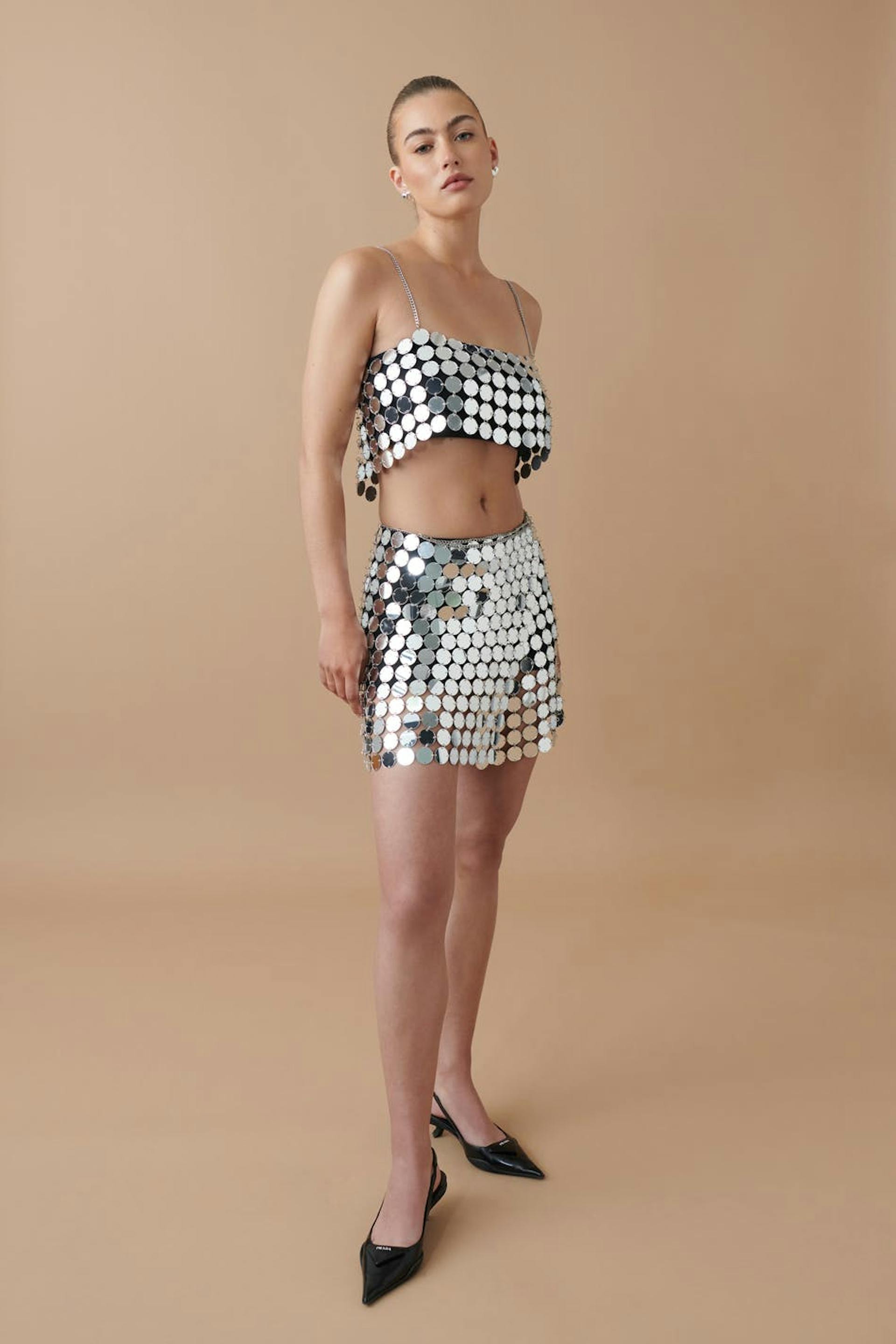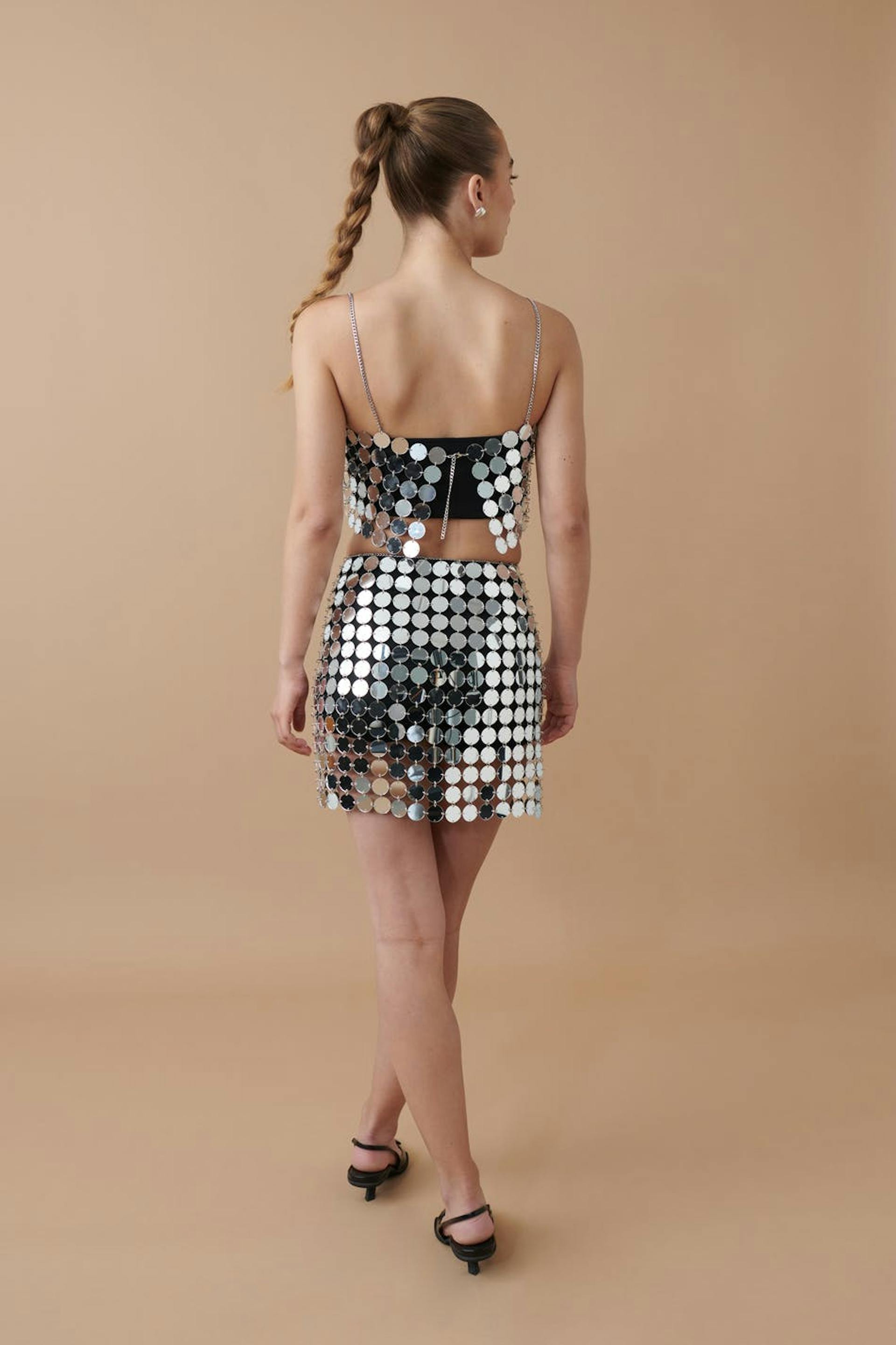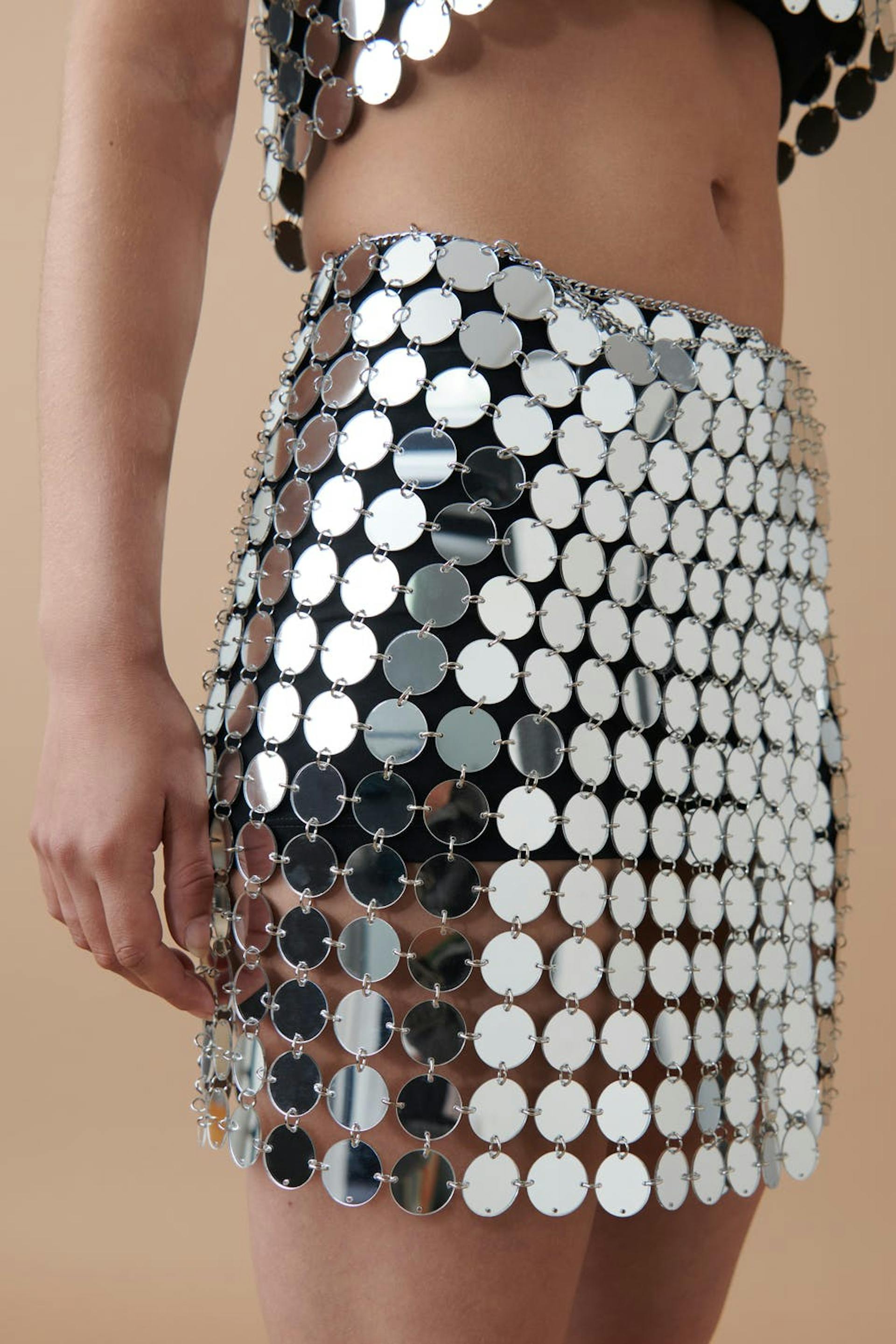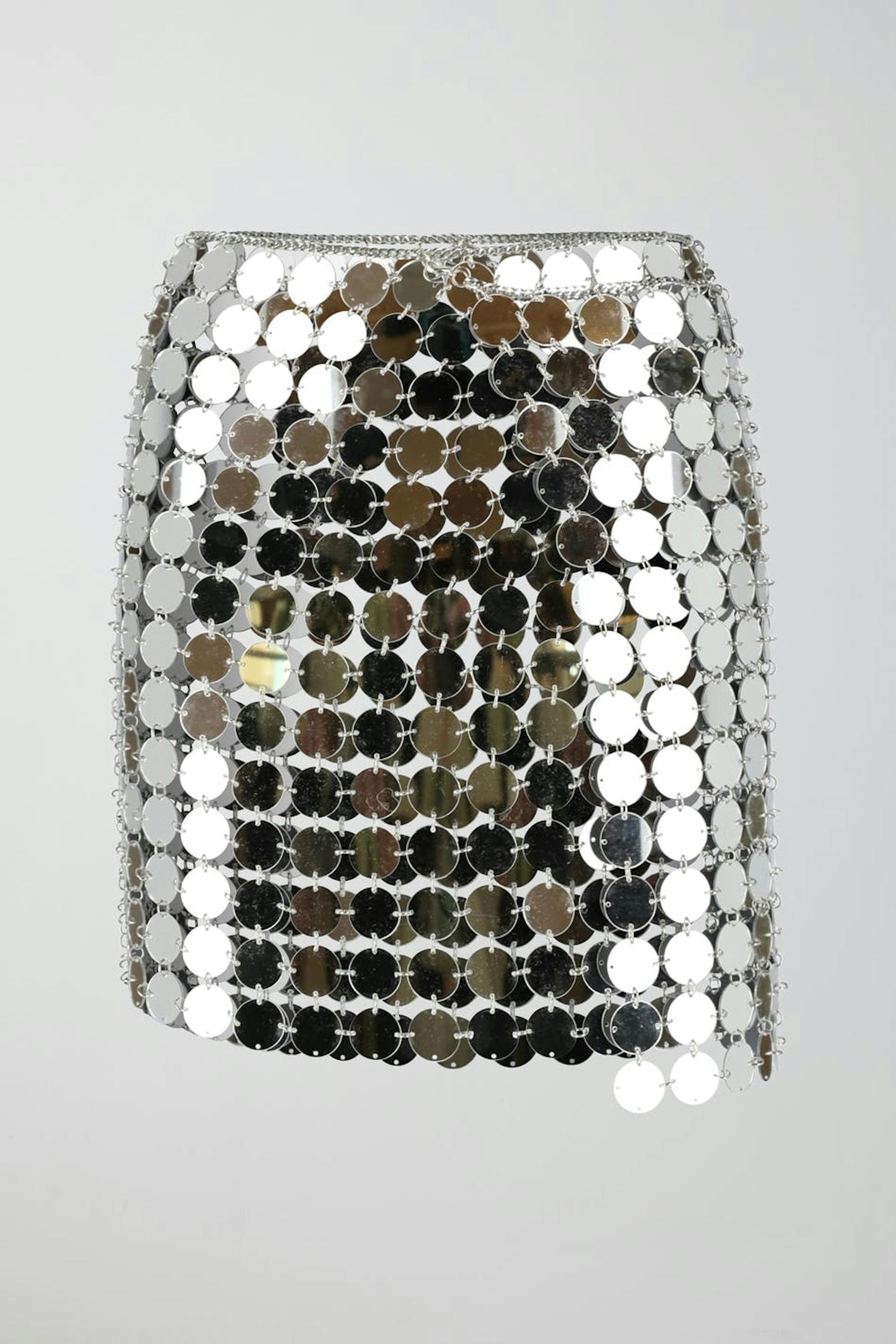 Short wrap skirt with big, round sequins. The skirt is perfect for the party, silver coloured and unlined. It has adjustable chain belt at the waist.