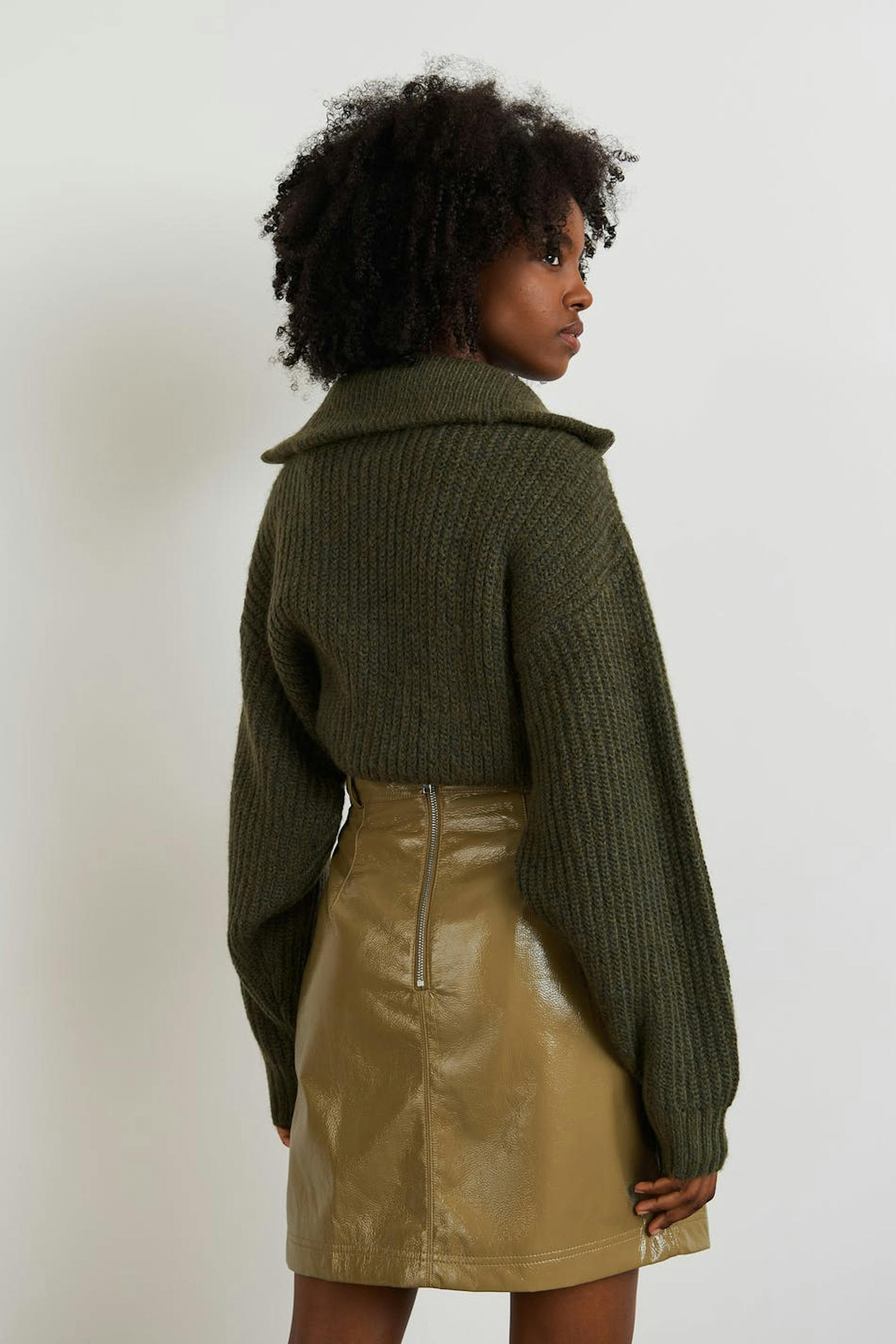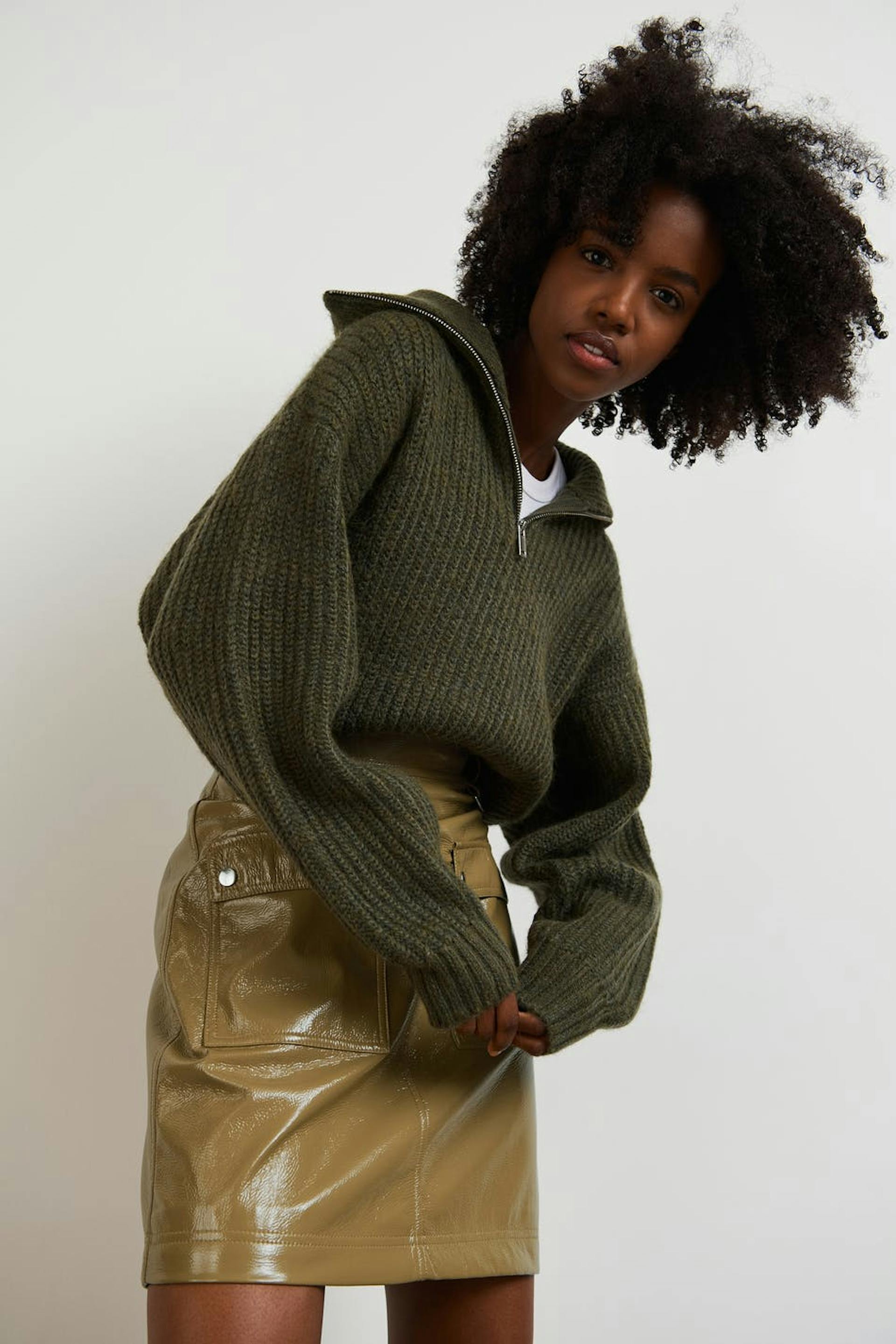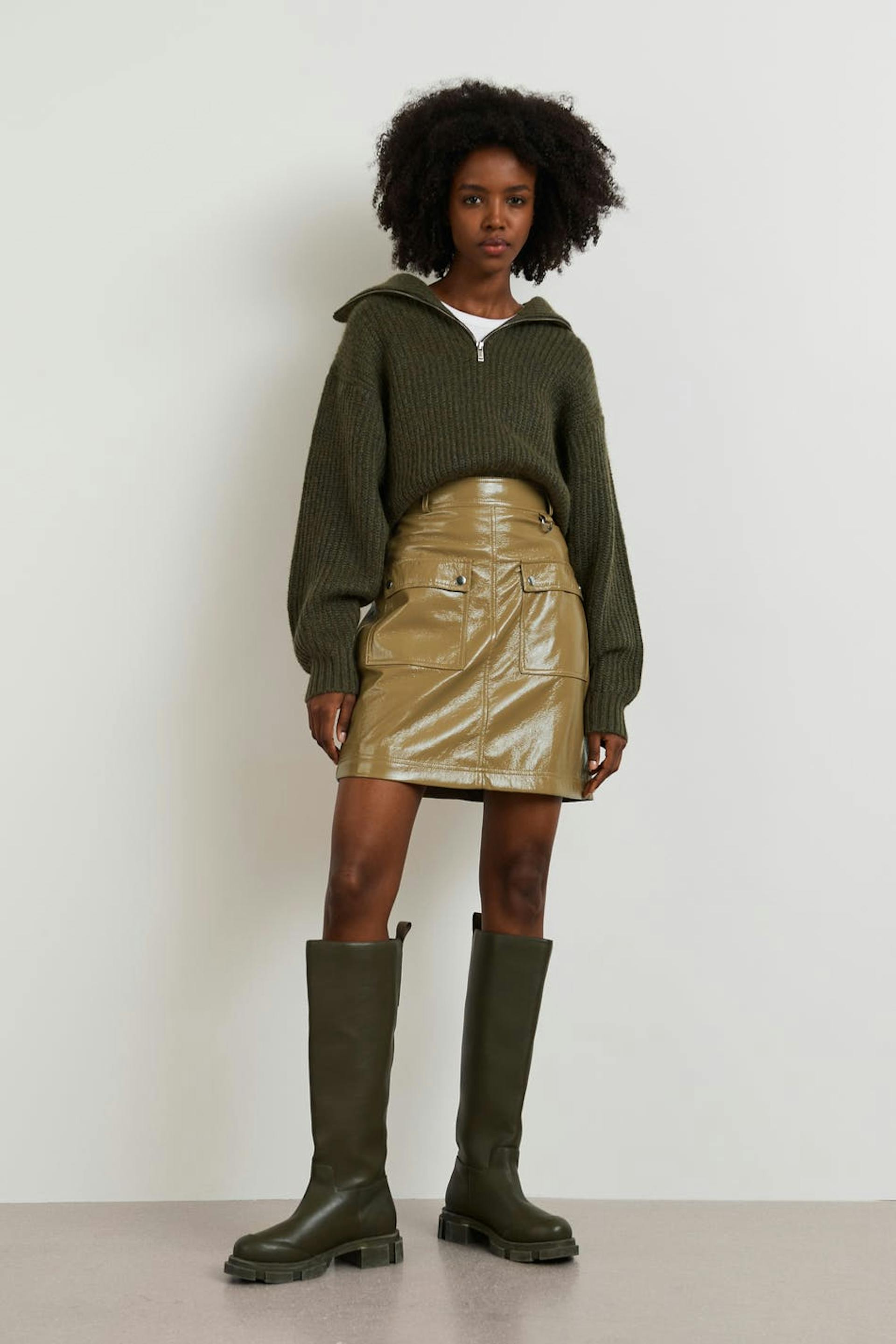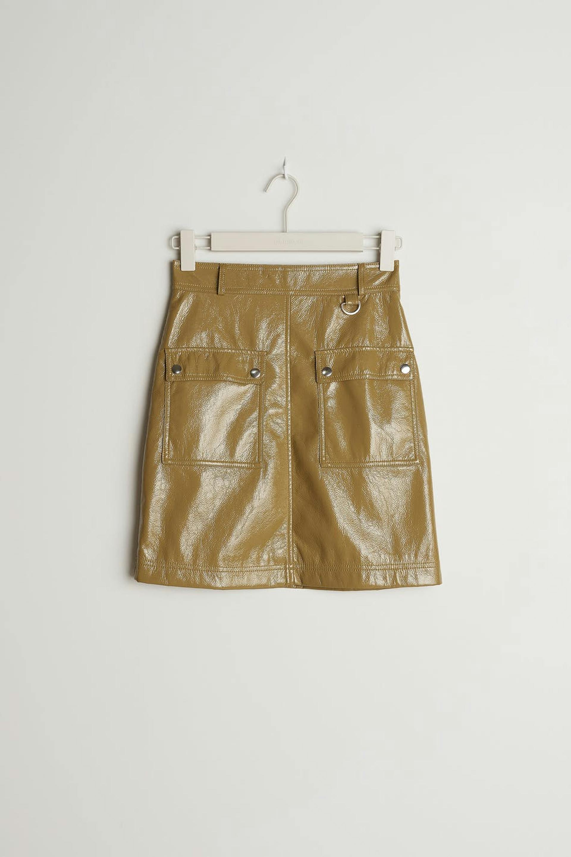 Short skirt with a faux-leather material. The skirt is brown and has two big pockets with snap buttons at the front. It has a high waist, a zip closure at the back and a seam detail along the front.