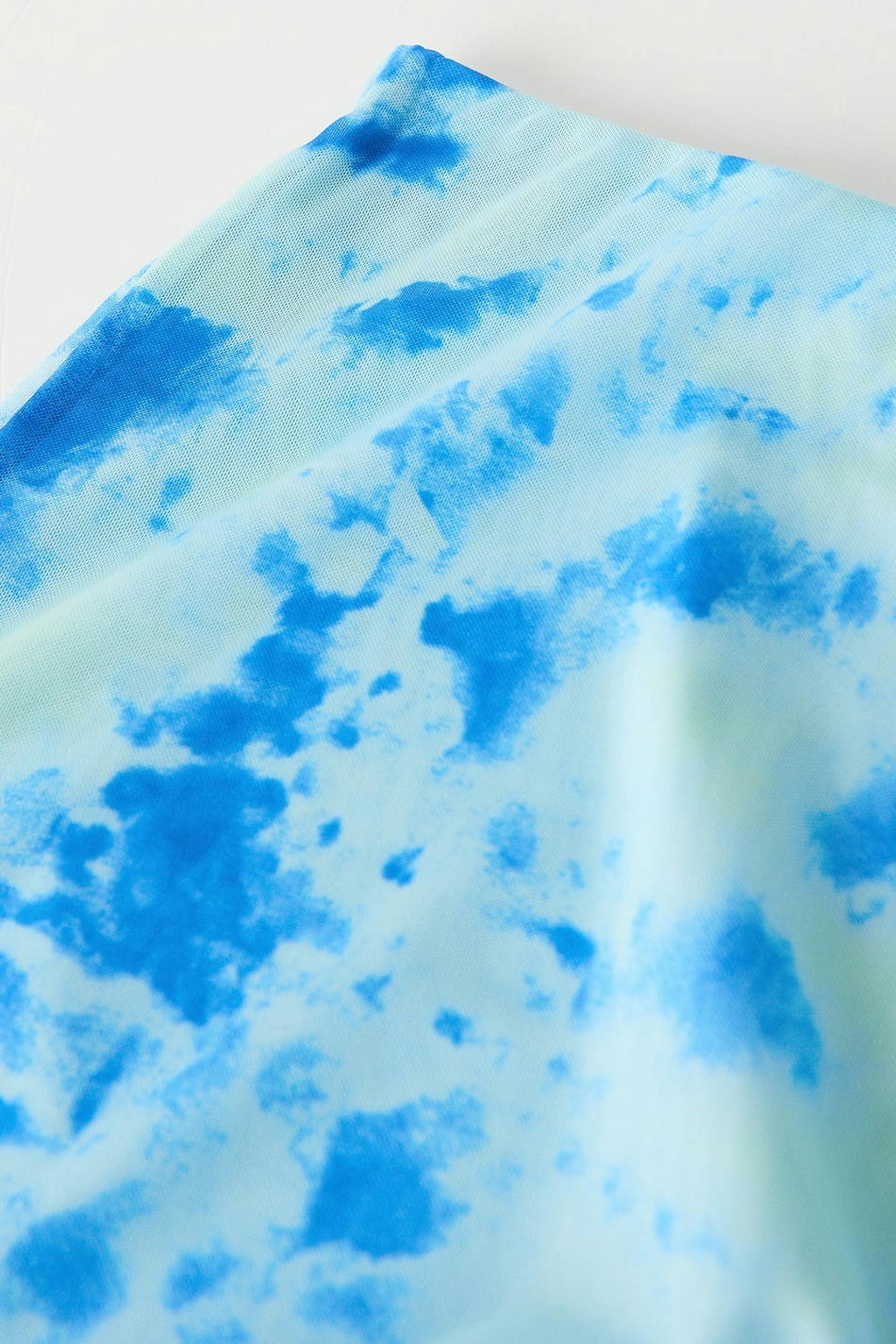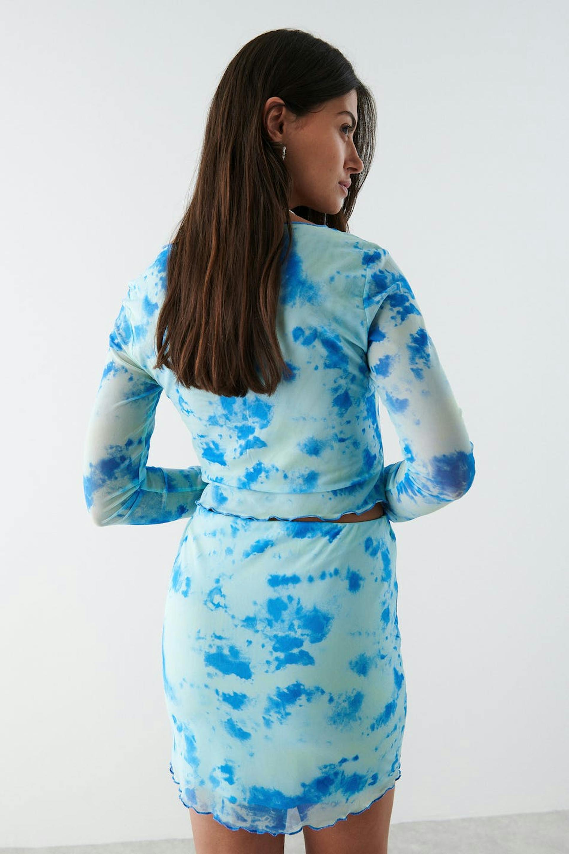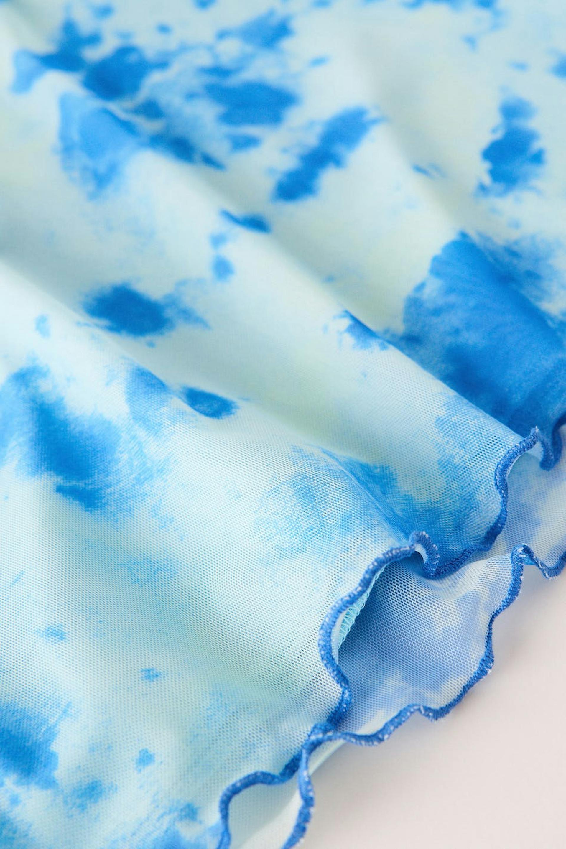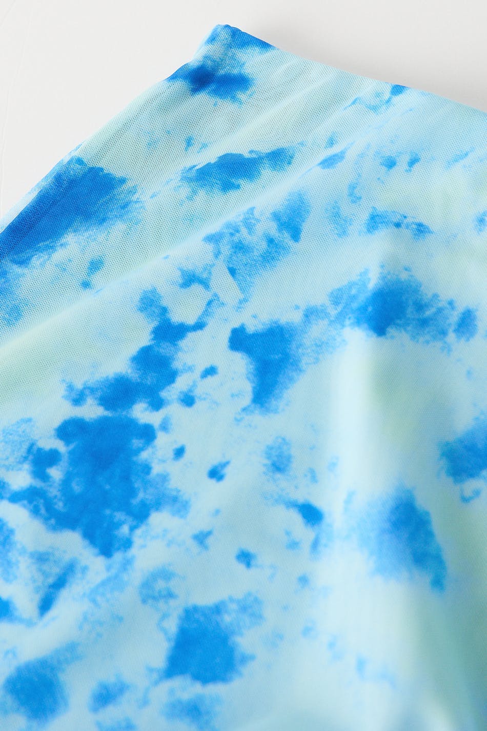 Short skirt in mesh with elastic at the waist. The skirt is blue and has curly bottom hem.