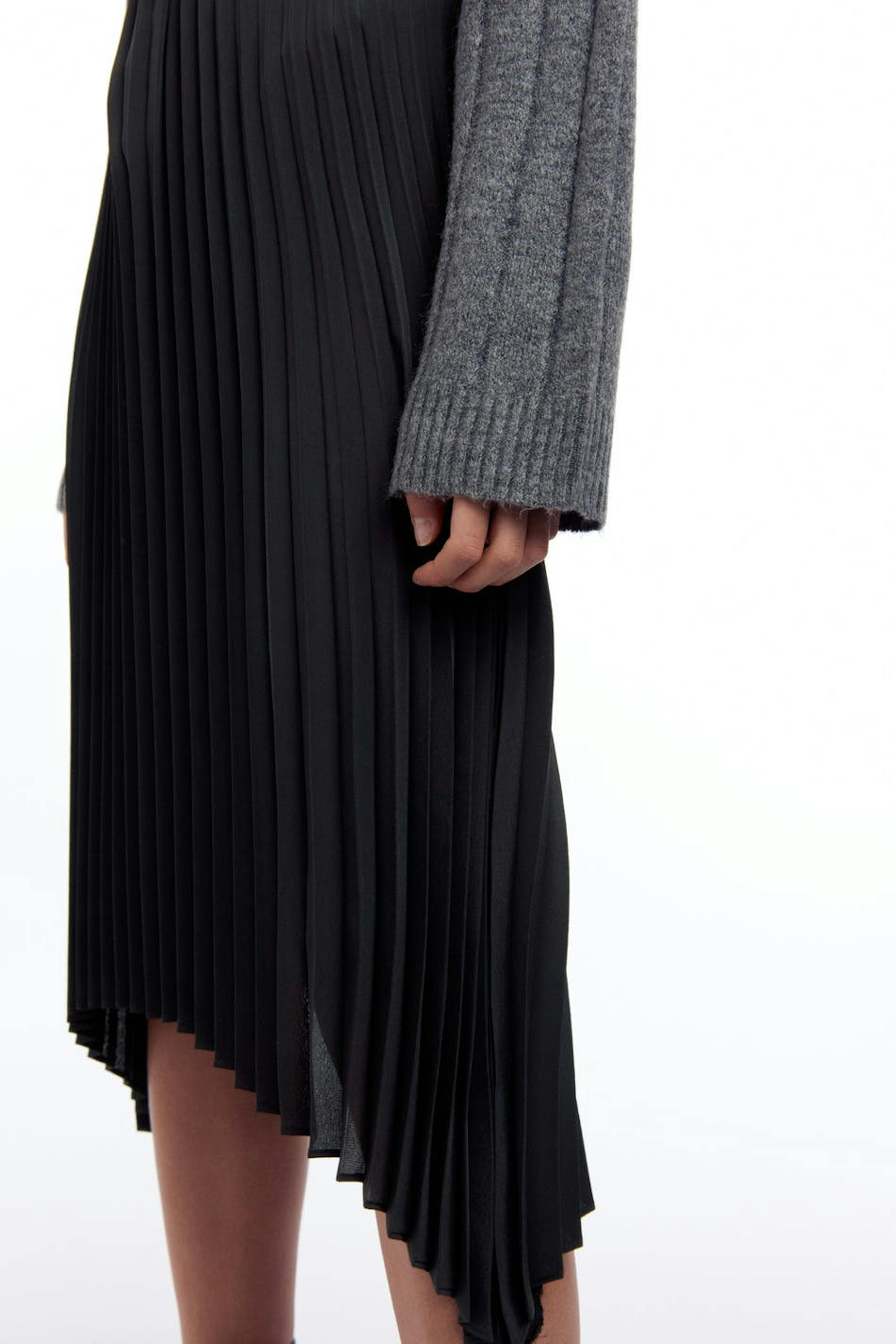 Pleated skirt with an asymmetrical bottom hem. The skirt is black, calf-length and lined. It has an elastic band at the waist.