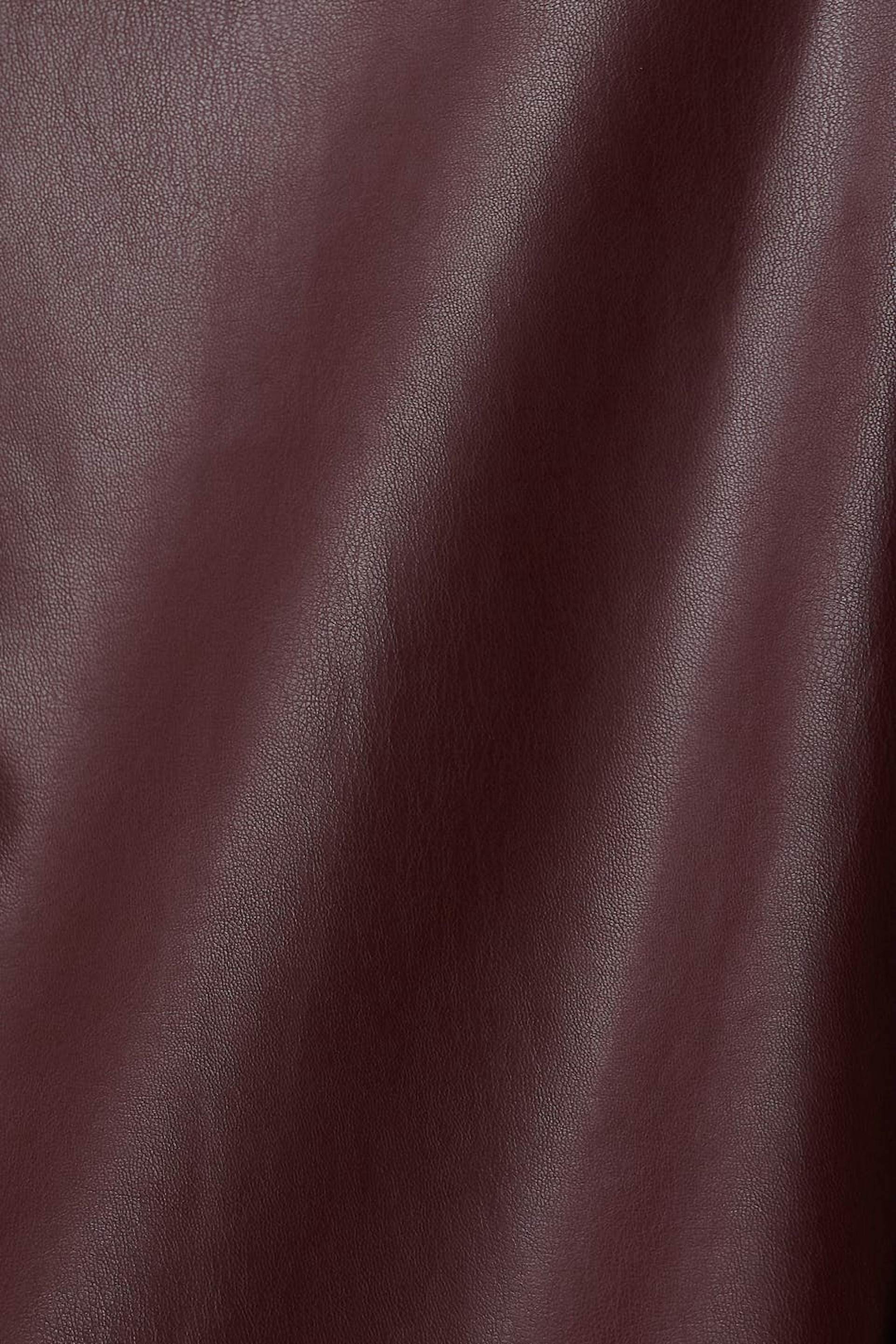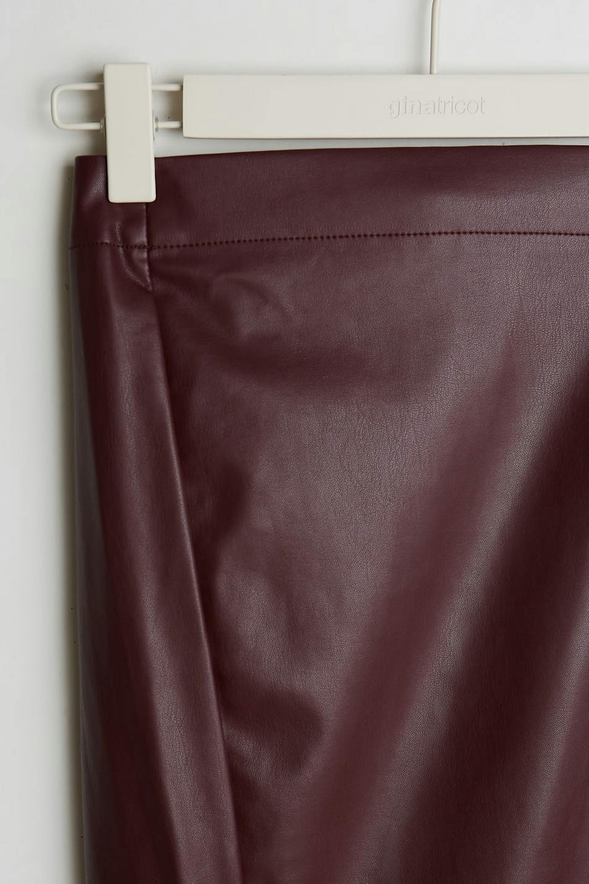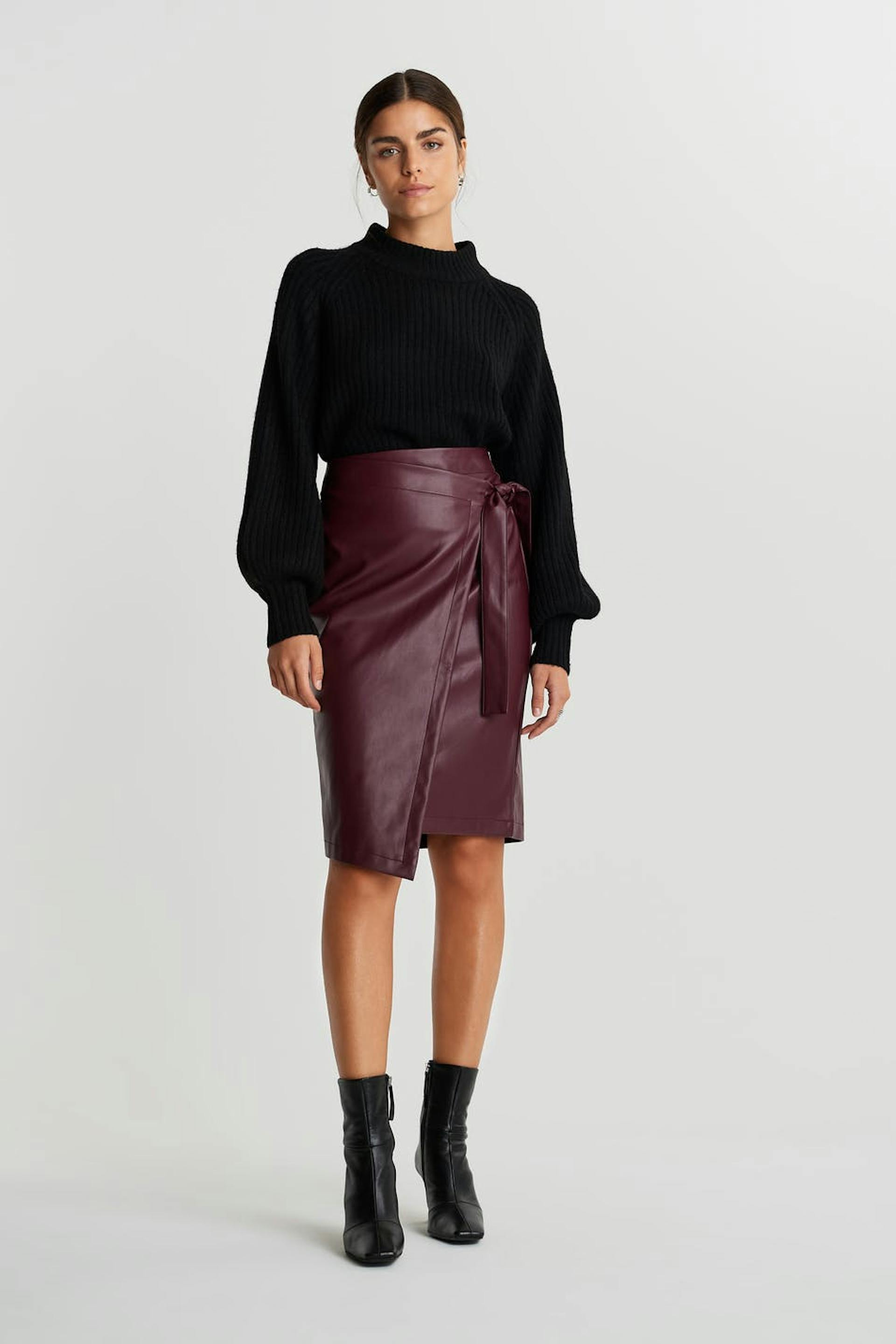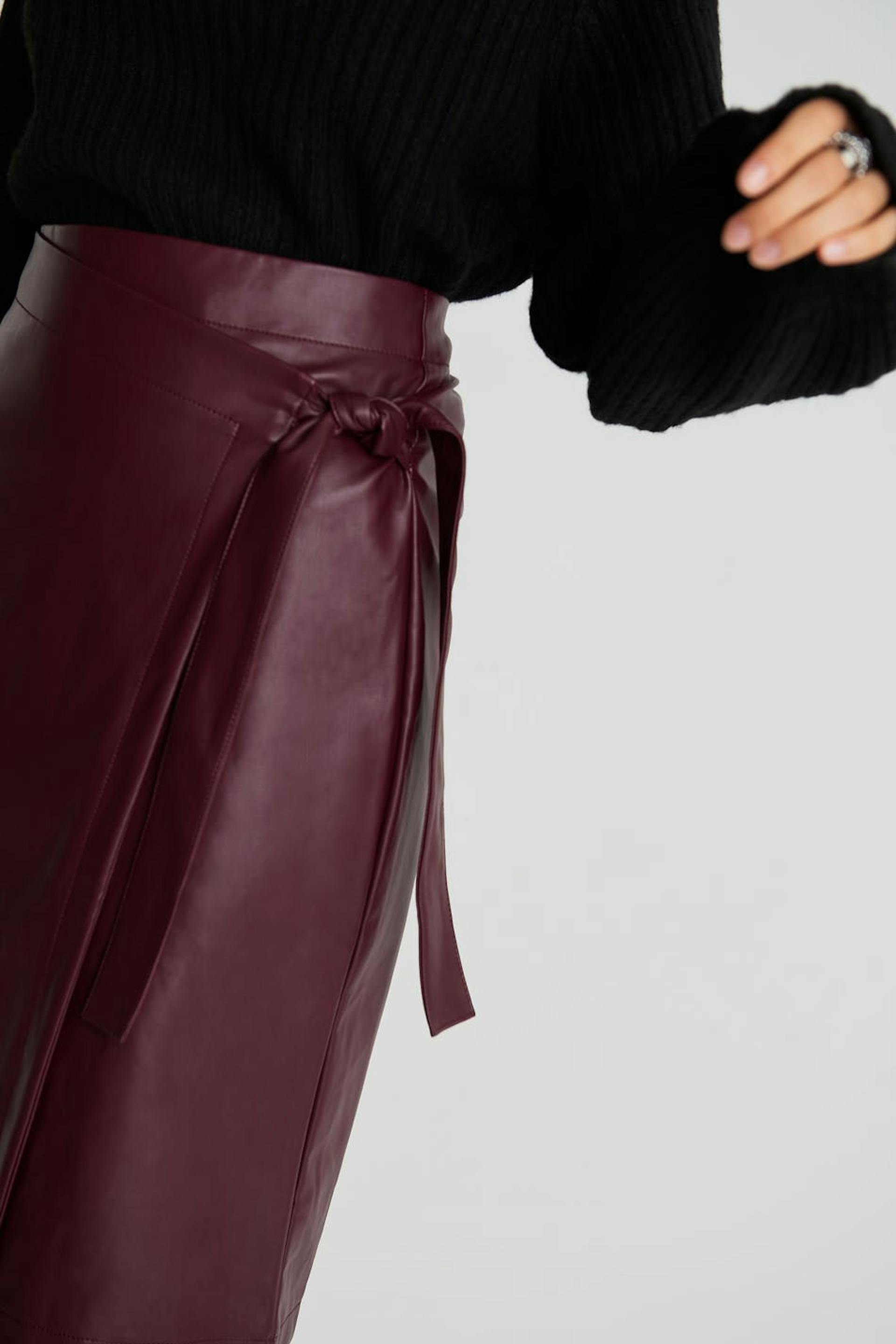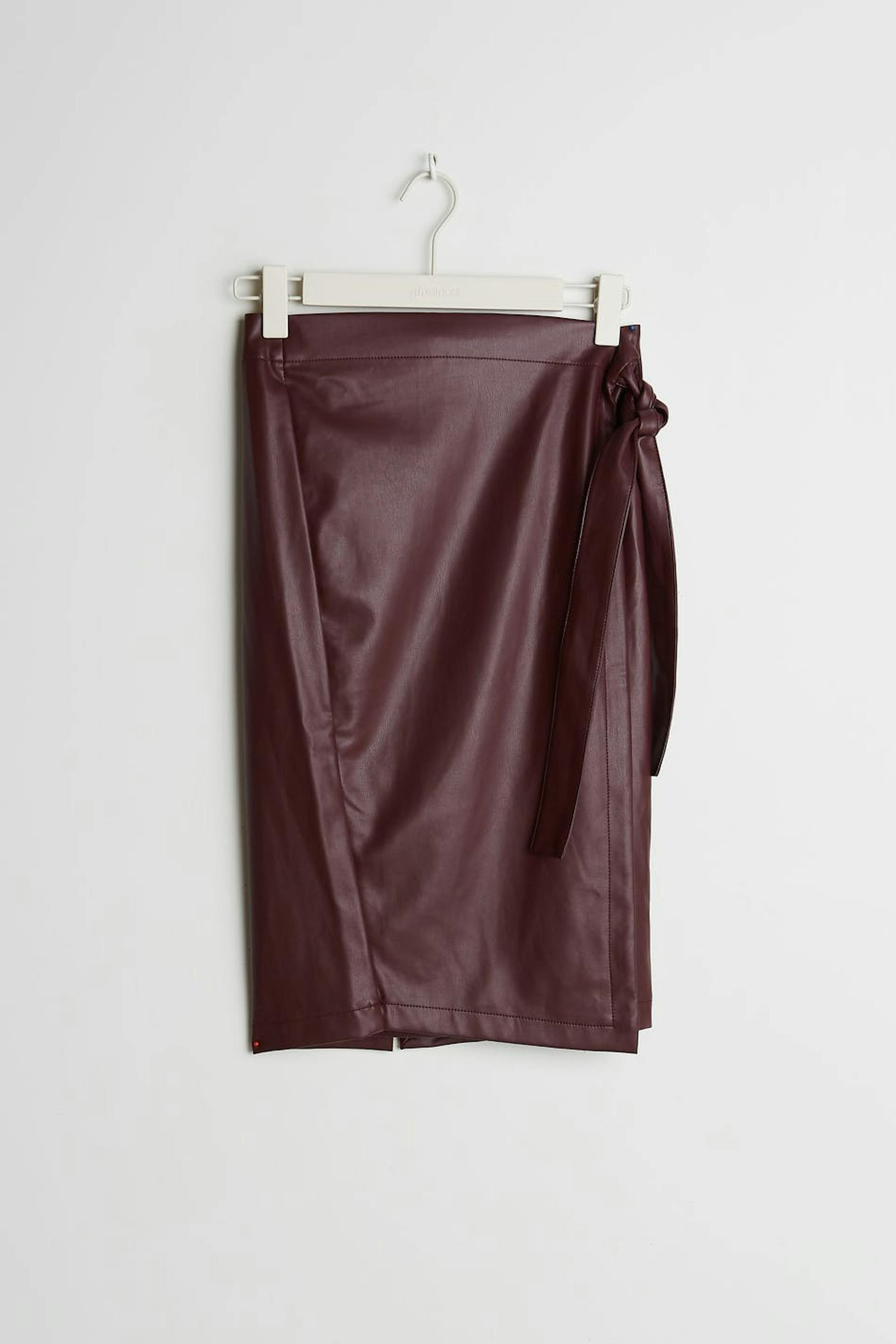 Knee length wrap skirt with a tie strap at the side. The skirt is red and has a zipper in metal at the back. It is made of PU leather.