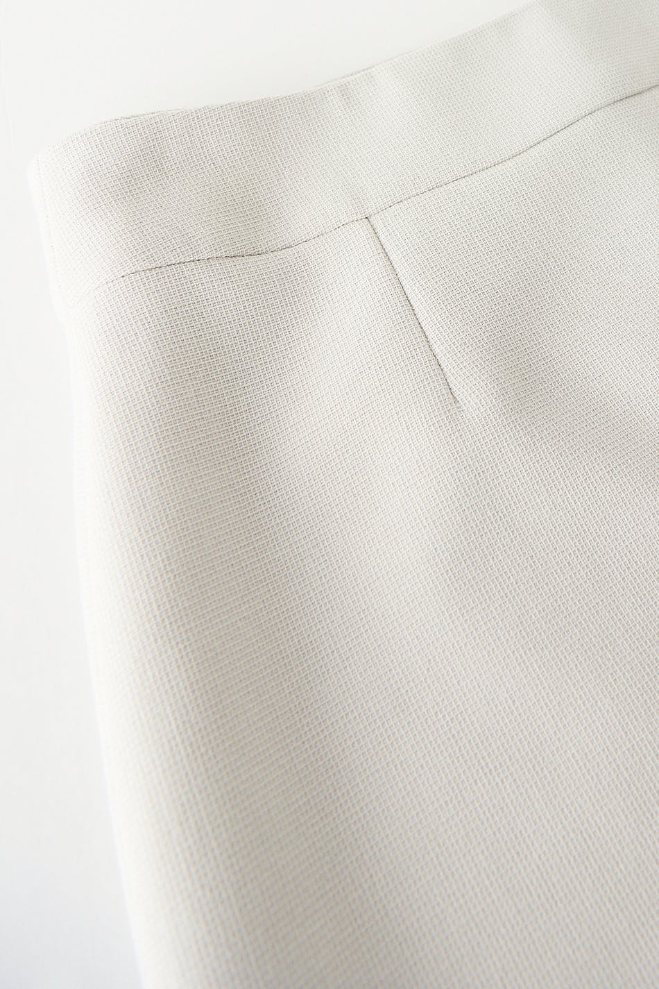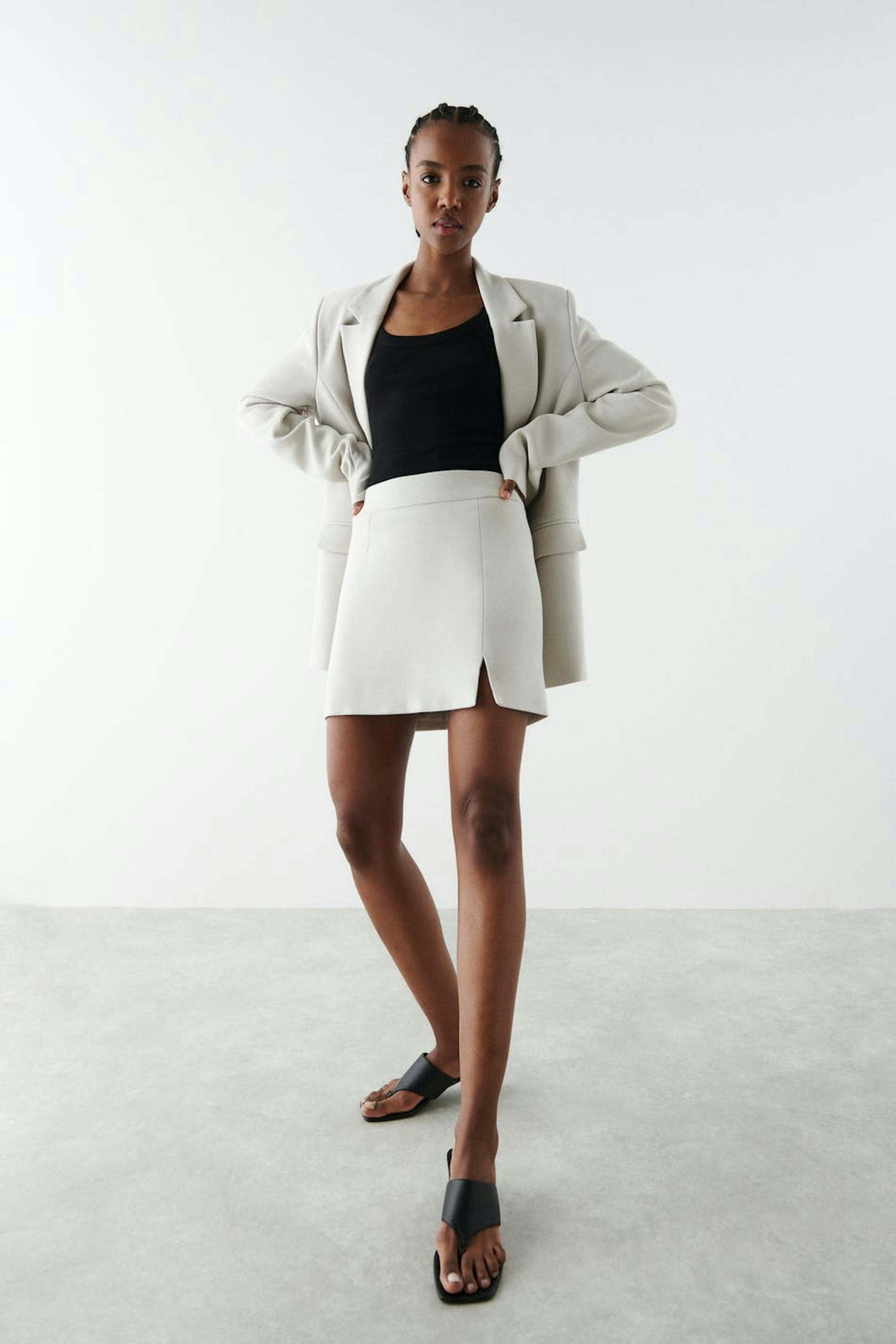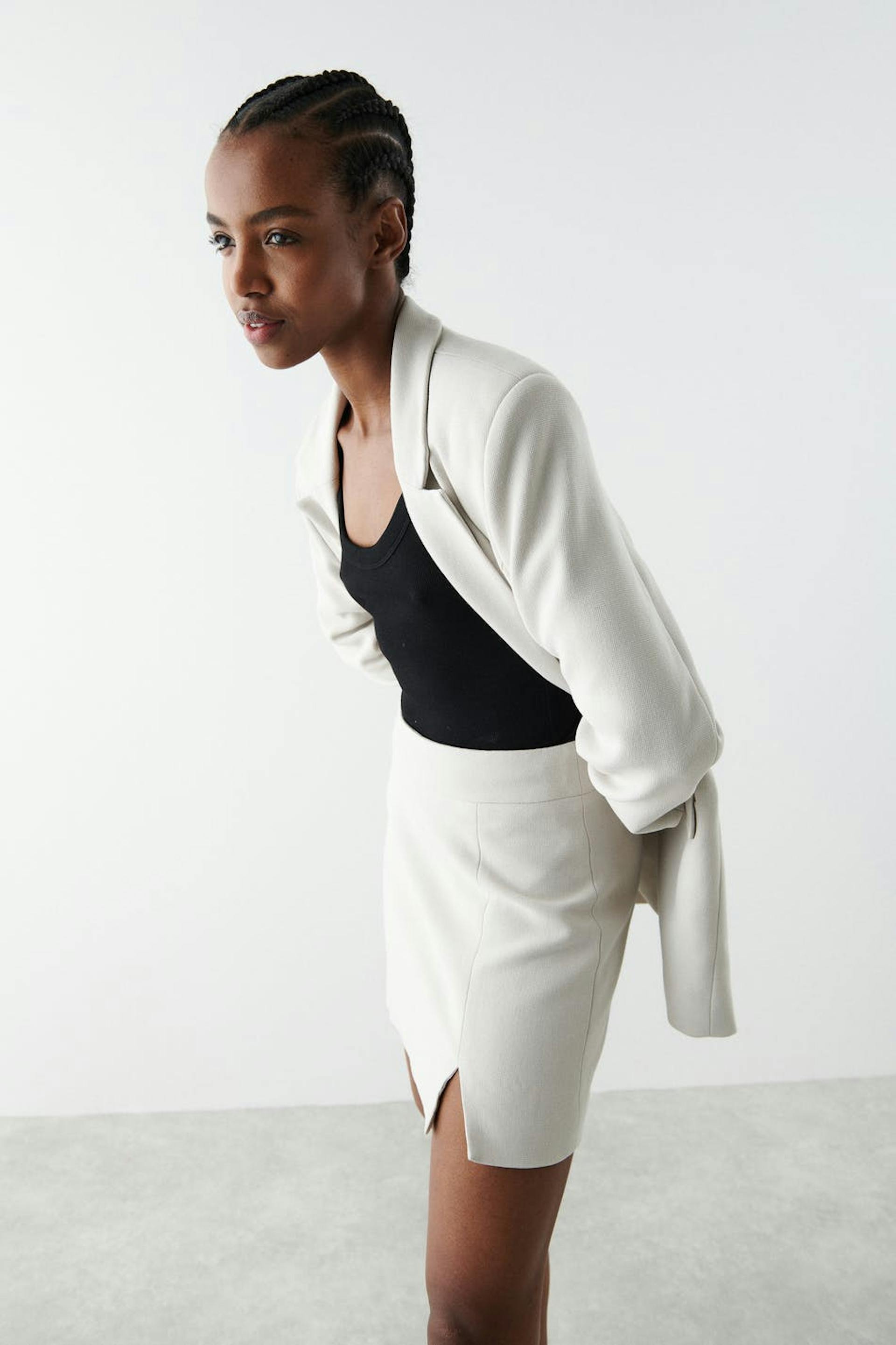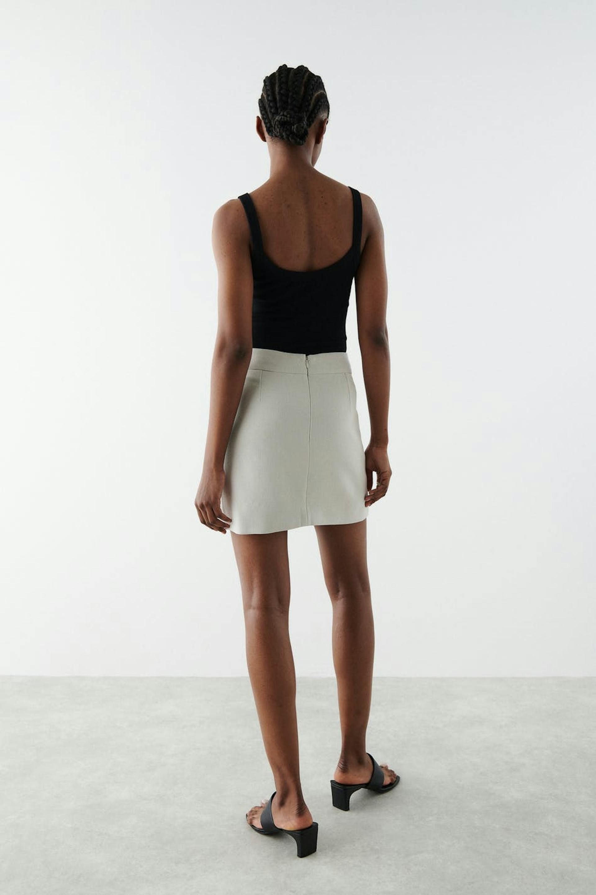 Short skirt with vent at the front. The skirt is perfect for the party and beige and has decorative seam details. It has a hidden zip at the back.