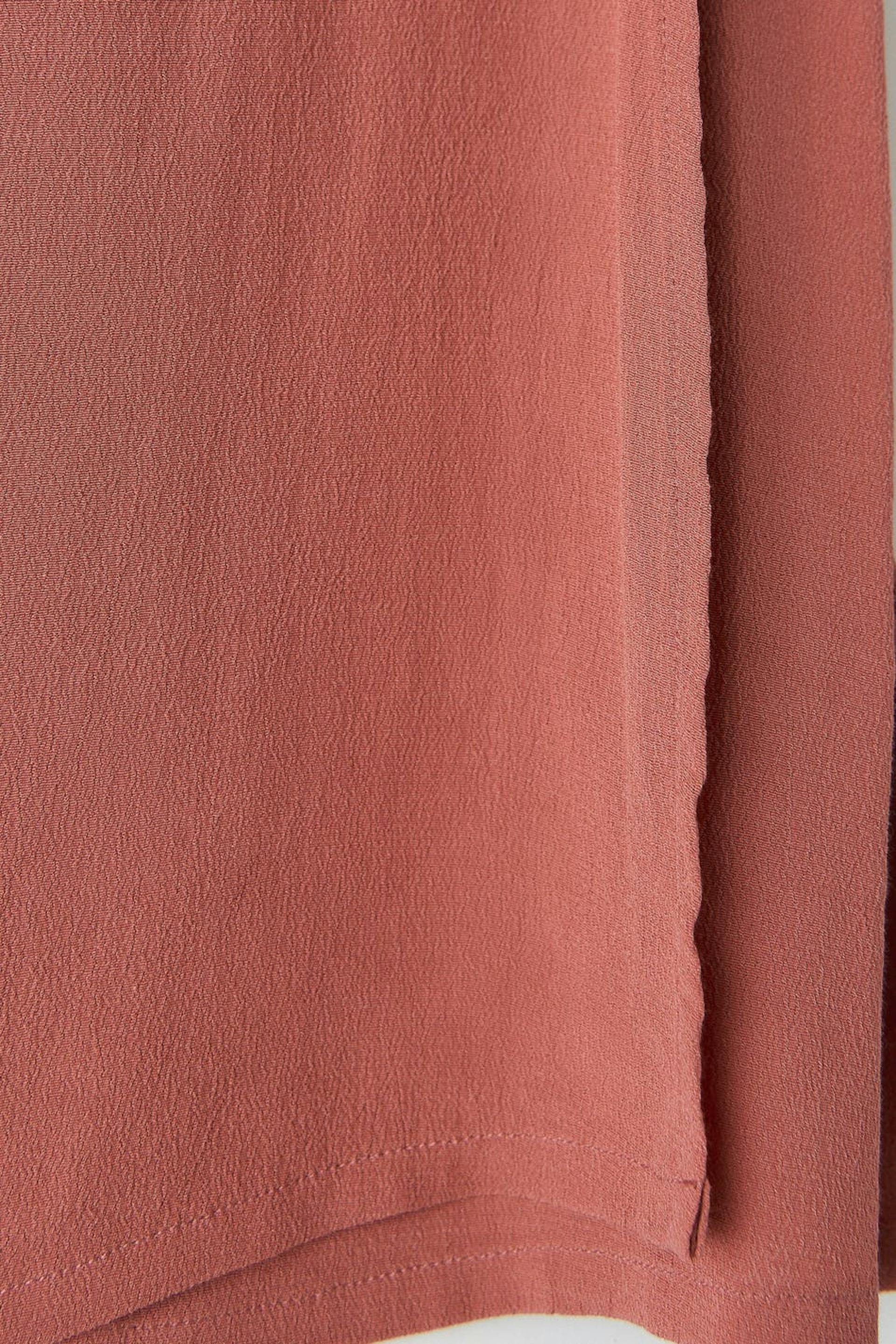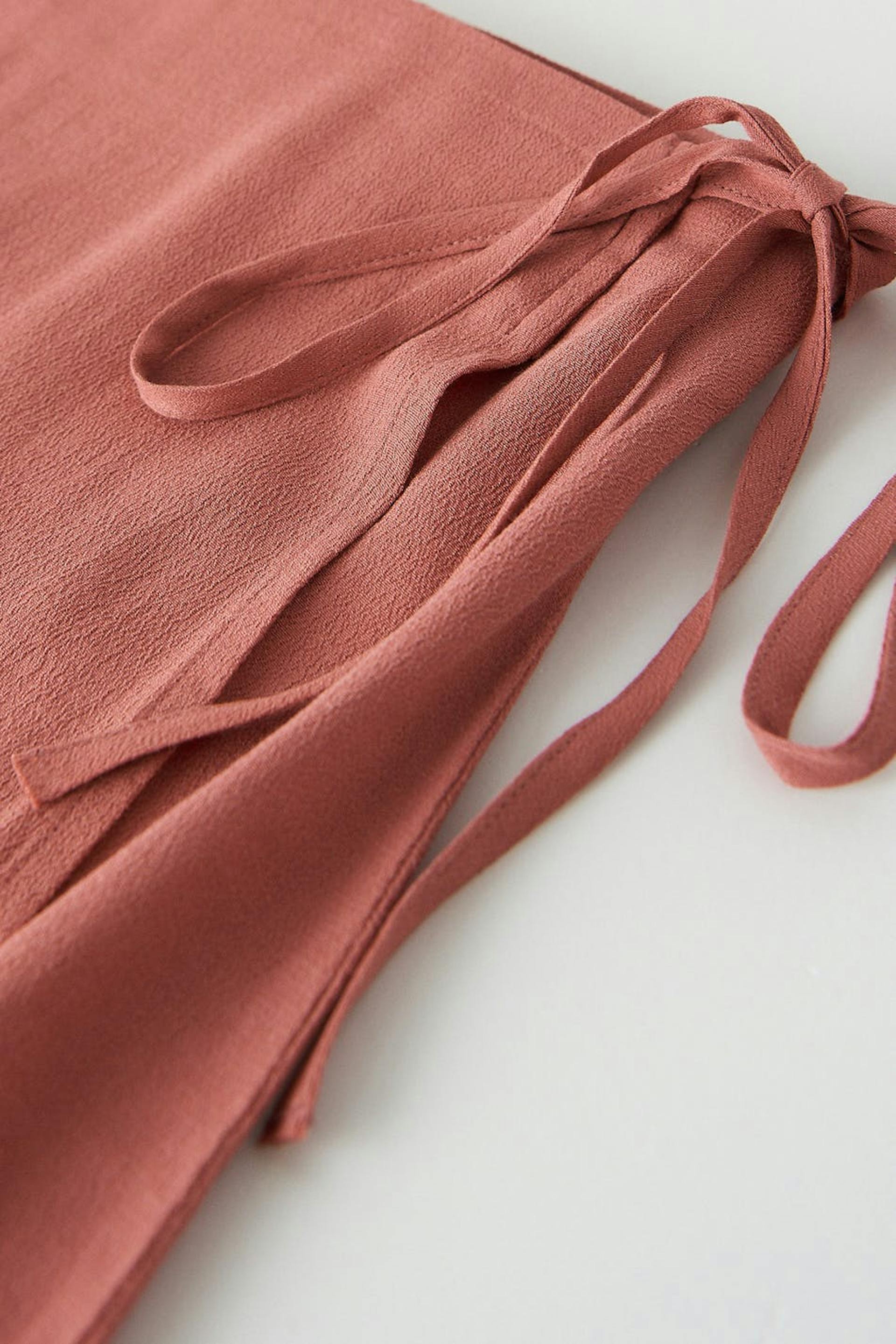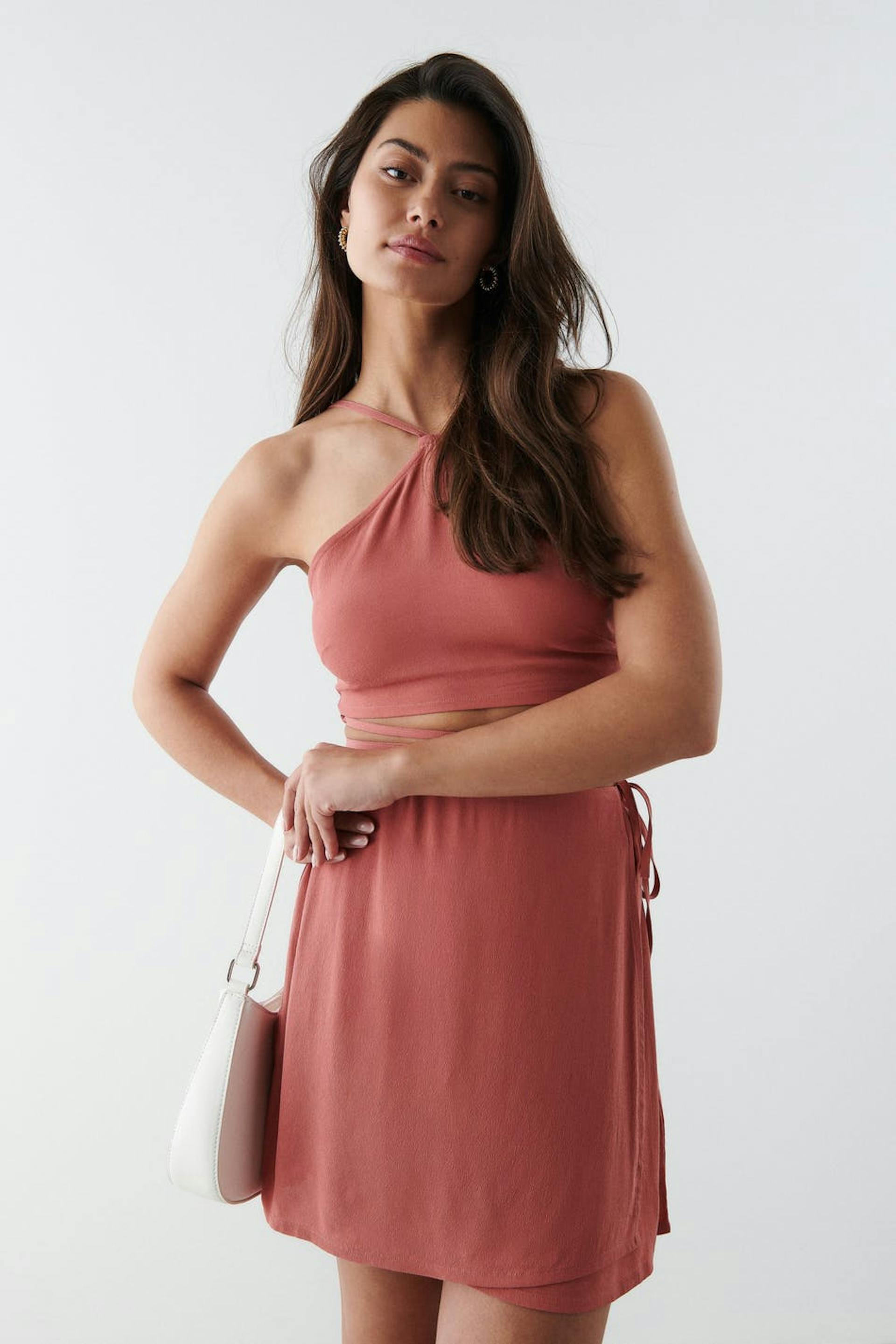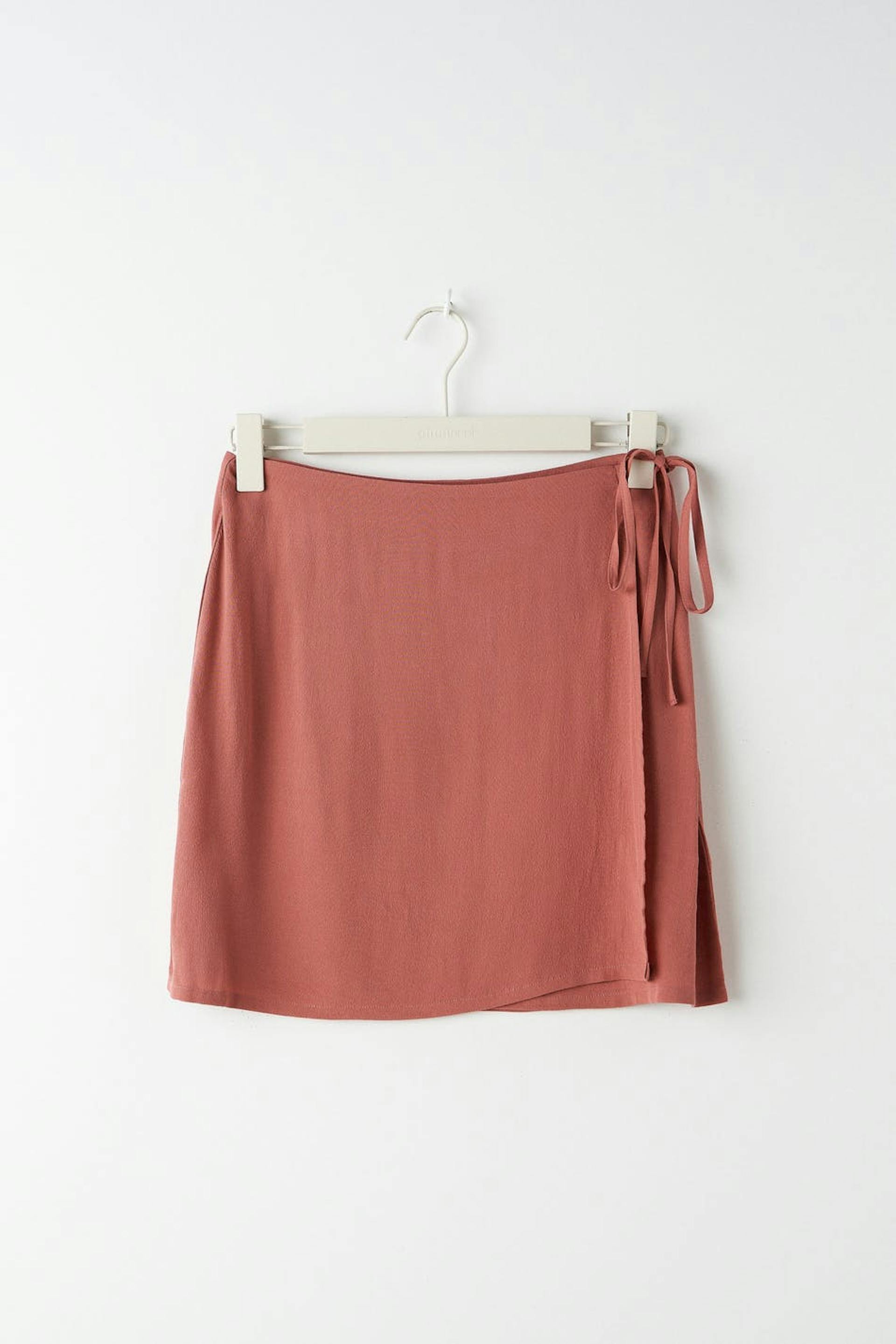 Short wrap skirt with self-tie at the side. The skirt is red and has a woven quality.