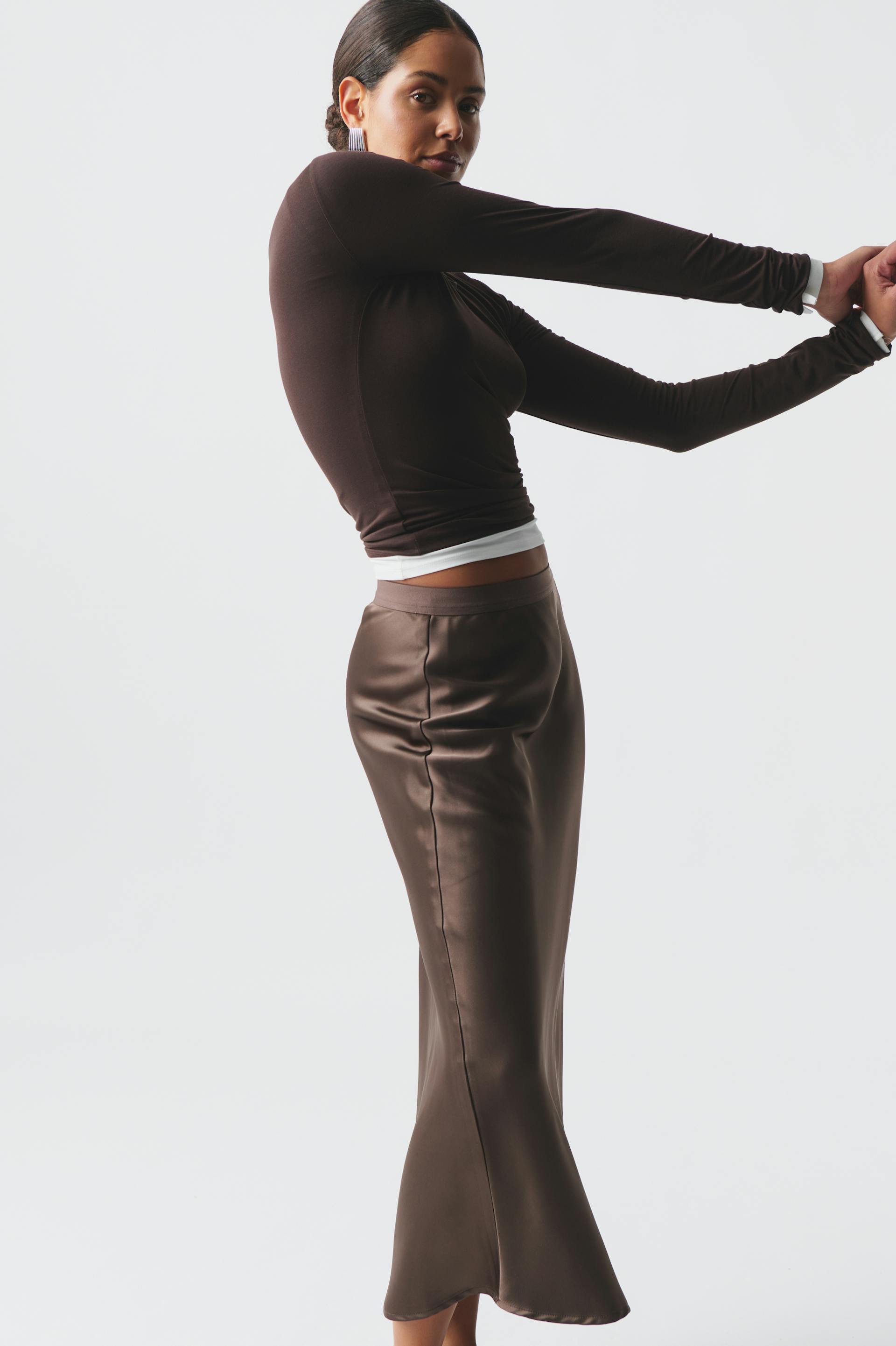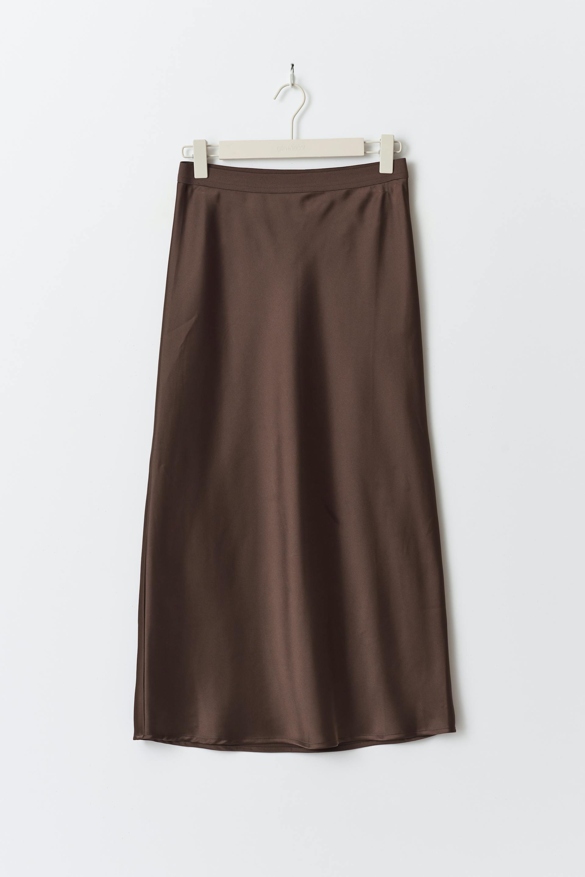 Long satin skirt with elastic at the waist. The satin skirt is brown and has midi length. It has regular fit and soft, shiny quality.