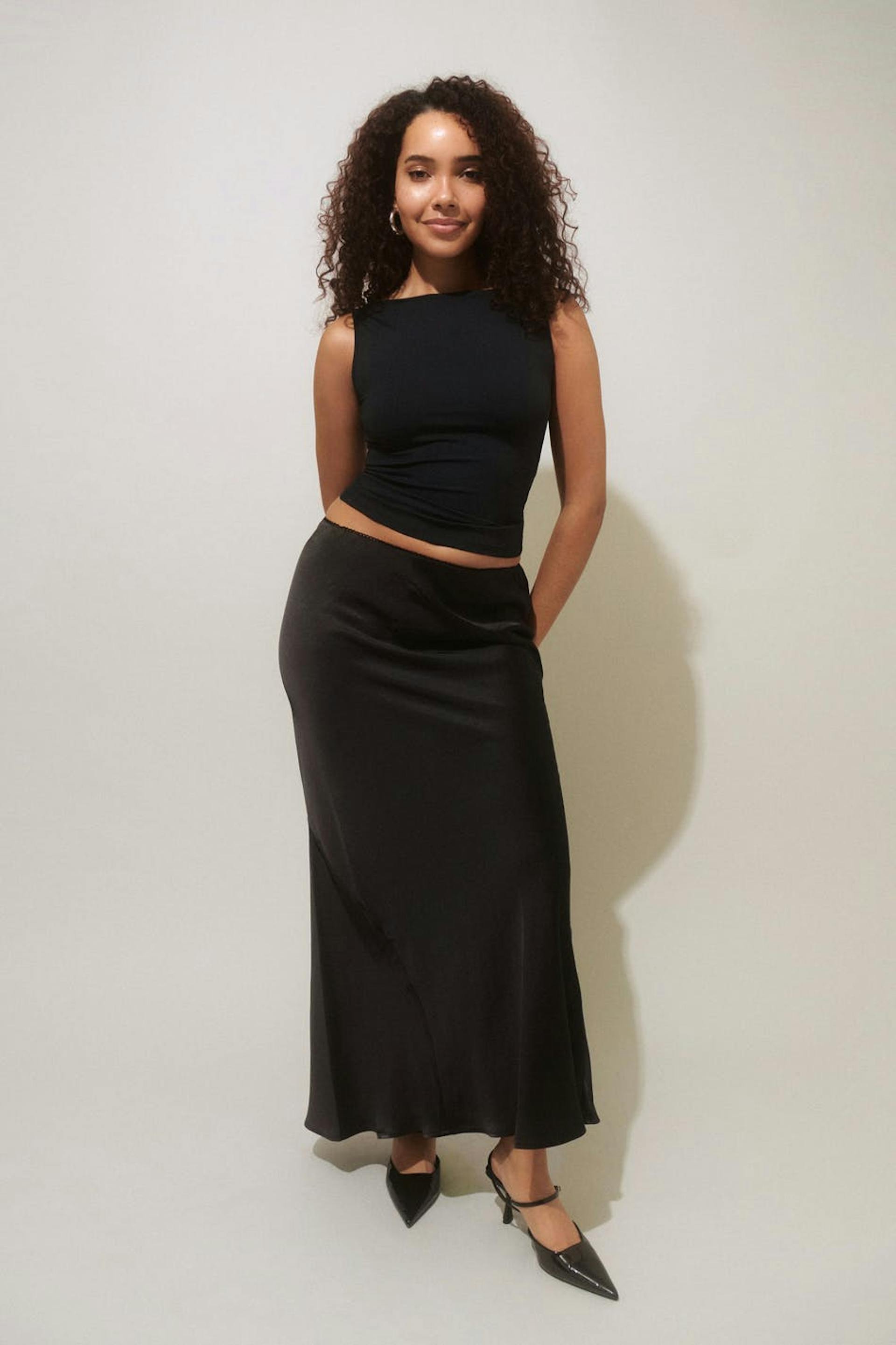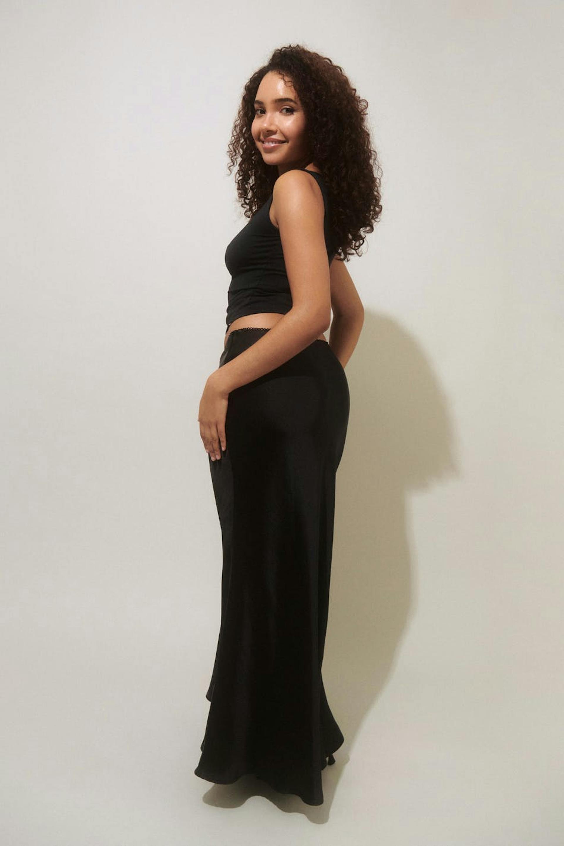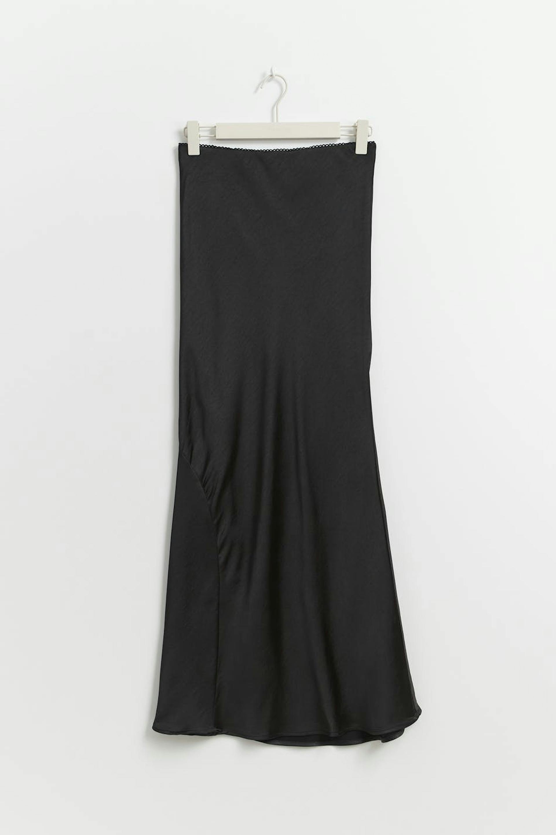 Long satin skirt in mermaid shape with mid waist. The skirt is black and has shiny quality. It has elastic at the waist and flared hem.