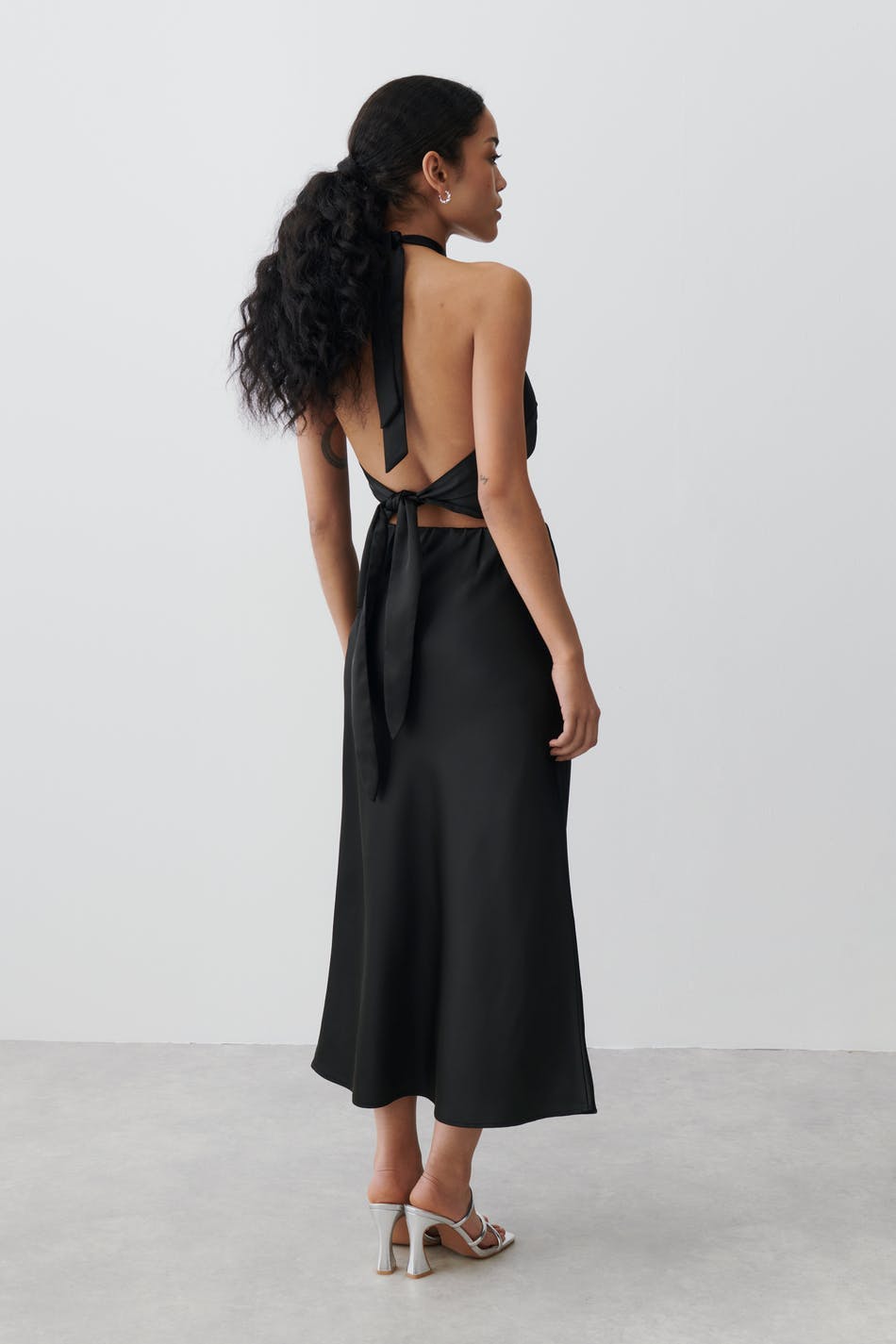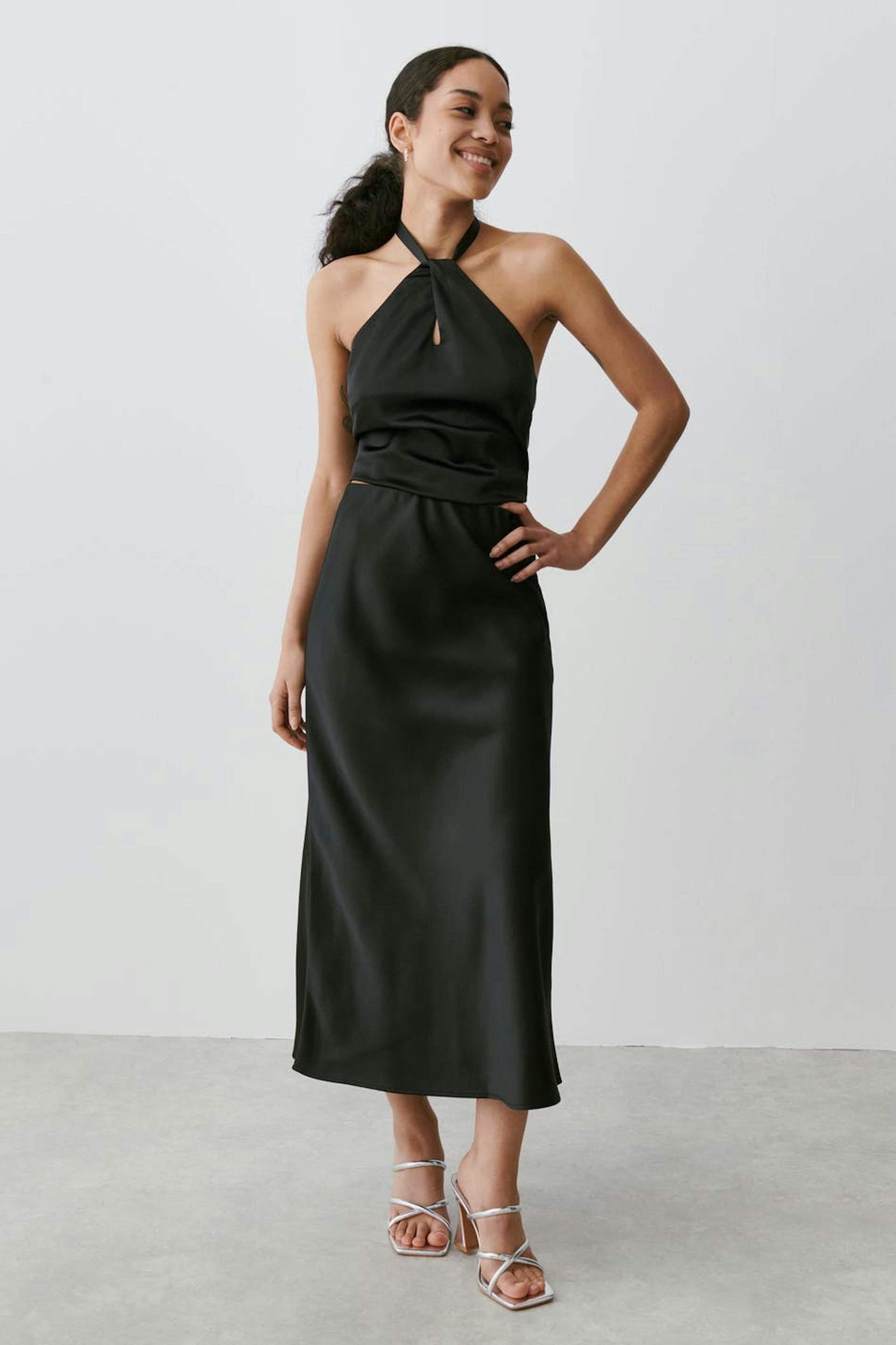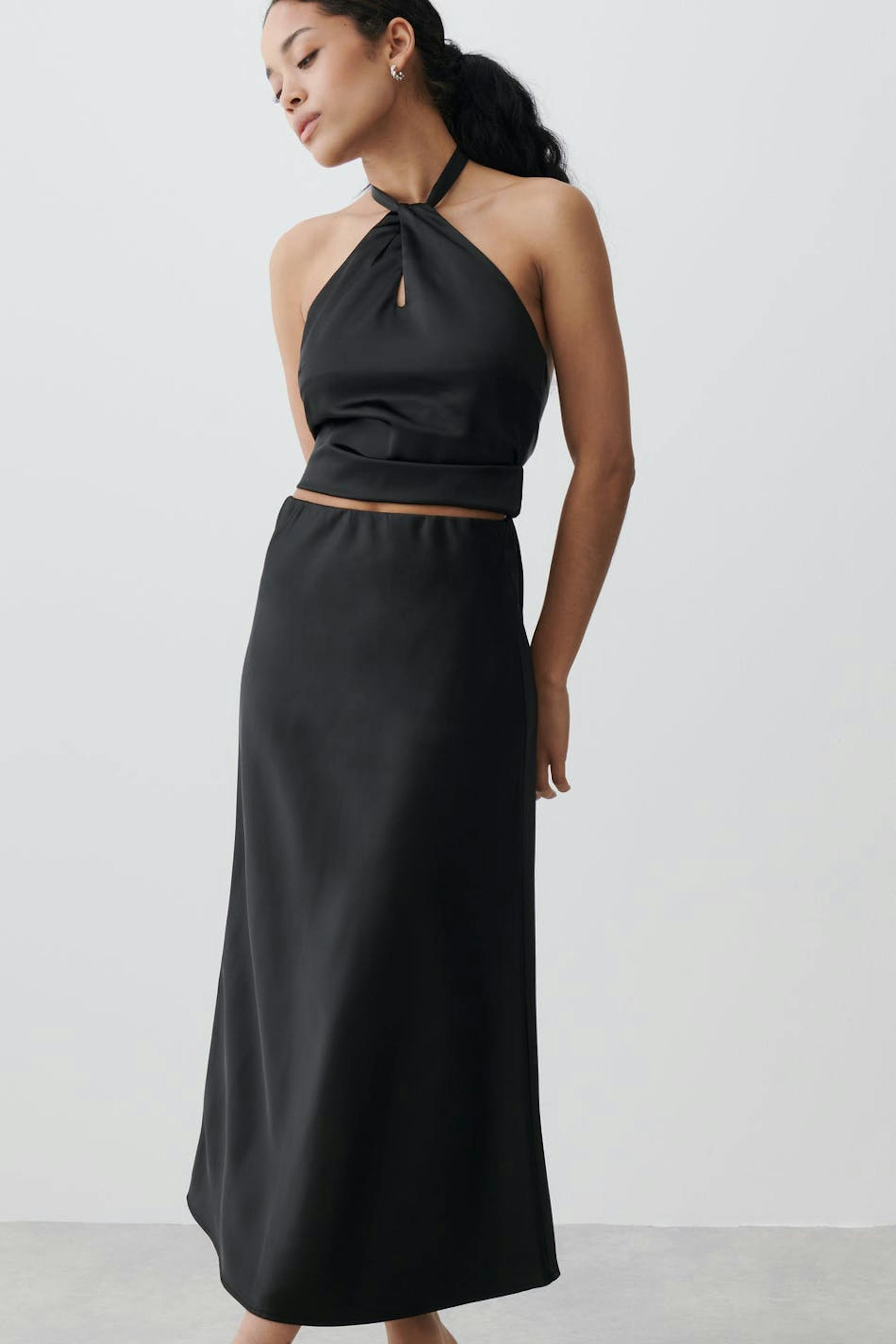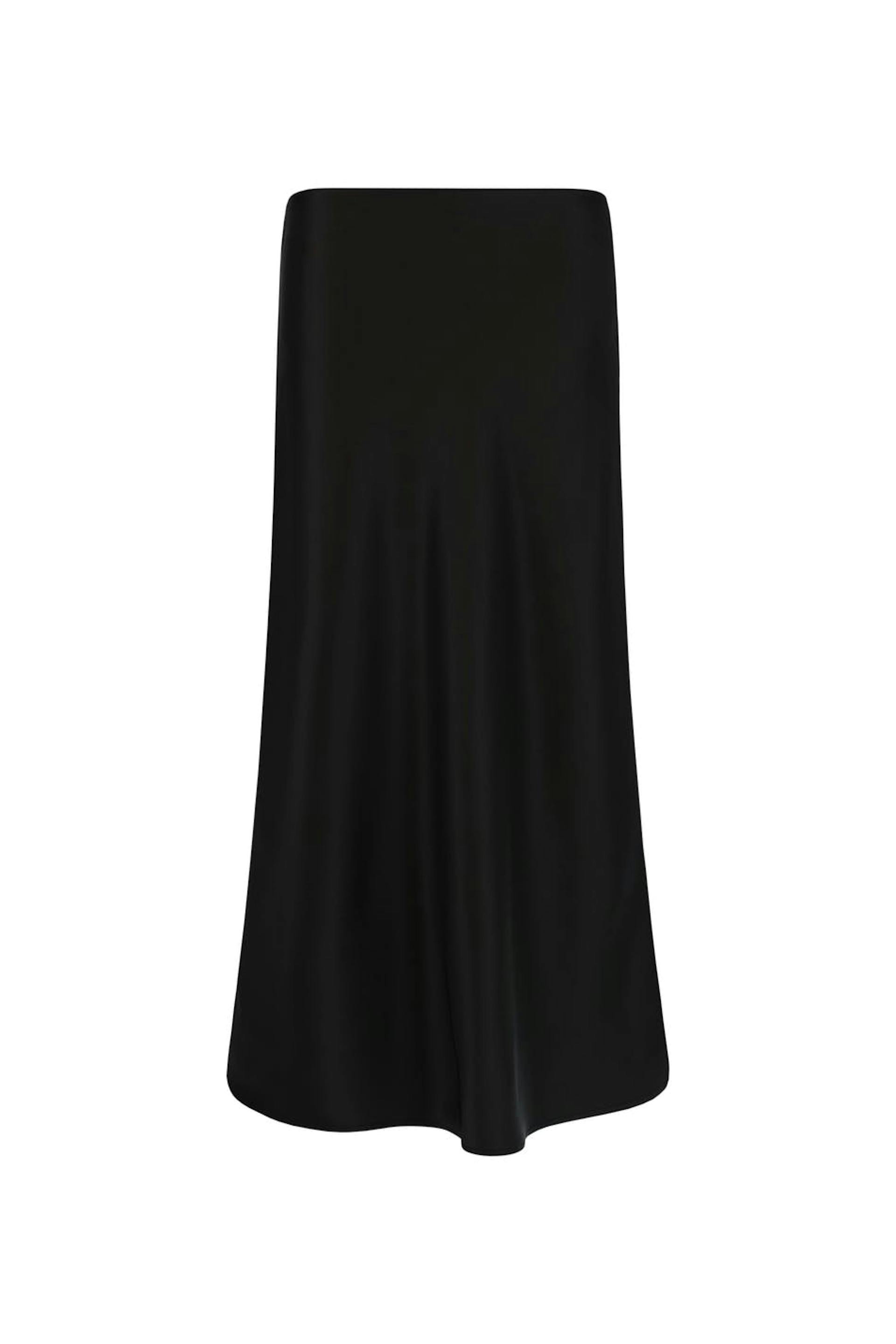 Satin skirt with elastic at the waist. The skirt is black and has a soft, shiny quality.