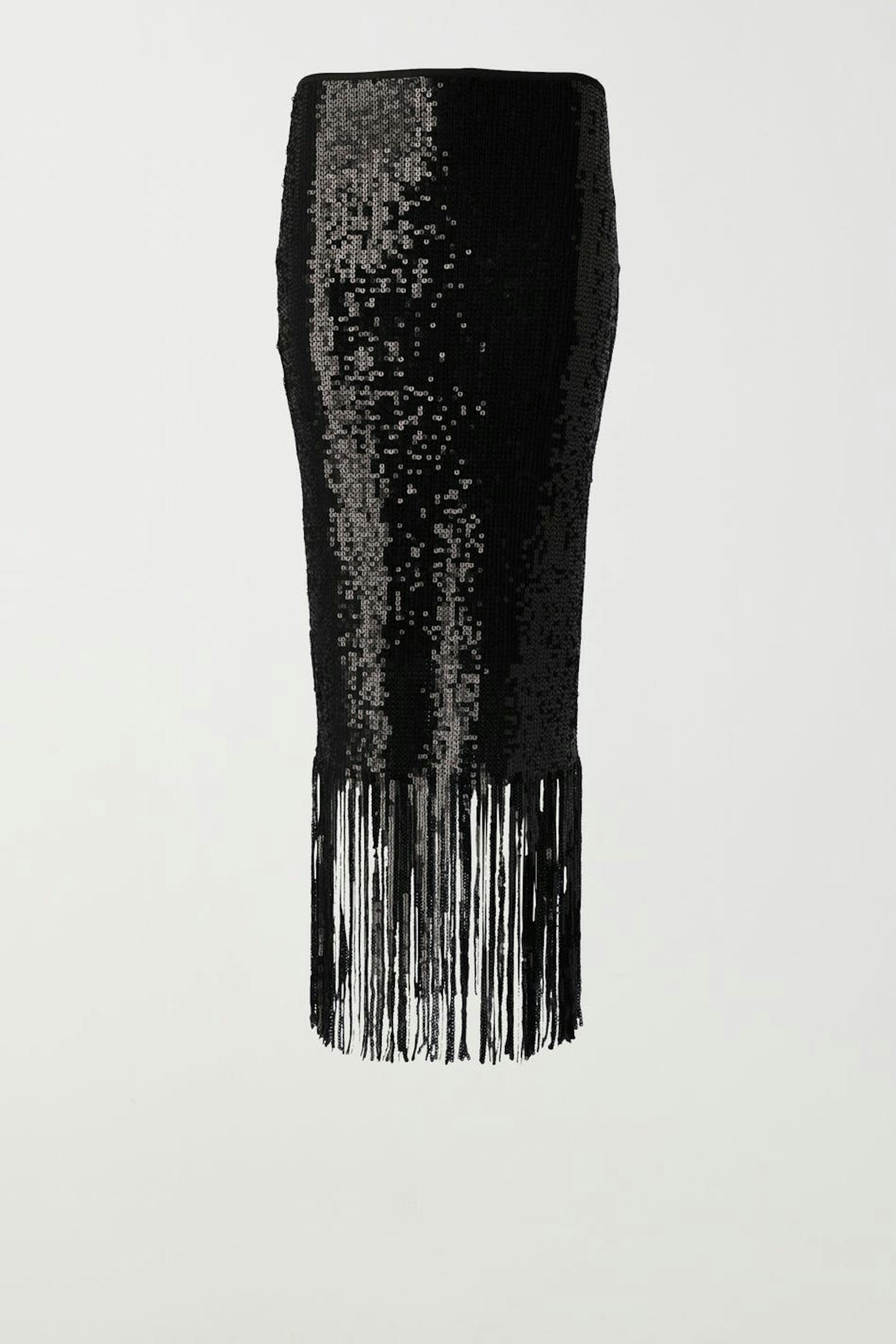 Sequin skirt with fringes at the bottom. The skirt is black and has stretchy quality. It has slit at the back and zip in the side seam.
