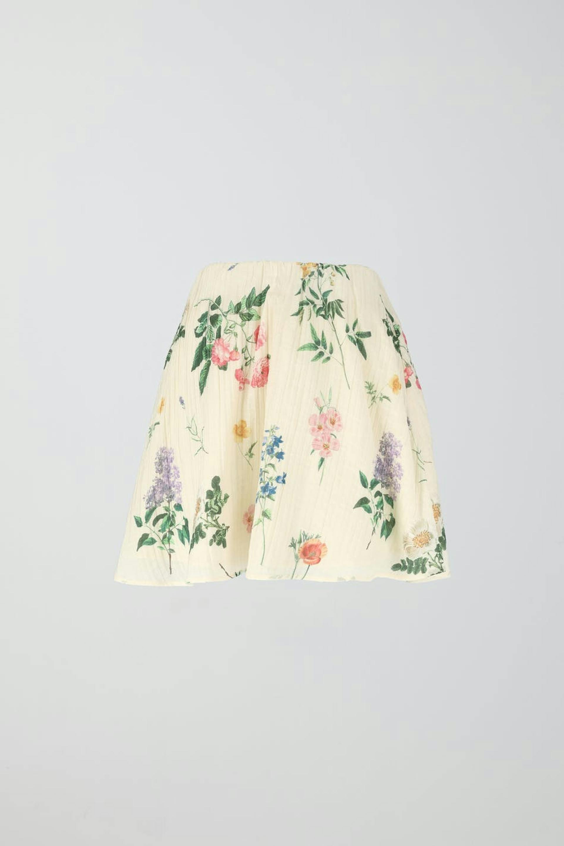 Midi skirt with loose fit. The skirt is beige and has a structured, wrinkled fabric. It has elastic at the waist.